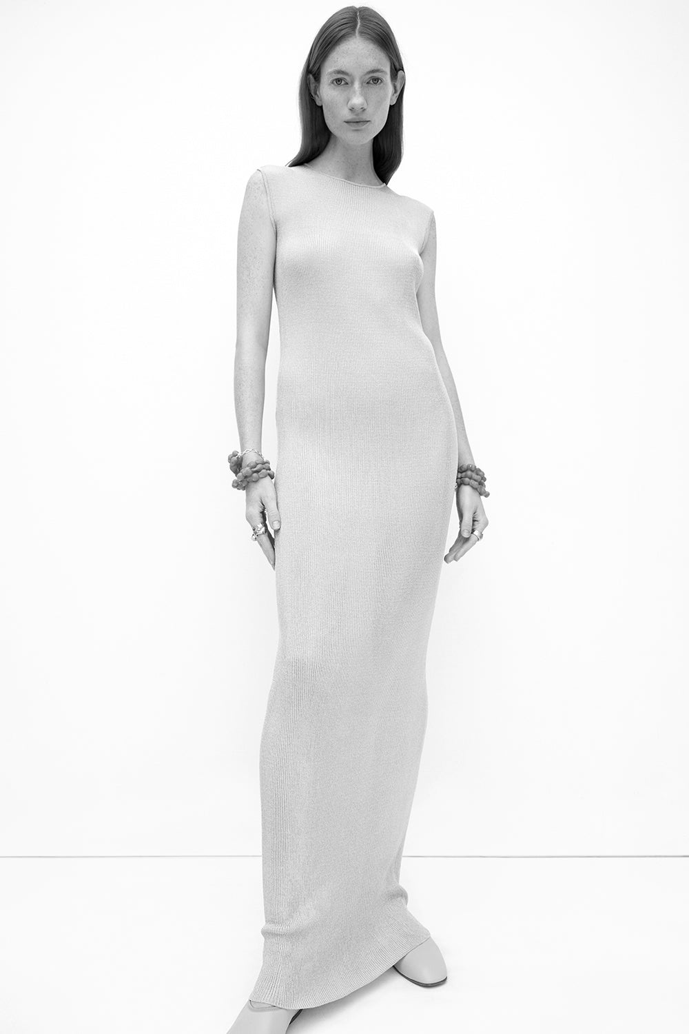 The Vero Knitted Dress in a beautiful lurex yarn, is an heirloom knitwear piece. The timeless sleeveless design is balanced besides the lustre to create a modern statement piece to wear through from summer to fall.