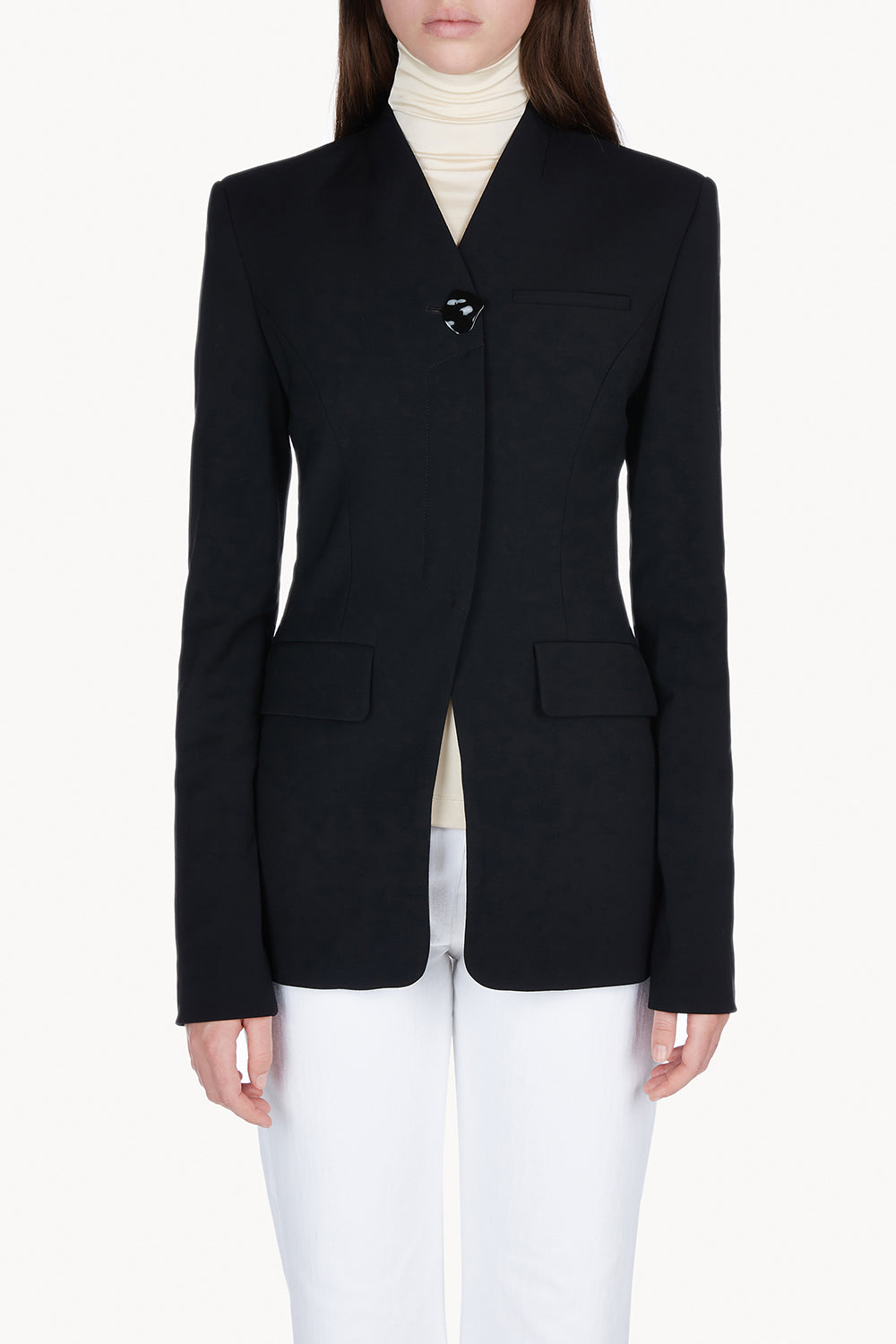 The Selena Jacket is crafted in a beautifully Italian viscose wool blend. Its refined clean lines reflect a more modern approach to tailoring. Impeccably cut to create a lean silhouette, this fitted jacket is finished with front pockets and a beautiful organic black signature button.