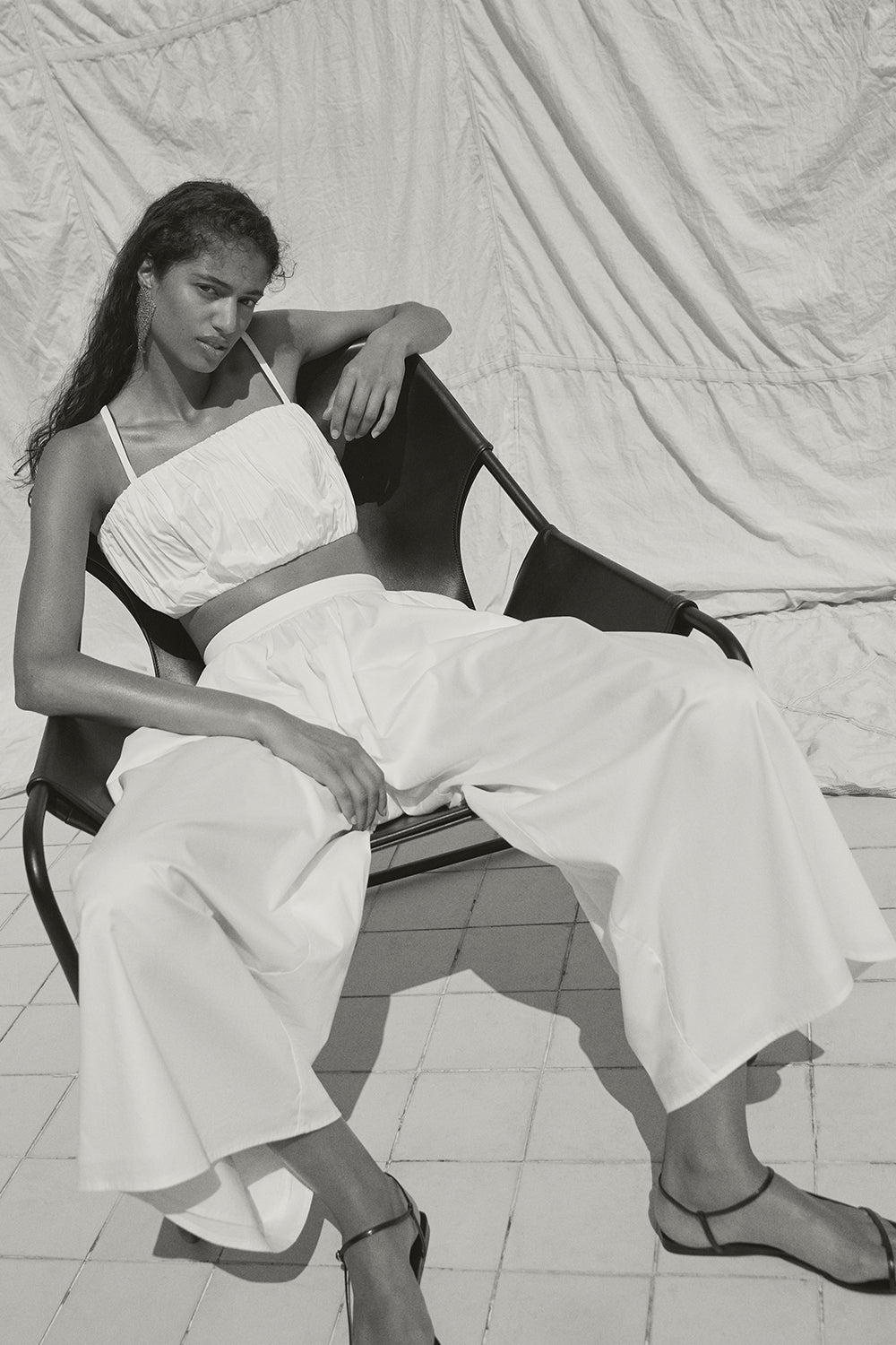 Our Gigi Bralette is made from 100% Organic Cotton . A structured fit combined with a stretch, crisp cotton, ensure the perfect fit. The Gigi Bralette features the signature gathered detailing across the bust that is echoed throughout the collection. The longline silhouette ensures a demure reveal across the body when worn back with our high waisted Deen Trouser.