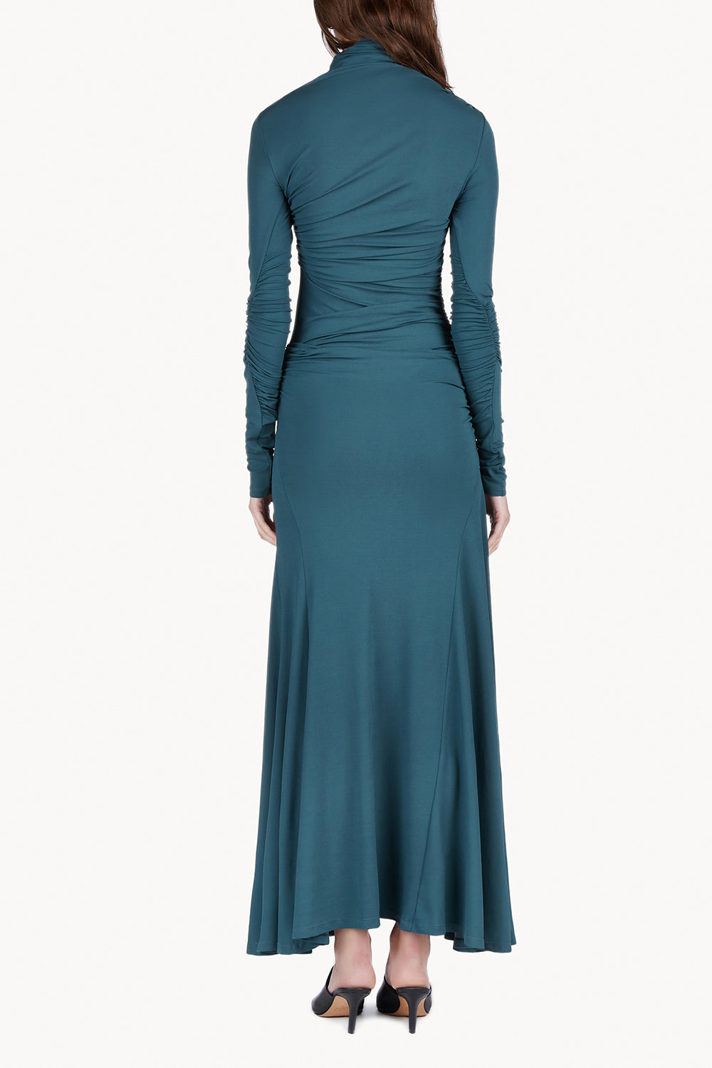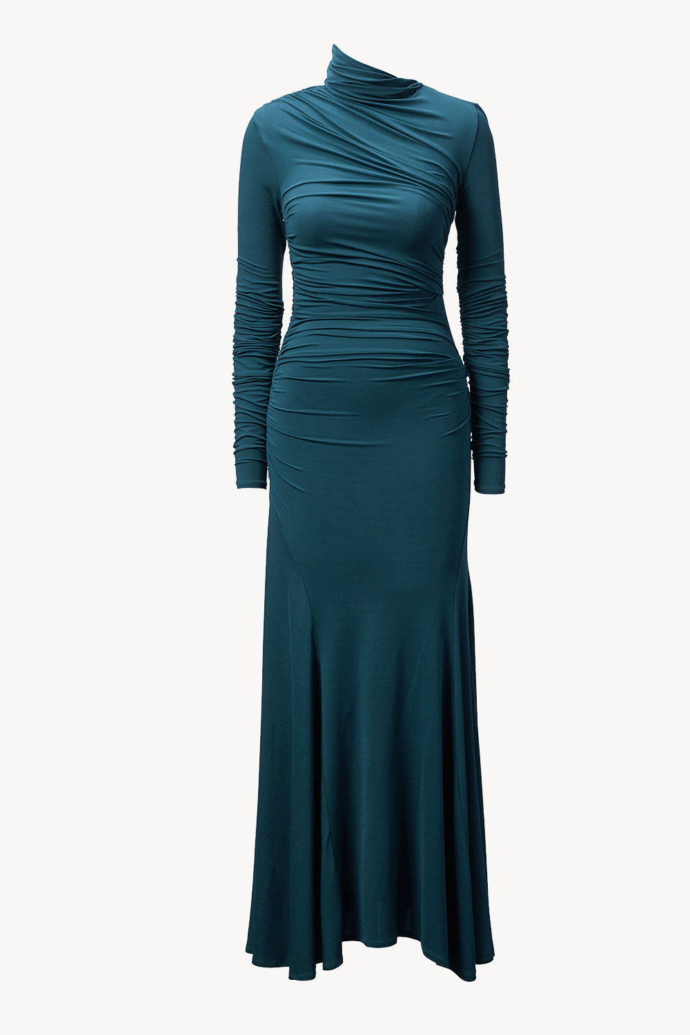 The Africa Dress with its delicate asymmetric gathered detailing is a modern elegant day to evening dress. With long slim sleeves and a high neck, this clean silhouette skims the body to finish with a fuller, fluid hemline. Crafted in sustainable Italian crepe viscose jersey with beautiful weight and drape. The Africa Dress is a timeless day to evening piece for the new Fall season.