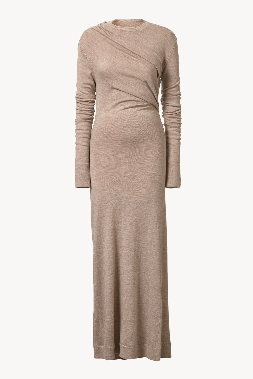 The Alice Dress is a relaxed winter knitted day dress. Made in 100% soft merino wool, the Alice Dress has a beautiful drape detail that is finished at the side seam by a delicate ruched detail. Flattering and luxuriously soft in a warm oat hue, this dress is a timeless wardrobe essential.
