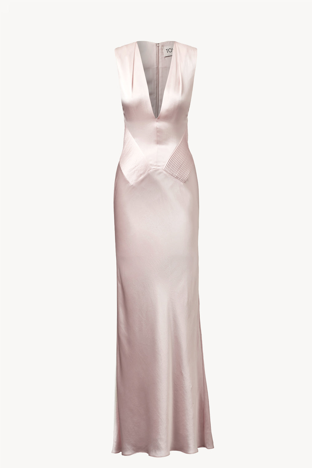 The Alix Dress Pale Pink is crafted from a fluid, luxurious silk satin. Thoughtfully designed with a bias-cut and features delicate pin tuck detailing at the waist. A classic floor length gown with a deep plunge neckline, the Alix Dress is secured by an invisible centre-back zip. A refined evening wear piece to wear for many seasons to come.
