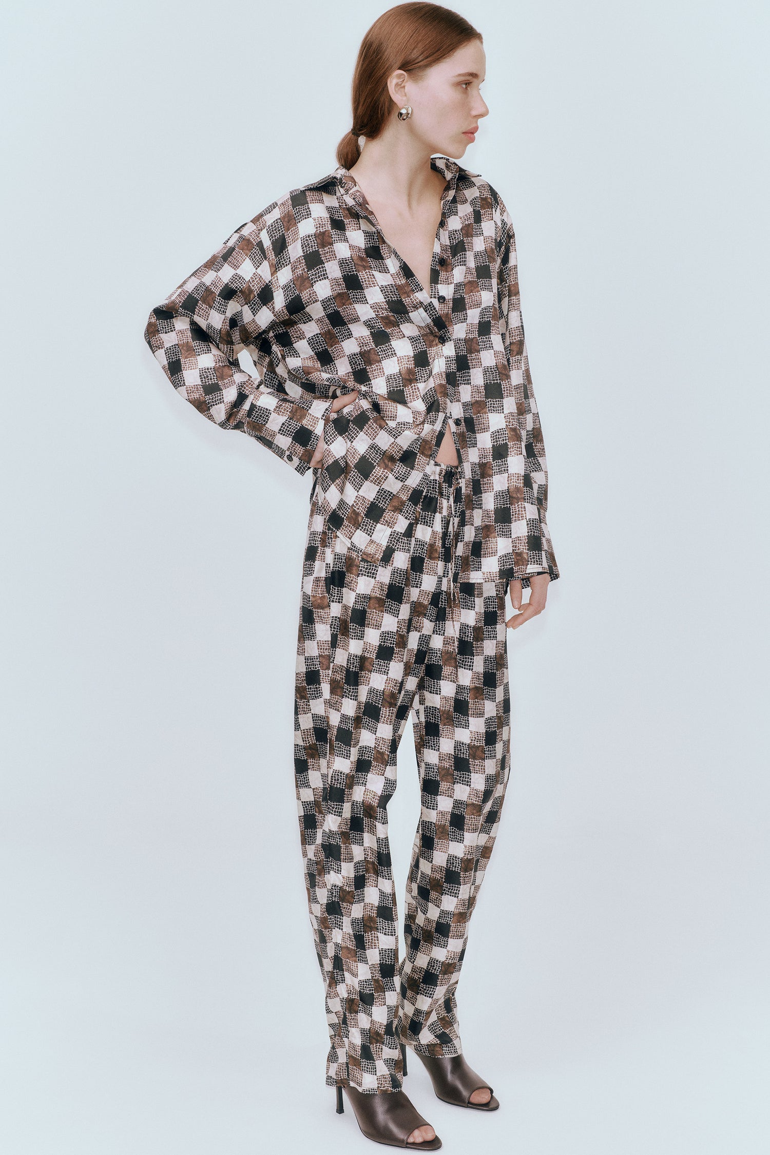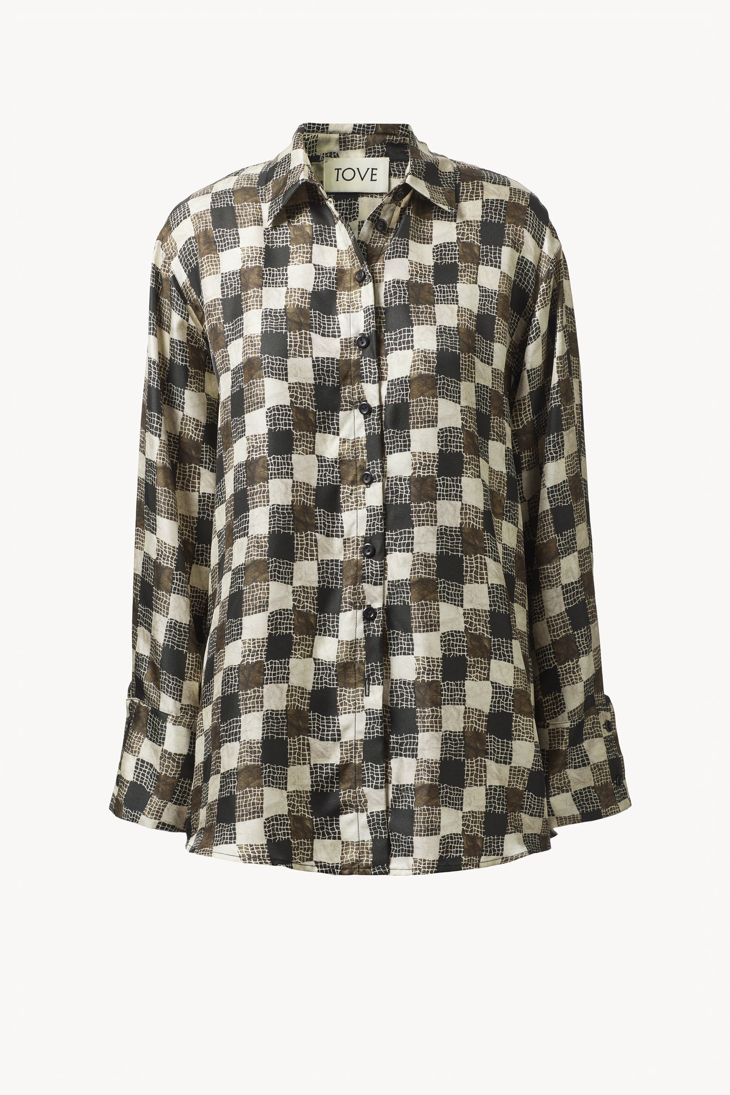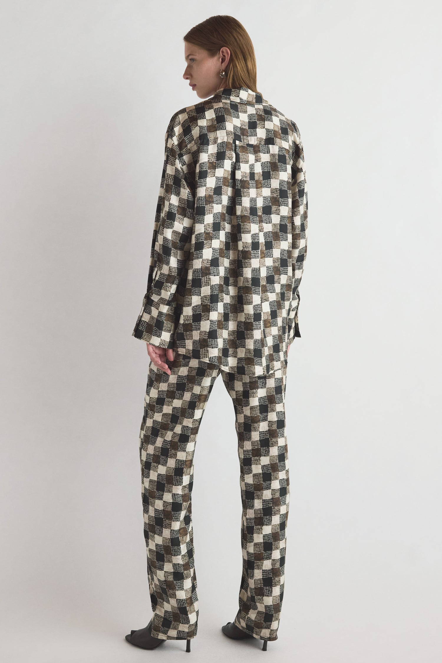 The Amal Shirt is elevated in a textured check print silk, bringing lightness and subtle dimension to its oversized silhouette. This button-through, long-sleeved style blends ease with refinement, offering a modern take on a wardrobe classic.