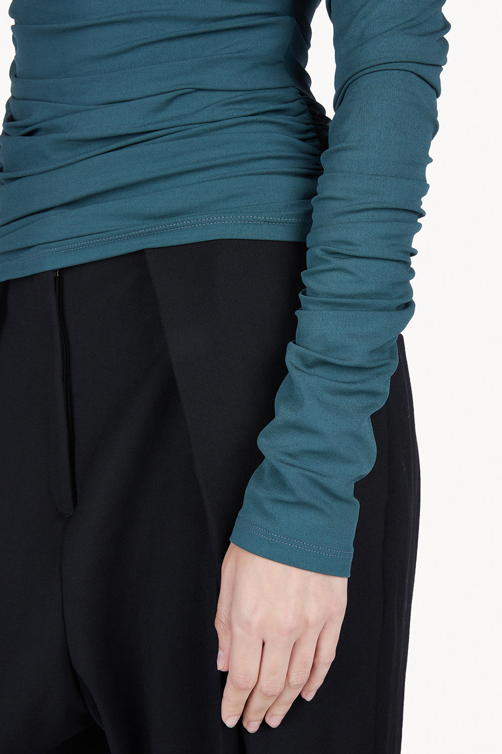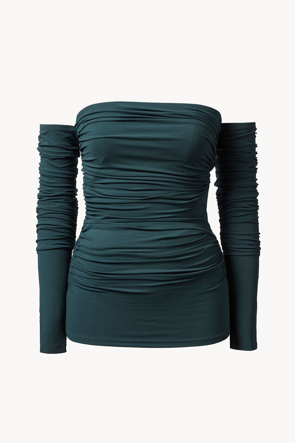 The Amara Top is the perfect day to evening piece. Featuring delicate gathers at the side seams and along its long slim sleeves and finished with a bare shoulder design. The Amara Top is an understated piece to complete an elevated, refined look.
