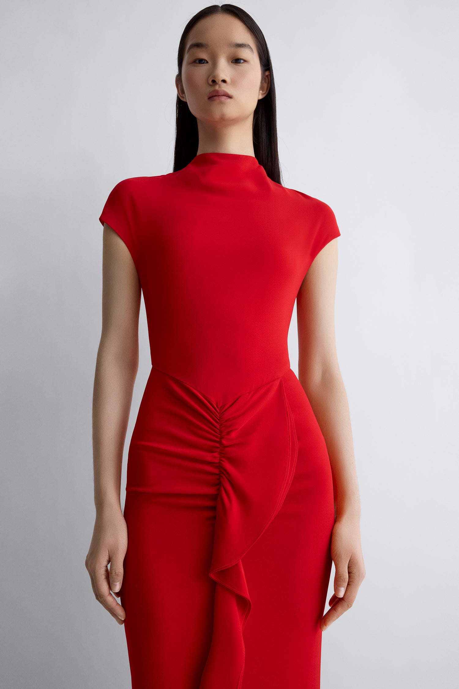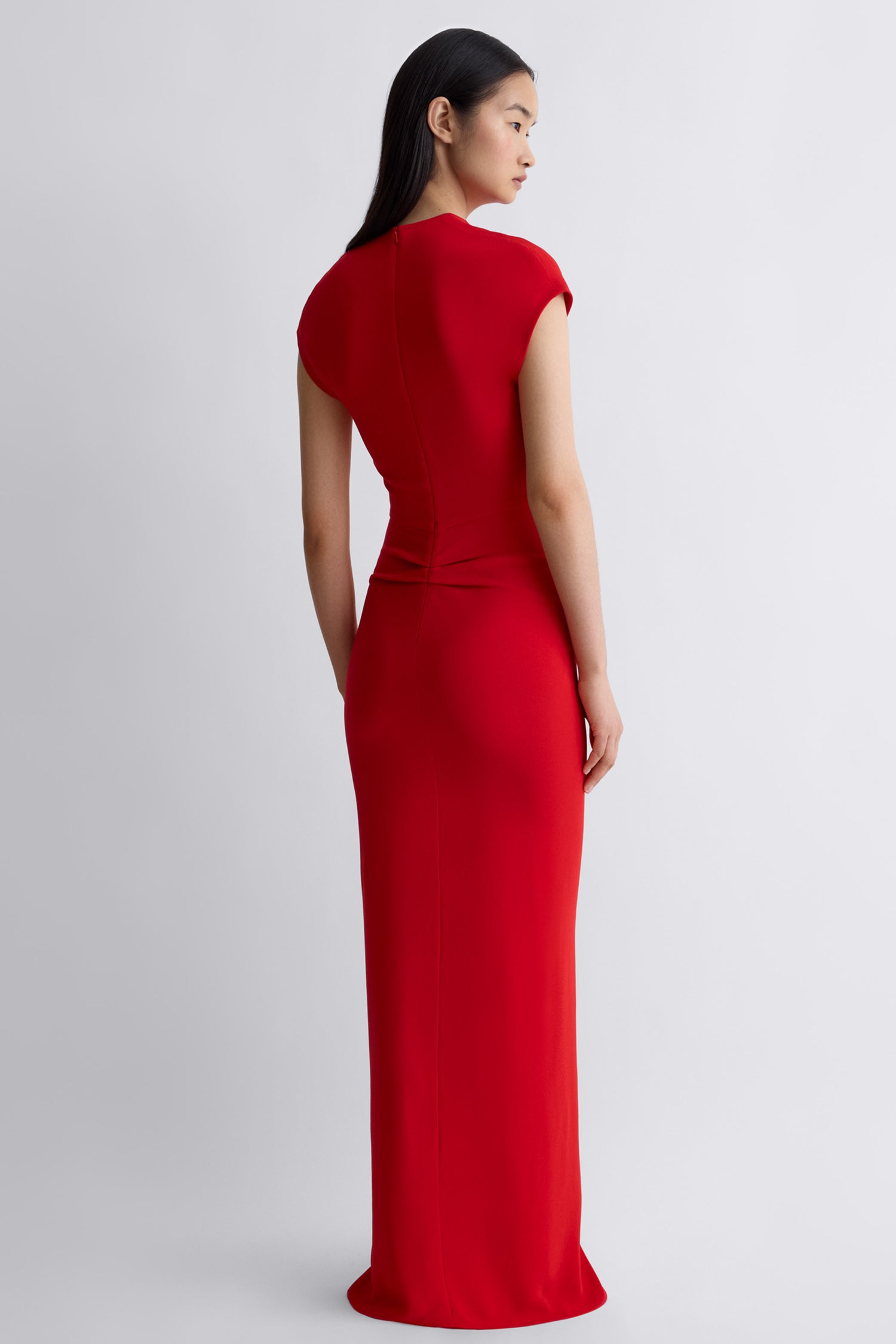 The Beth Dress in Red is a refined expression of modern minimalism, creating beautiful movement with every step. Crafted from a luxurious viscose blend, the soft yet structured fabric drapes with fluid elegance, forming artful folds that fall effortlessly to the hem. Designed with a subtle split neckline and delicate grown-on sleeves, the Beth Dress is finished with a concealed zip for a clean, uninterrupted line.