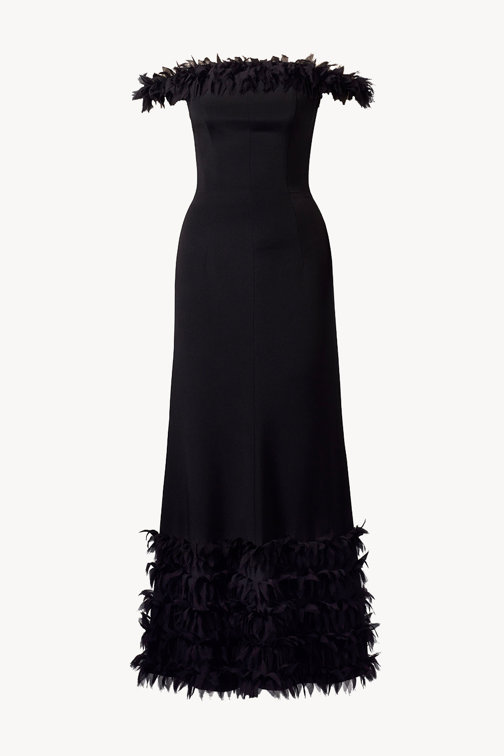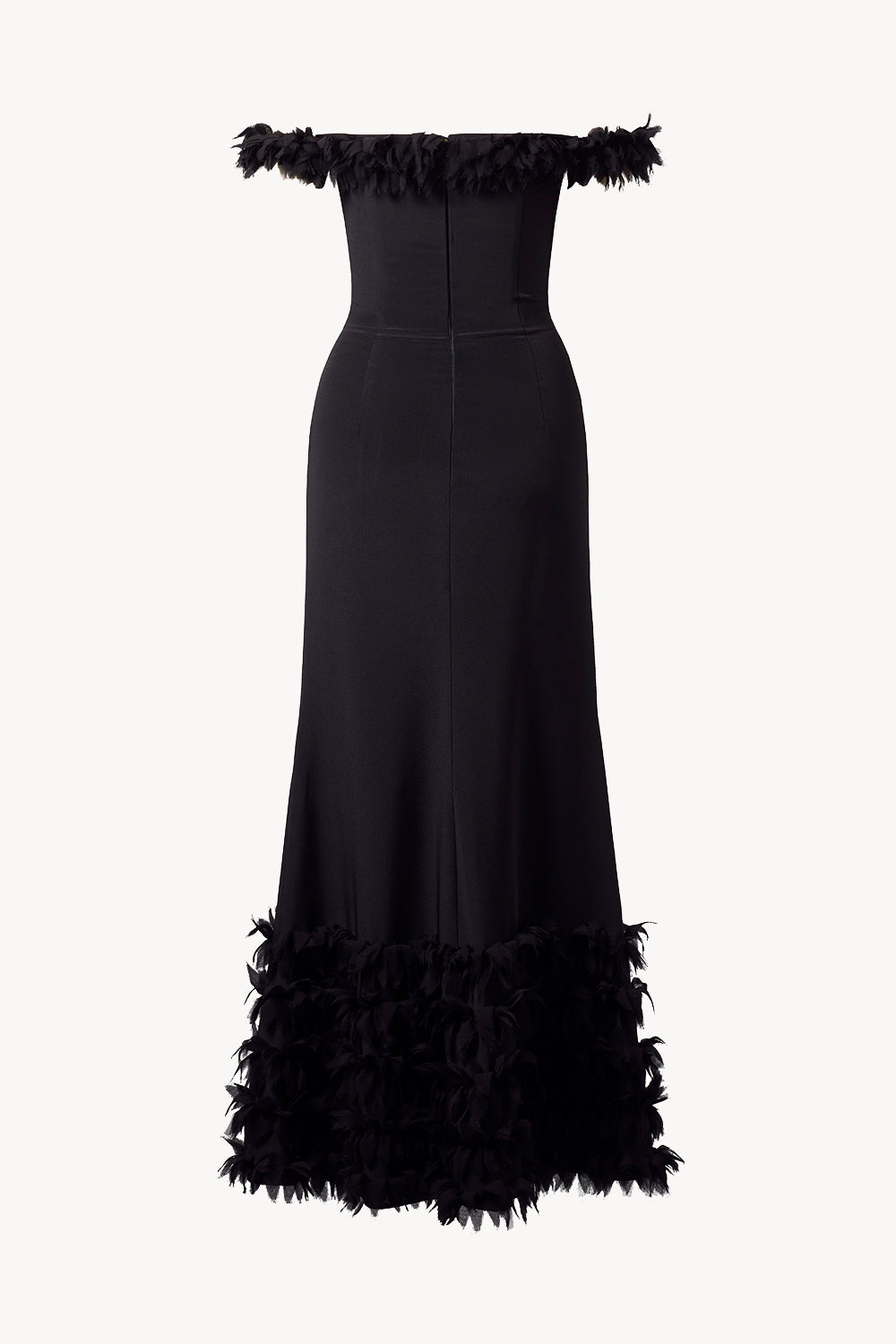 Crafted in 100% silk crepe, the Bodhi dress is the ultimate occasion dress. This elegant off the shoulder dress features delicate hand cut chiffon “feathers” along the hemline of the skirt and the neckline. An heirloom piece, this is a timeless, forever dress.