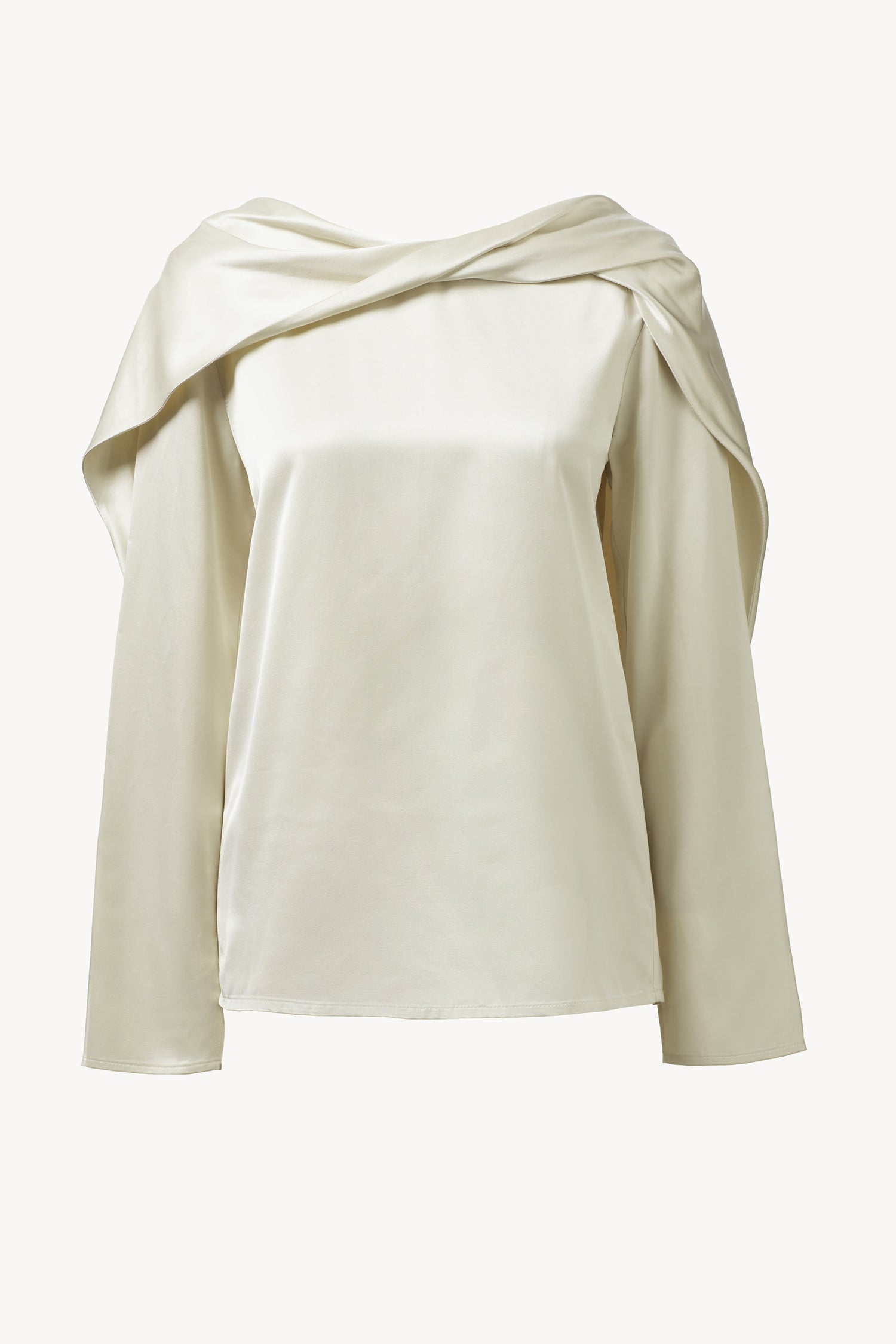 Structure and fluidity in balance. Crafted from a fluid viscose with a subtle sheen, the Caris Top Cream gently twists and folds with a sash detail at the neck that drapes across the shoulder. Split detailing at the cuffs enhances the sense of weightless movement, combining sculptural form with an effortless ease.