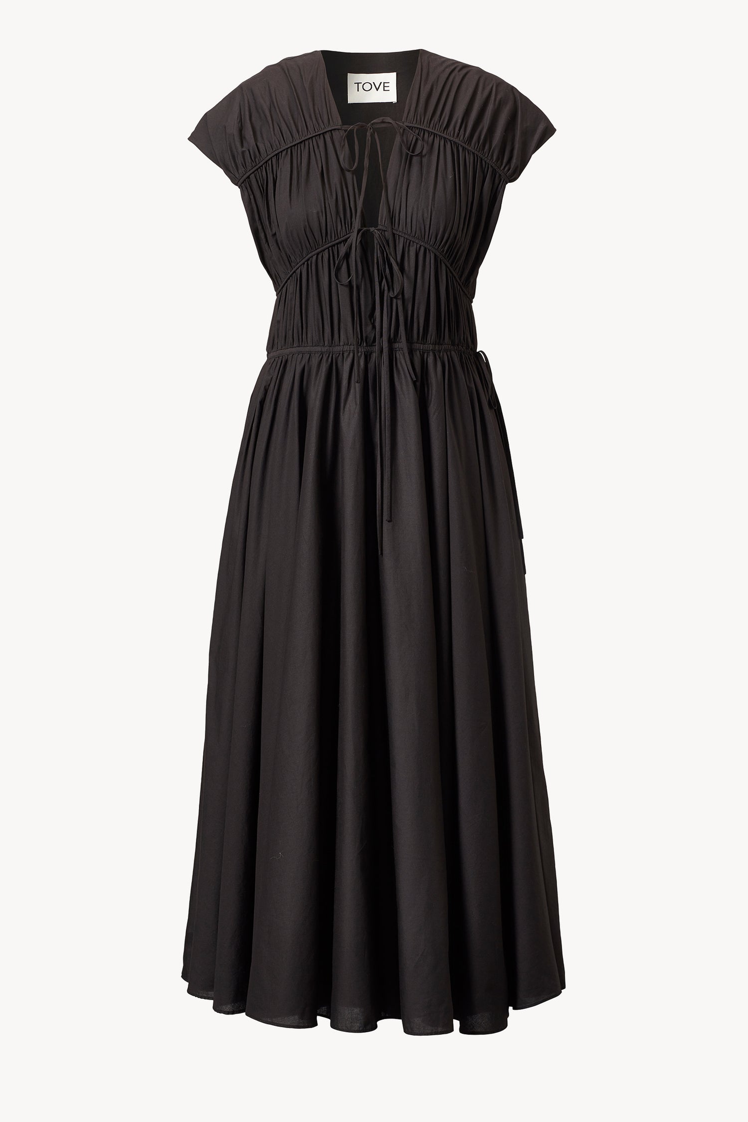 Our Ceres dress in black is crafted from 100% Organic Cotton and features a beautiful gathered detail throughout the bodice and low neckline. Delicate ties at the centre front and waist mean the dress can be adjusted to suit the wearer. A generously full circle skirt finishes off this versatile dress. As perfect for summer beach days as an evening occasion.
