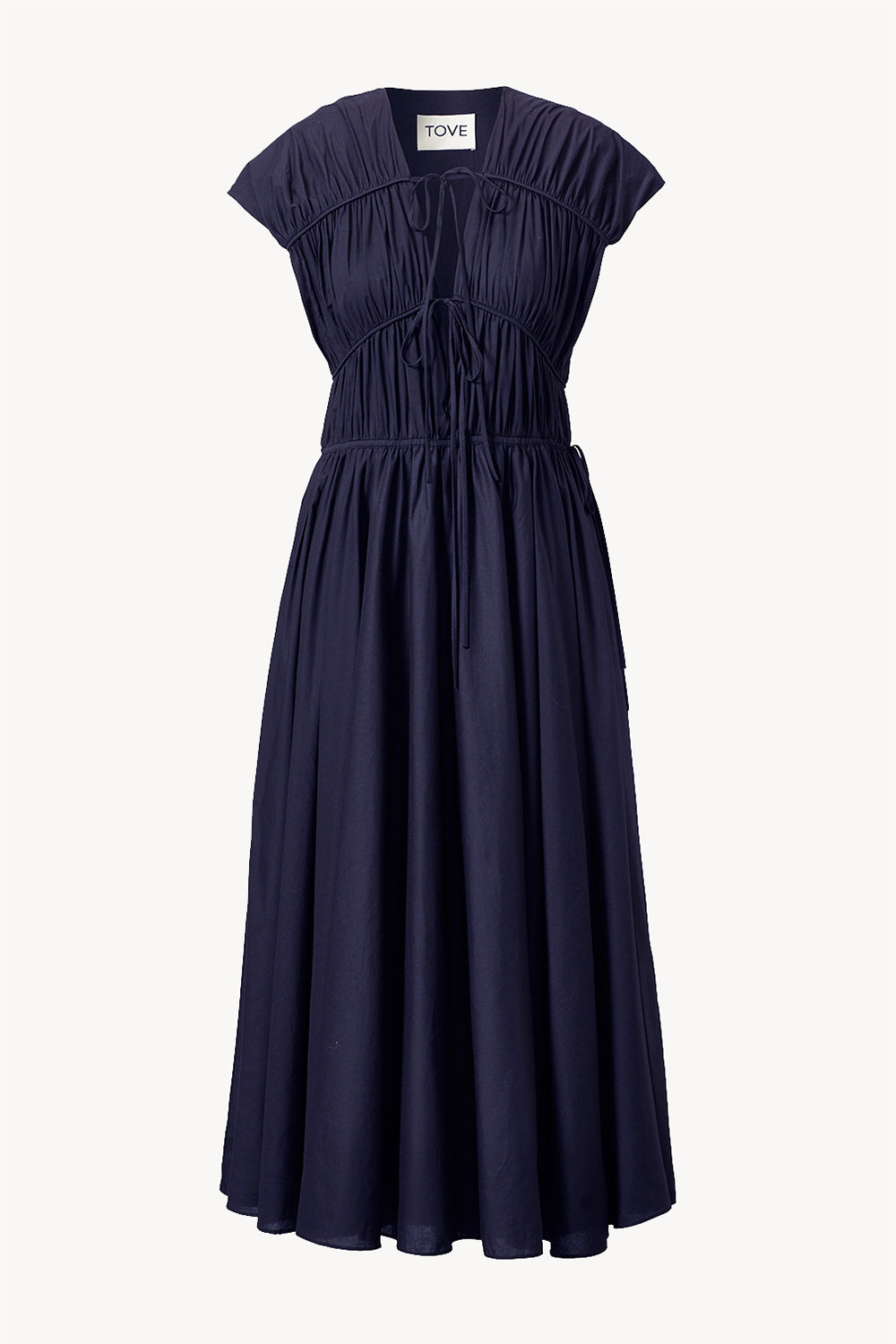 Our Ceres Dress in navy is crafted from 100% Organic Cotton and features a beautiful gathered detail throughout the bodice and low neckline. Delicate ties at the centre front and waist mean the dress can be adjusted to suit the wearer. A generously full circle skirt finishes off this versatile dress. As perfect for summer beach days as an evening occasion.