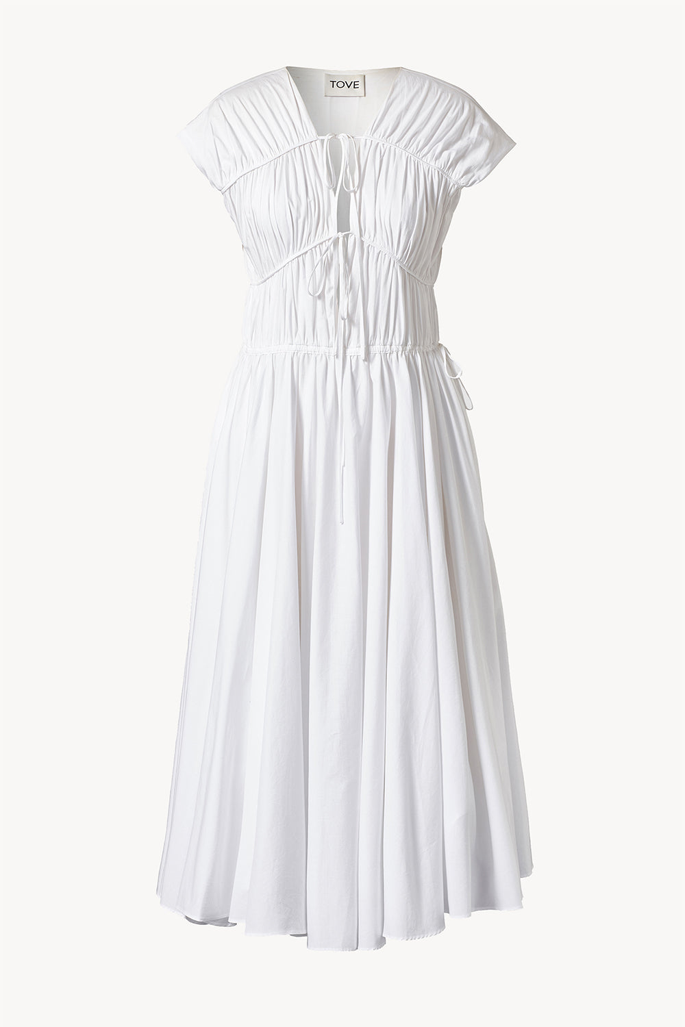 Our cotton Ceres dress is crafted from 100% Organic Cotton and features a beautiful gathered detail throughout the bodice and low neckline. Delicate ties at the centre front and waist mean the dress can be adjusted to suit the wearer. A generously full circle skirt finishes off this versatile dress. As perfect for summer beach days as an evening occasion.