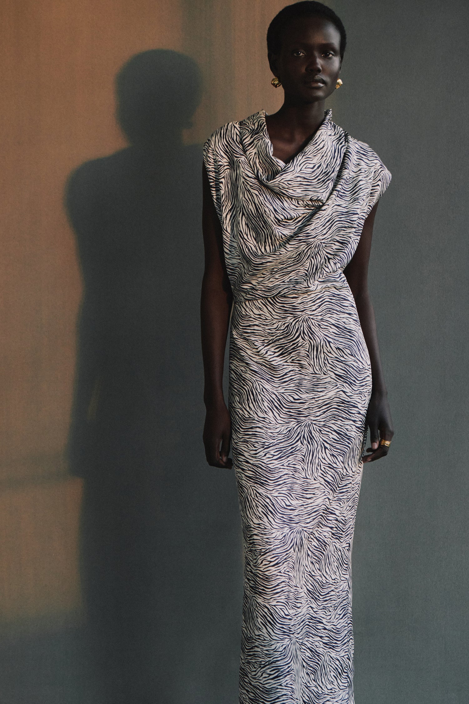 With its soft draped neckline, the Claris Dress is defined by by its column silhouette and considered pleat detailing. Crafted in a textural monochrome print, the Claris Dress is finished with a concealed zip at the centre back. Style with the Kenly Flat Mules for a refined and considered look.