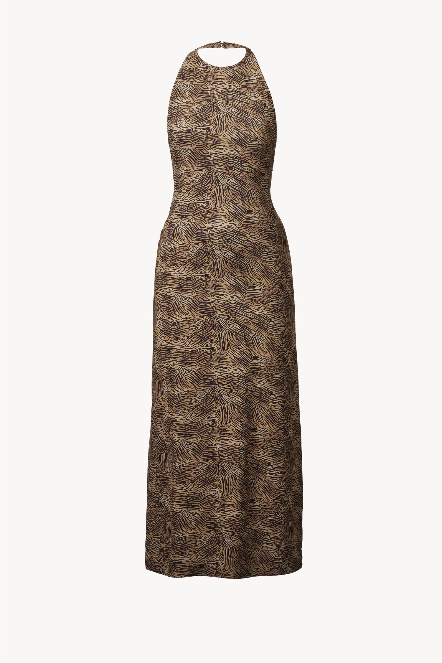 The Colette Dress features a sleek, fitted halterneck silhouette that flatters the body. Crafted in soft viscose with a bold zebra print, it offers modern, understated elegance.