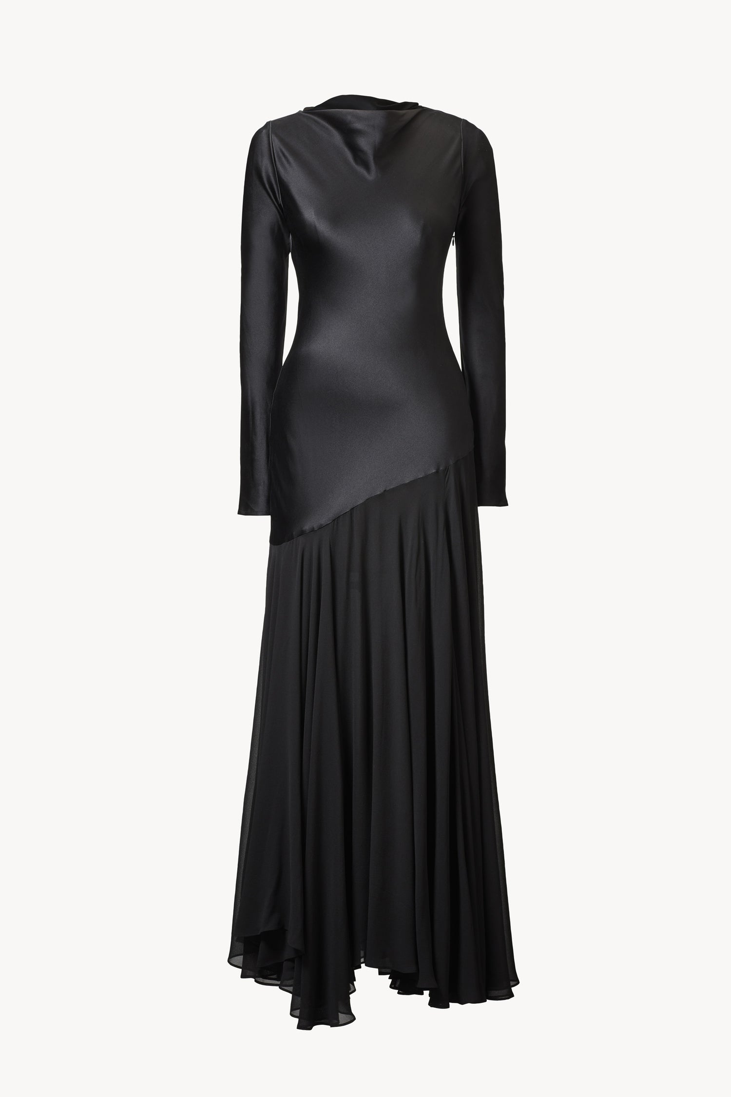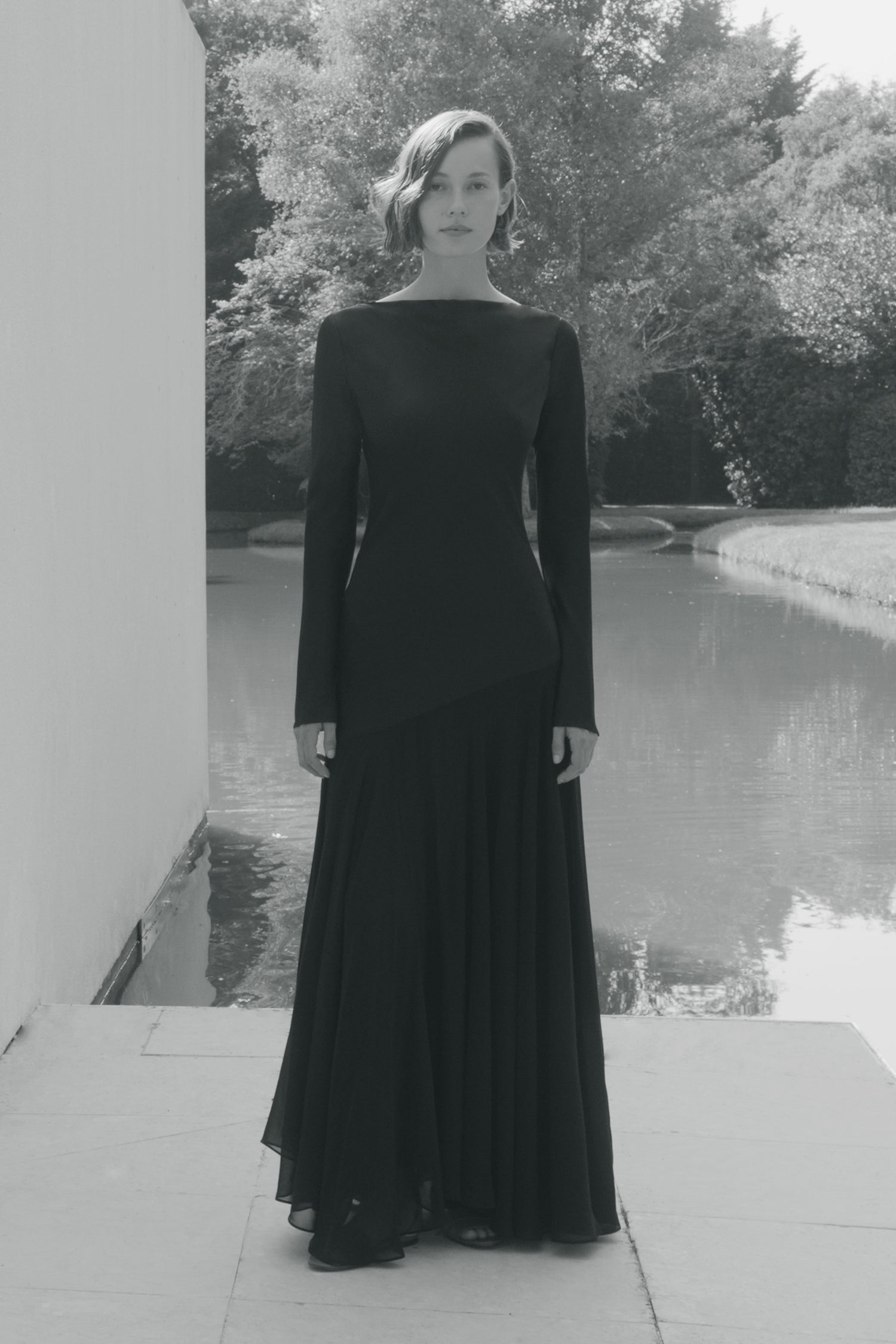 The long-sleeved Cordelia Dress is exquisitely crafted from pure silk. Designed with an elegant boatneck, the soft silk cascades dramatically from the waist, featuring swathes of silk satin and sheer silk chiffon to finish at floor length. Secured with an invisible zip and featuring thoughtful seamed details, the Cordelia Dress is a standout piece from the Resort 26 collection.