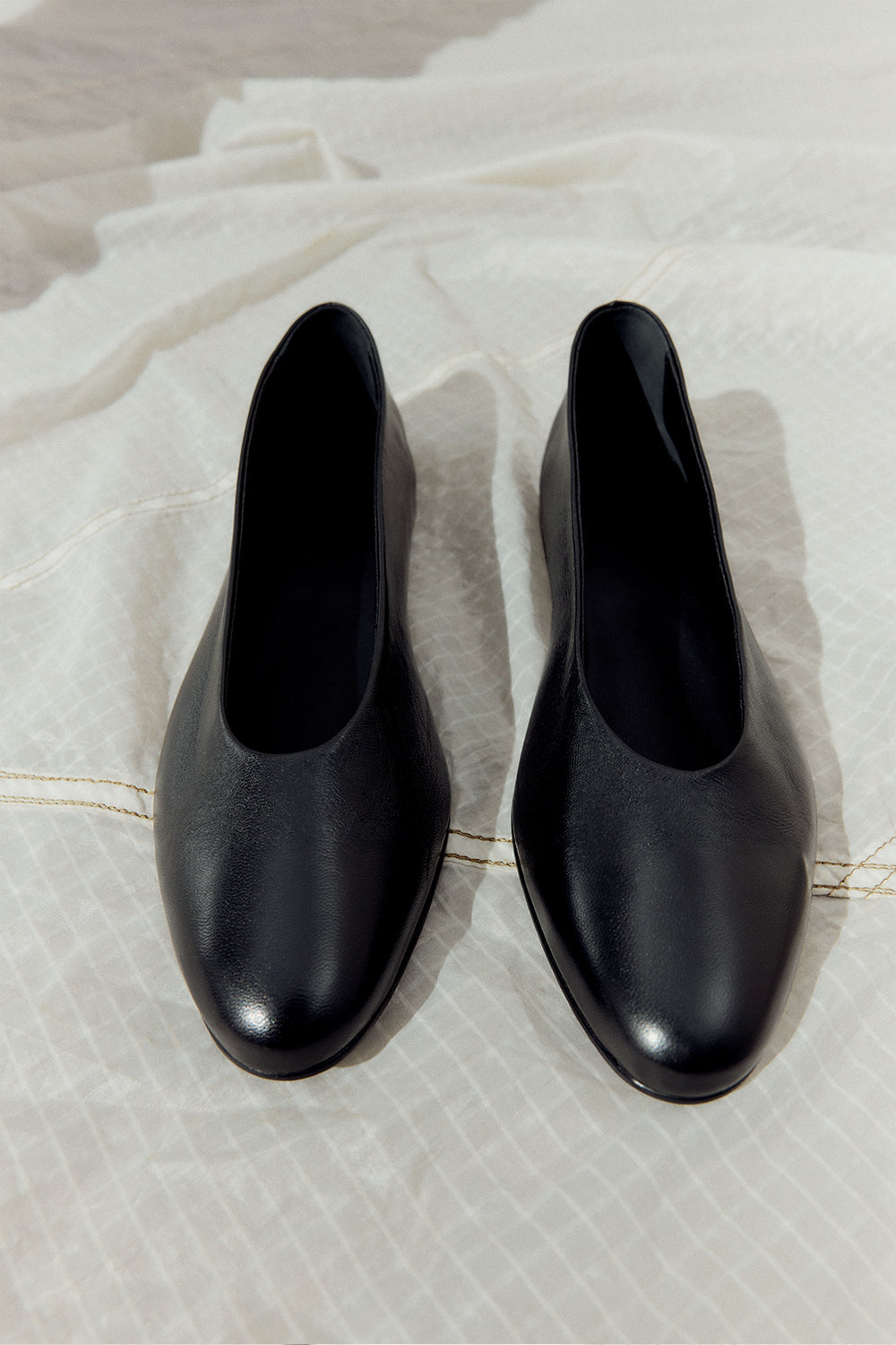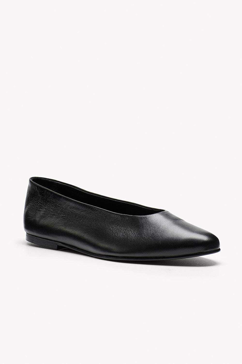 TOVE flats draw inspiration from the timeless ballerina pointe. With an almond toe and a considered low cut vamp, the Darcy Pump is crafted in the softest leather in Portugal . Wear with day through to evening looks.