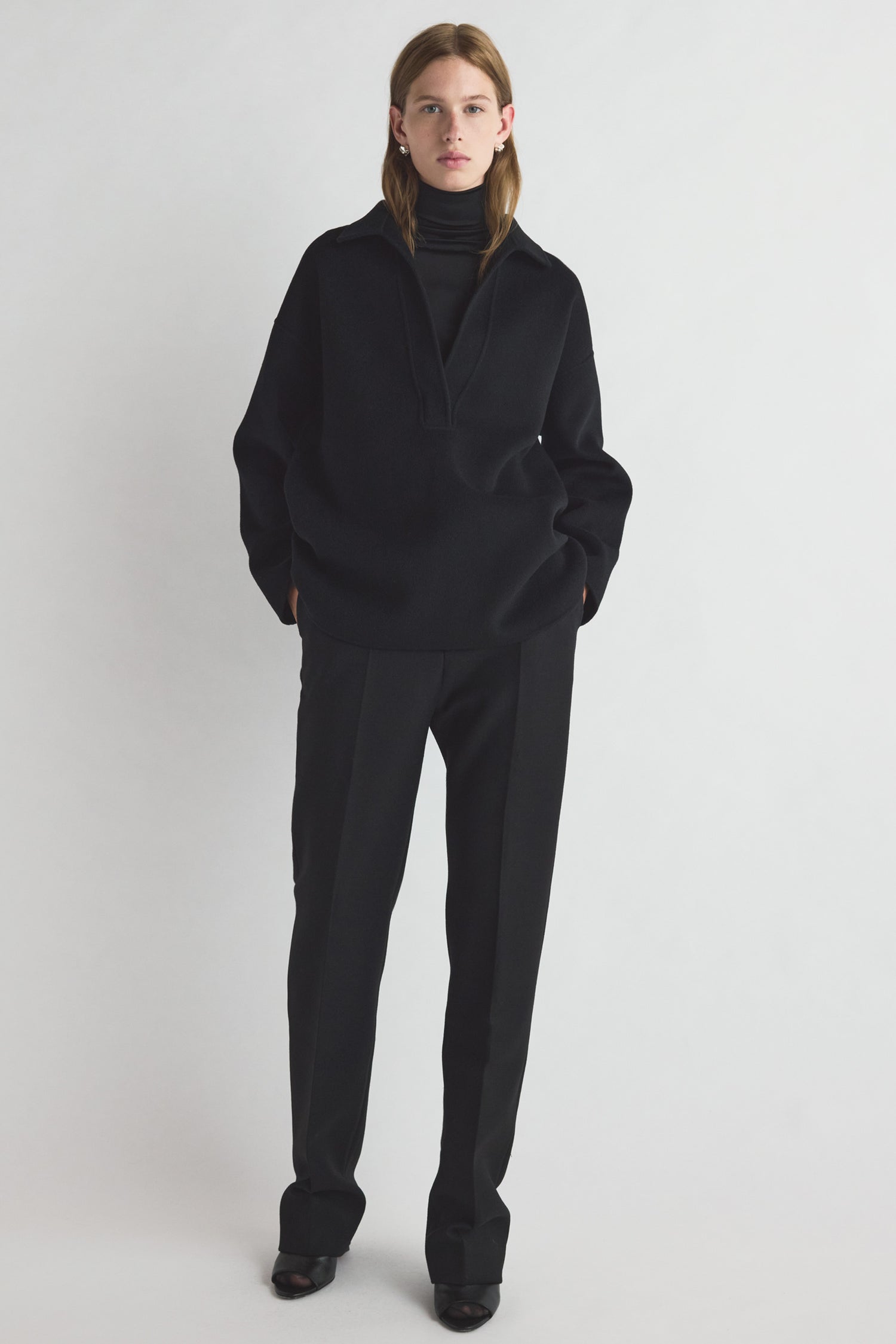 The Deryn Top is crafted from a luxurious wool and cashmere blend. It features a deep plunge neckline, long sleeves, and an easy, relaxed silhouette. Finished with a shirt style collar, the Deryn Top is an elegant, yet relaxed piece for evening dressing this winter.