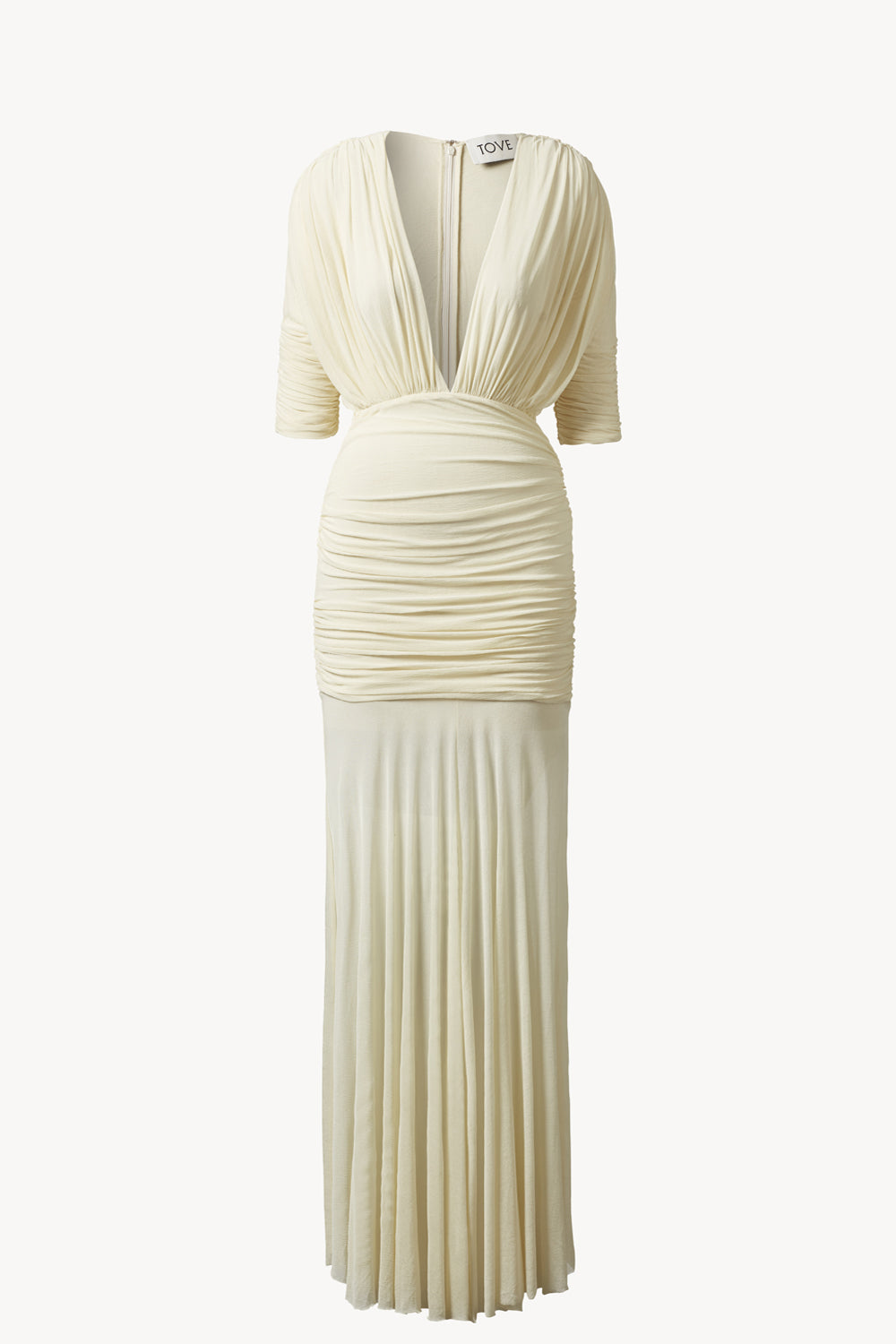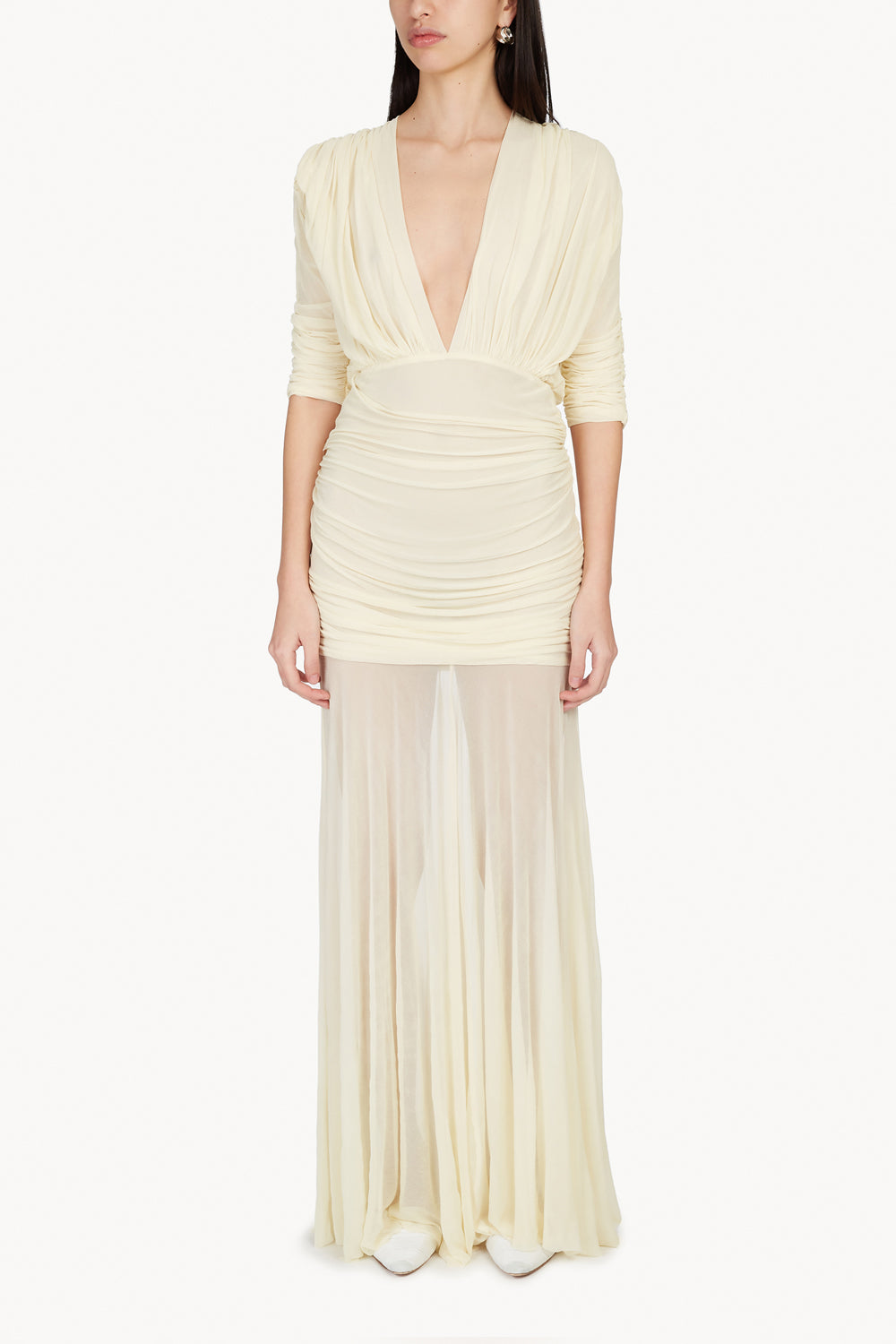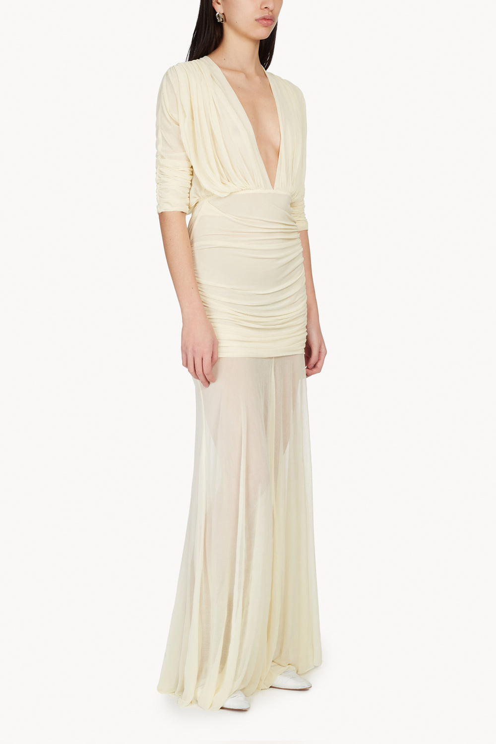The Devi Dress is meticulously gathered and layered to create a striking, overtly feminine silhouette. A dramatic interplay of translucency and opacity, the dress features a deep V-neckline and is crafted from lightweight, fluid viscose jersey. Gathered detailing at the arms, bodice, and waist enhances the design. Fastened by an invisible zip and finished with a translucent floor-length skirt panel. The Devi Dress is a statement dress to wear for many seasons to come.