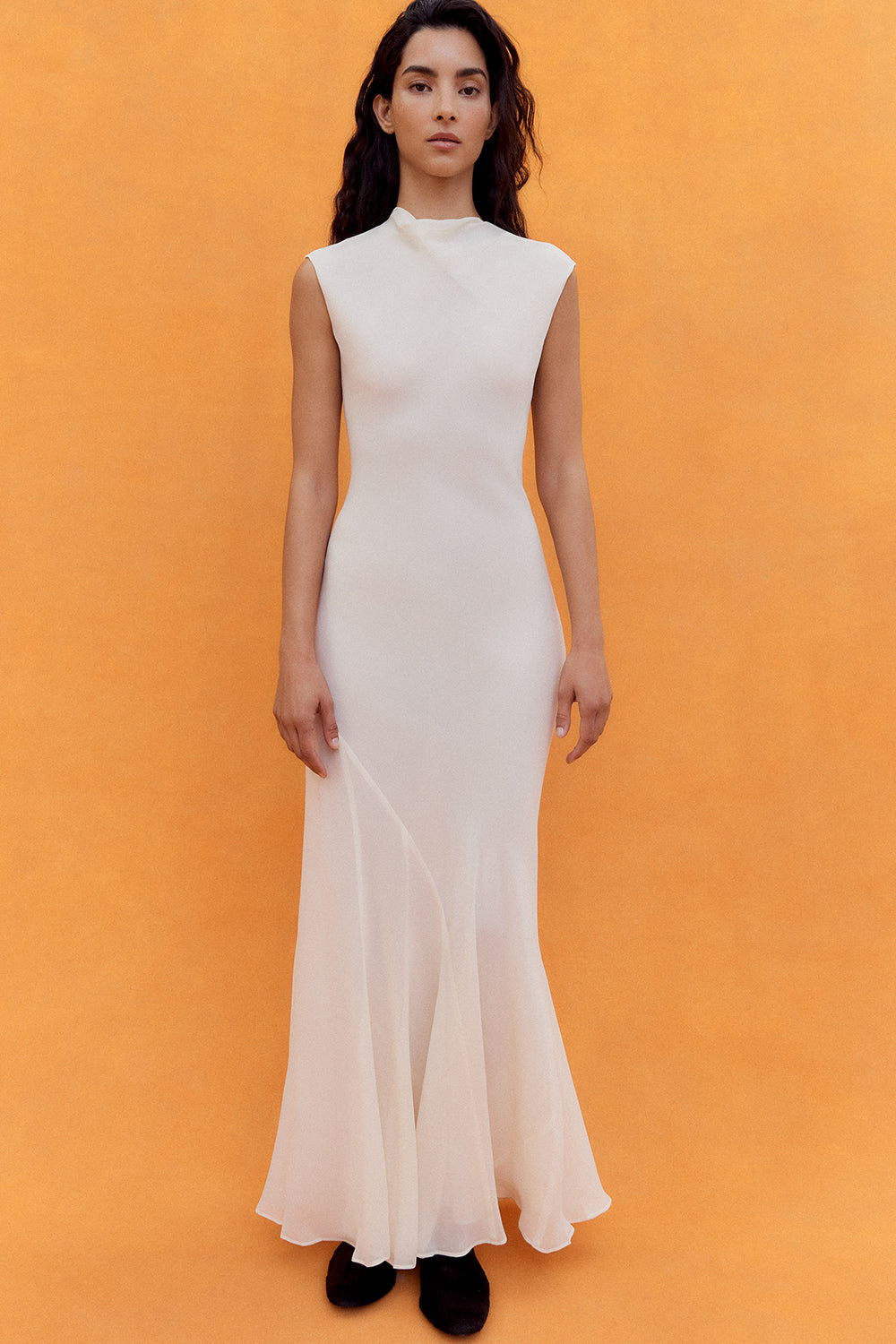 Bias cut for a considered fit, the Erin Dress is crafted in a delicate silk chiffon. With a draped cowl neckline detail and organic seamed detail along the skirt of the dress, the Erin Dress is secured by a centre back zip and is the perfect occasion piece.