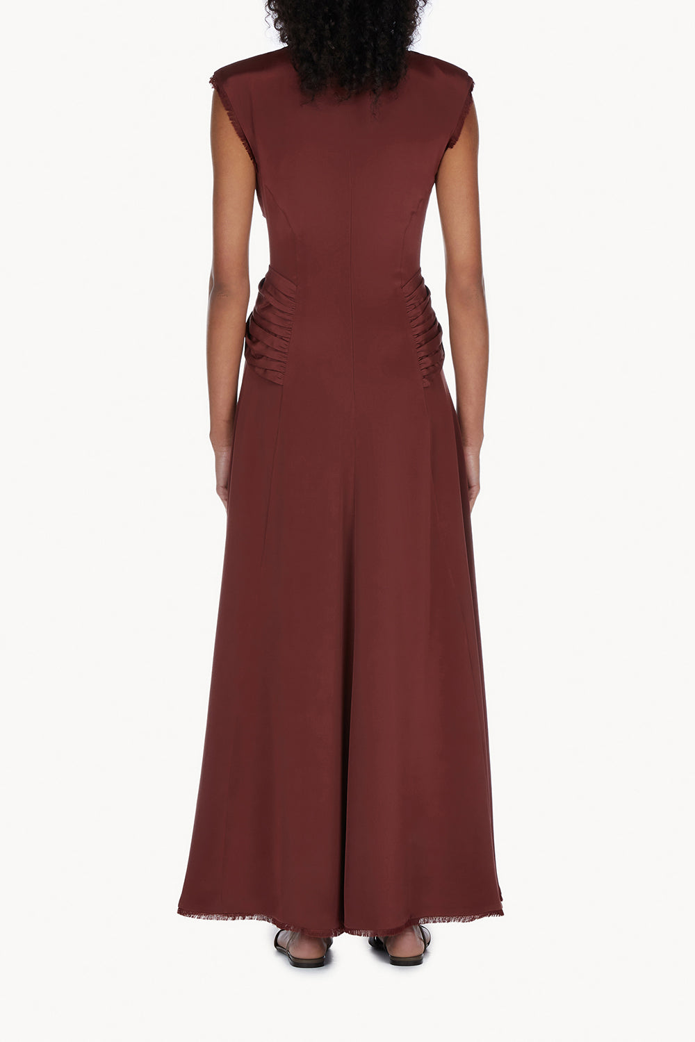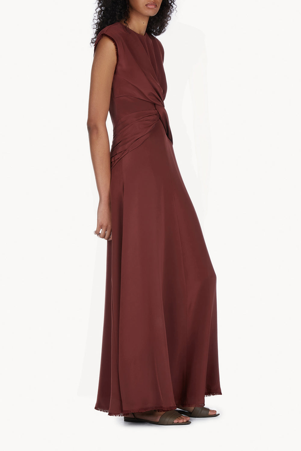 Crafted in a beautiful silk crepe de chine, the Indira Dress is a timeless evening dress. Featuring our signature twist detail at the centre front waist, the silk skims the body before falling to a fulle, fluid hemline. Finished with a delicate frayed detail along the hemline and at the sleeve, this is the perfect day to evening piece.