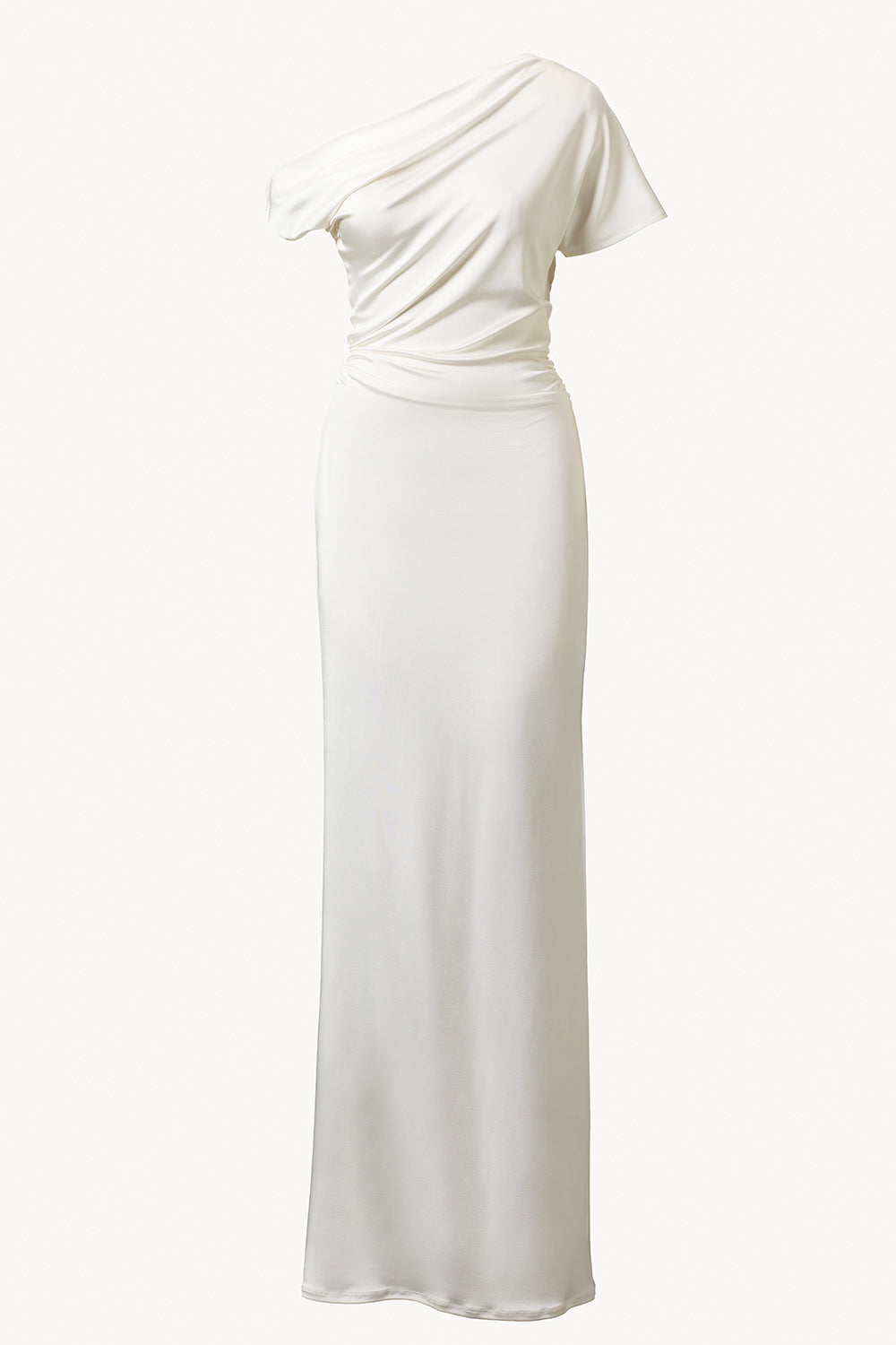 The Inez Dress features an asymmetrical off-the-shoulder neckline which drapes effortlessly to a delicate ruched detail at the side seams. Made from luxurious viscose jersey from our Italian mills, the Inez Dress is an elevated evening piece.