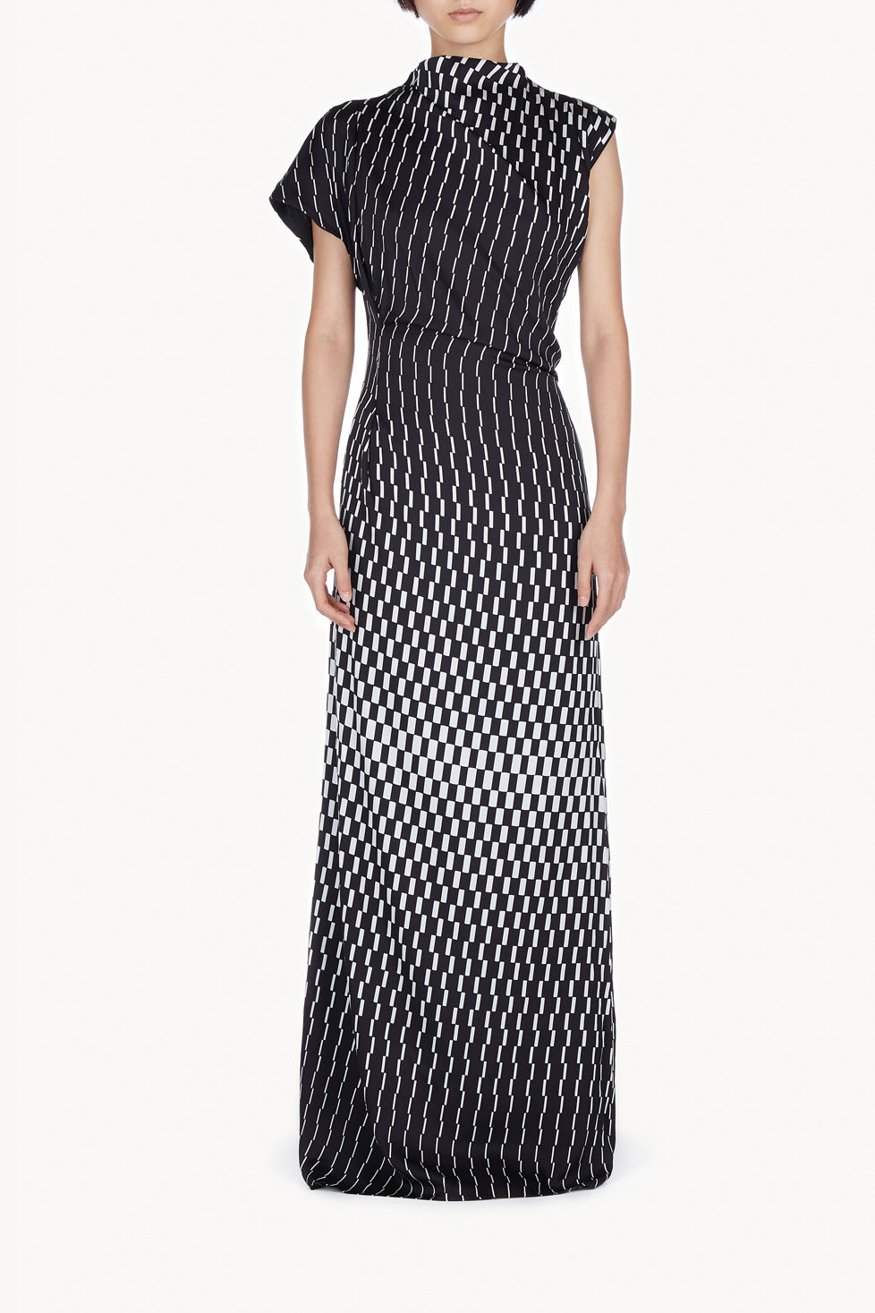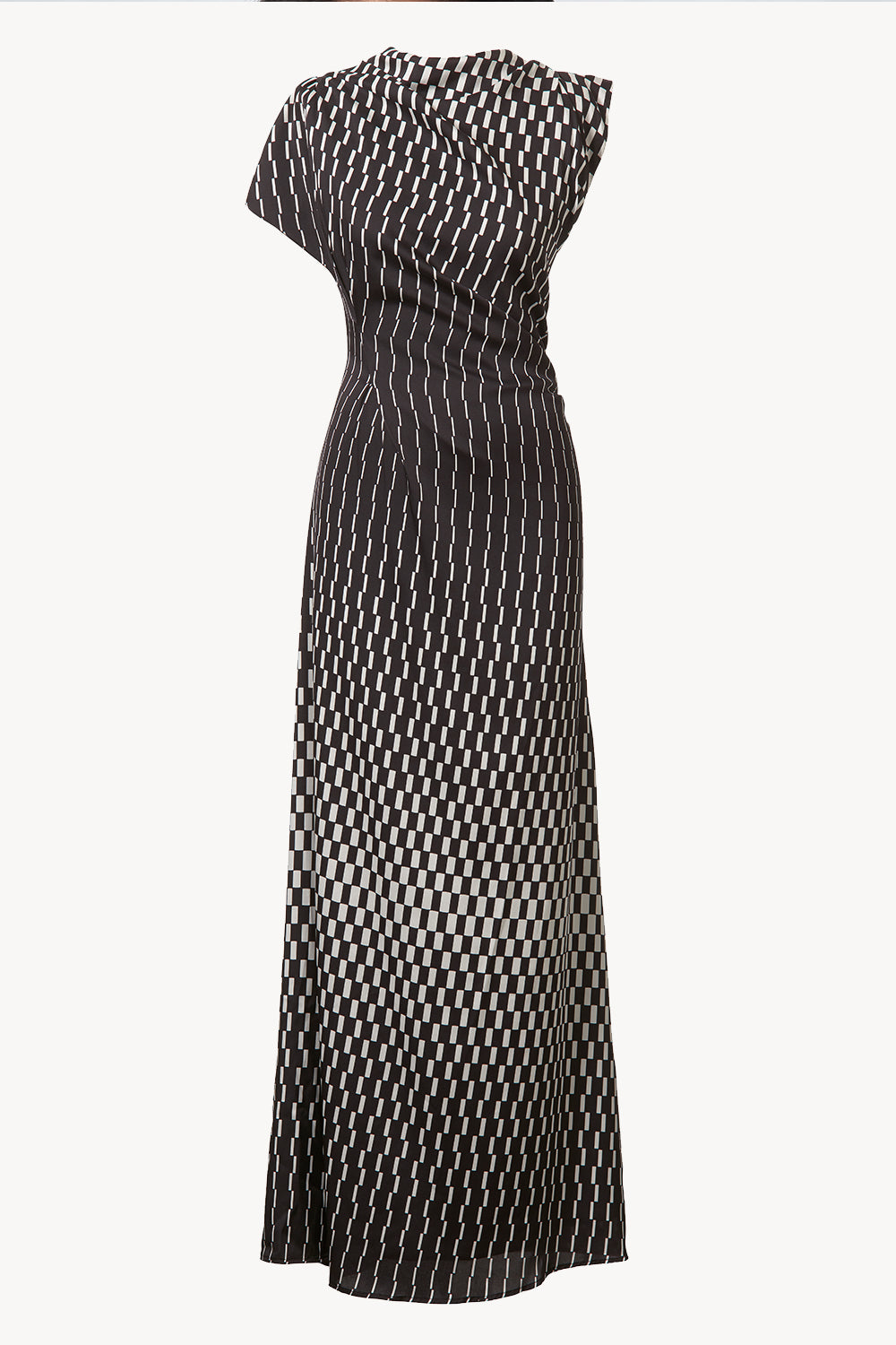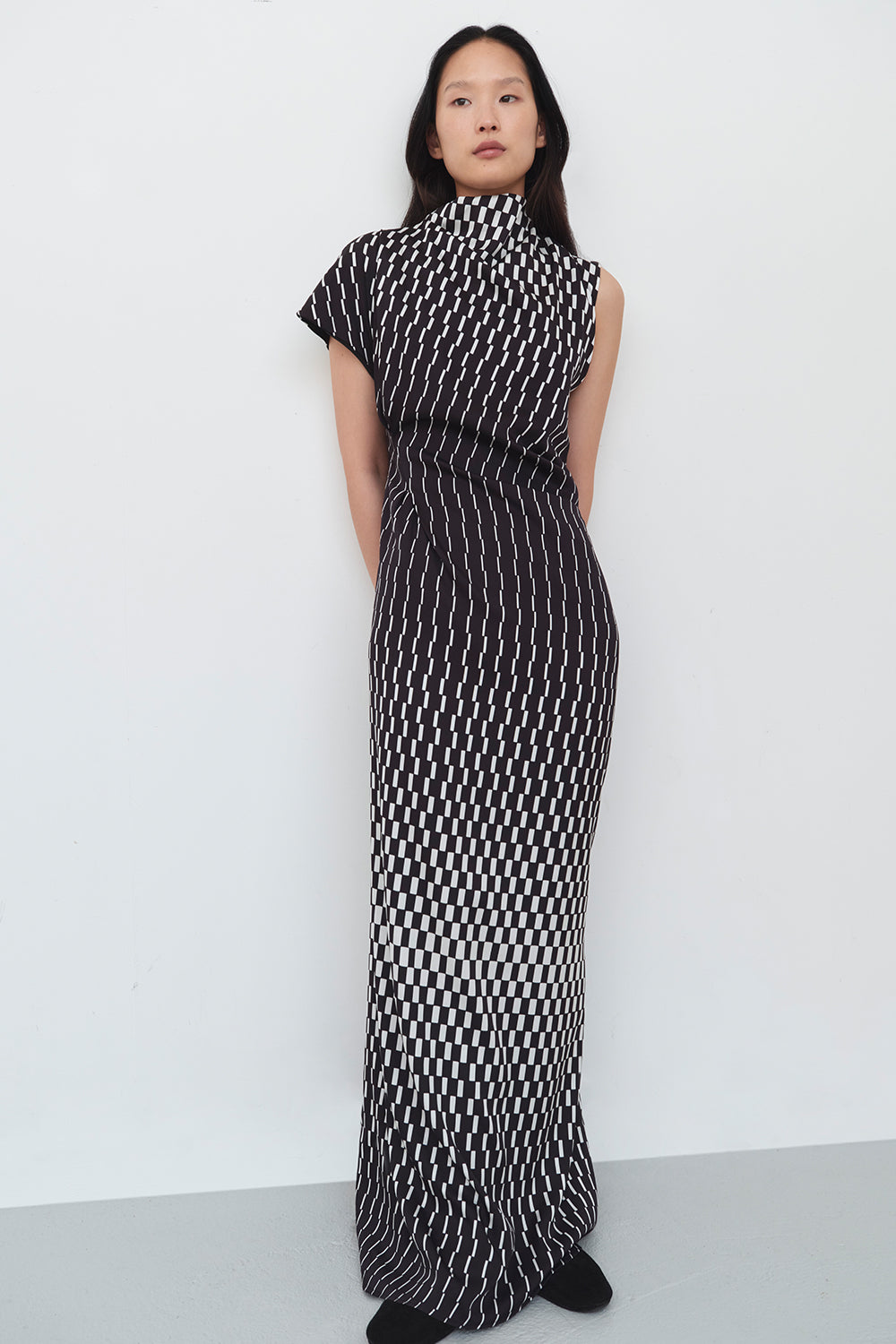 A standout piece from the Resort collection is the June Dress. Featuring an asymmetric draped detail and crafted in luxurious silk, the June Dress with its statement monochrome print is a modern take on refined eveningwear.