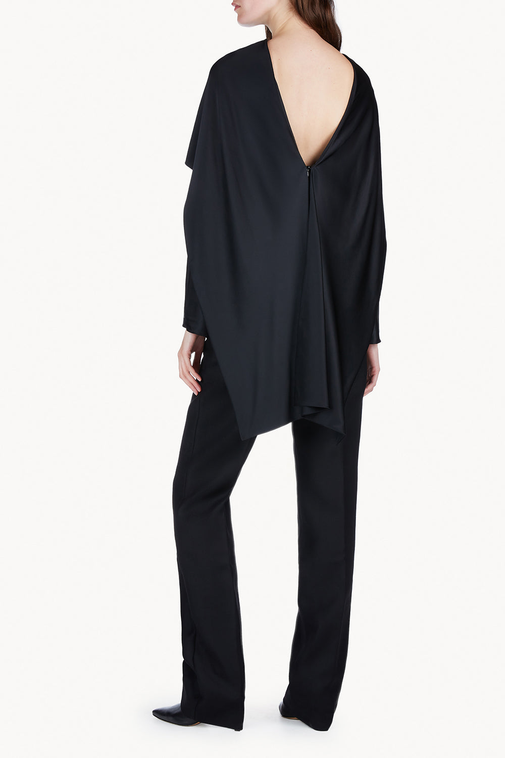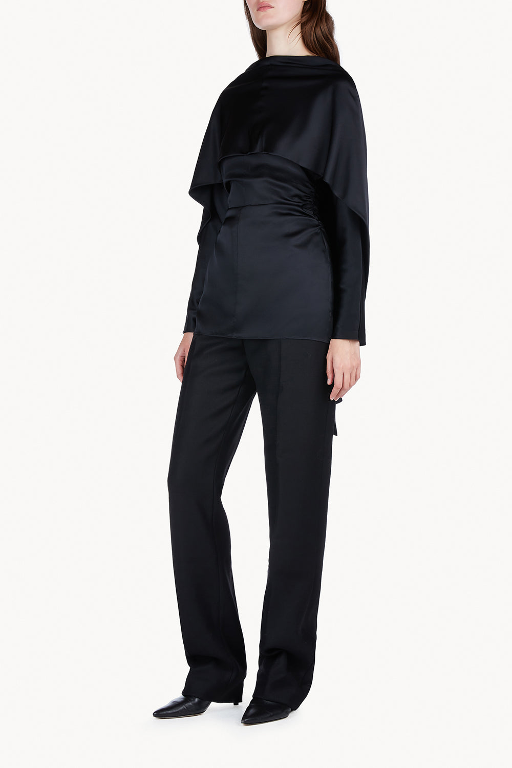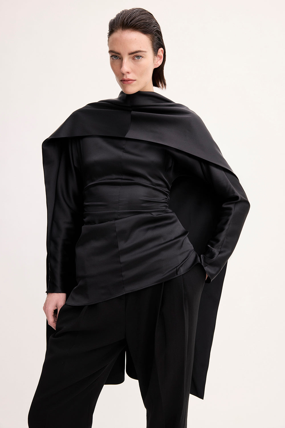 This black silk-blend top exudes elegance. Created in rich black silk, this piece is elevated by a dramatic, draped scarf detail and low v neckline to the back of the top. With long slimline sleeves and gathered detailing at the side seams along the waist, that add a touch of refinement. The perfect evening piece.