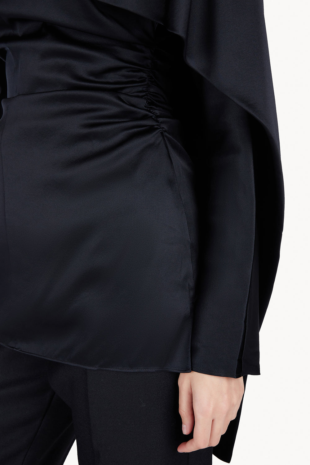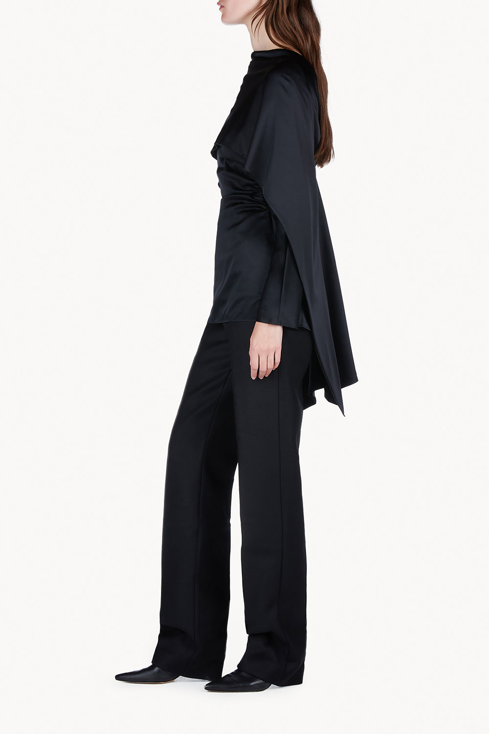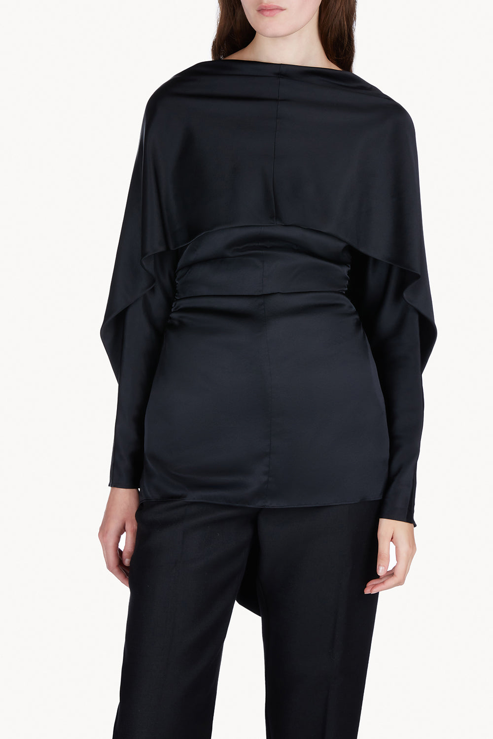 This black silk-blend top exudes elegance. Created in rich black silk, this piece is elevated by a dramatic, draped scarf detail and low v neckline to the back of the top. With long slimline sleeves and gathered detailing at the side seams along the waist, that add a touch of refinement. The perfect evening piece.