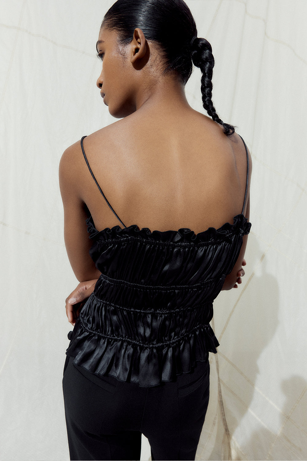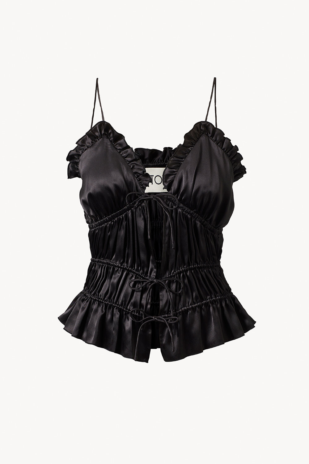 Crafted in luxurious silk, our Keonie Top adds relaxed refinement to the a transeasonal wardrobe. A gathered design throughout the bodice is finished with centre front ties and secured with delicate tie detail adjustable straps. Pair with the Kobe Jeans for a relaxed, feminine daytime look.