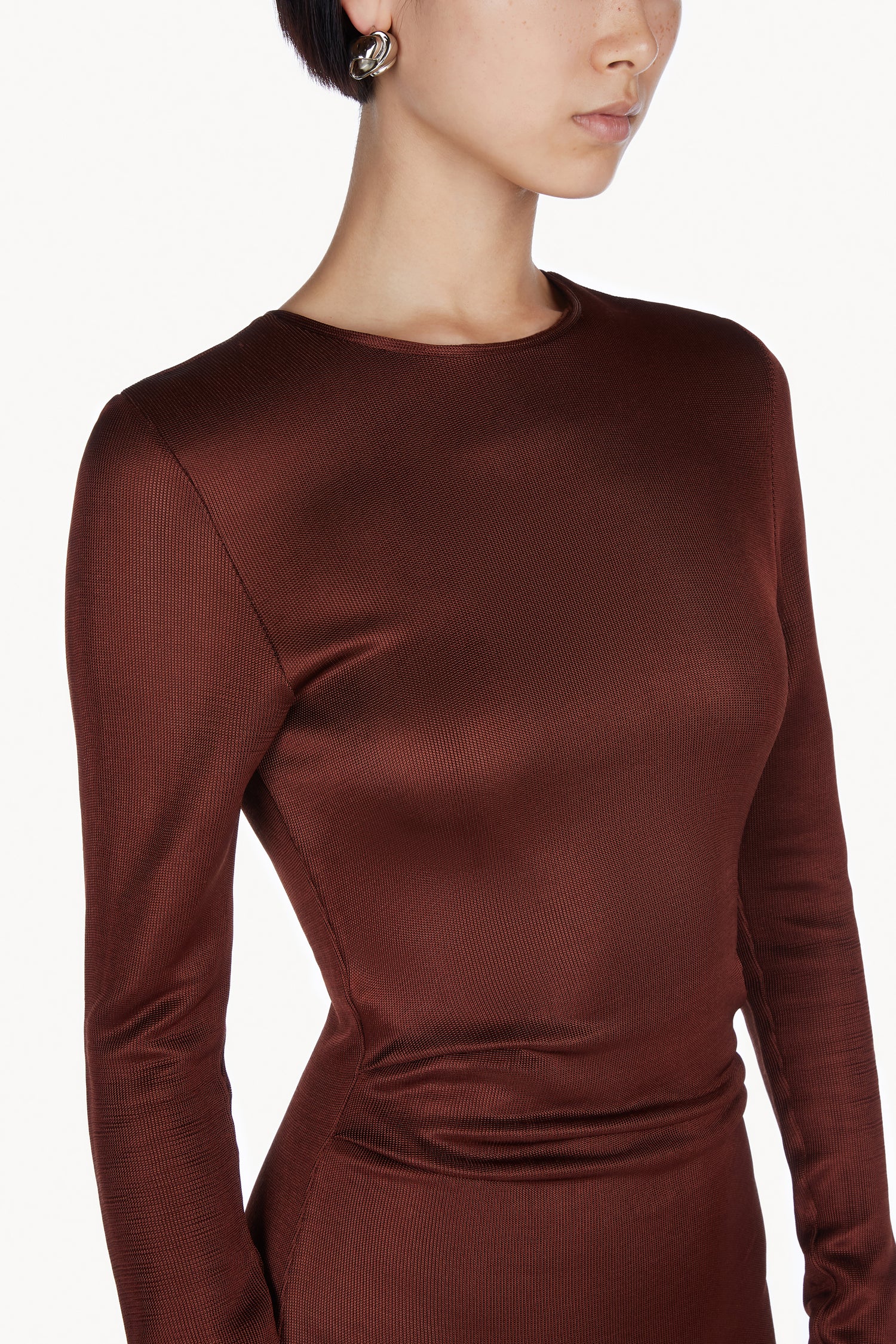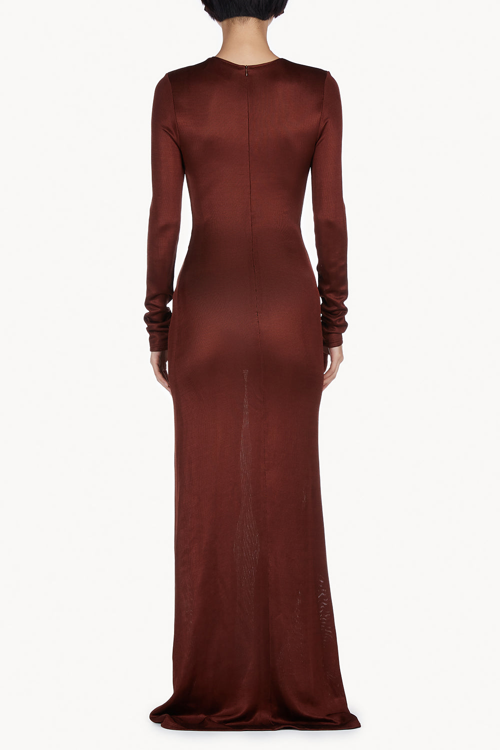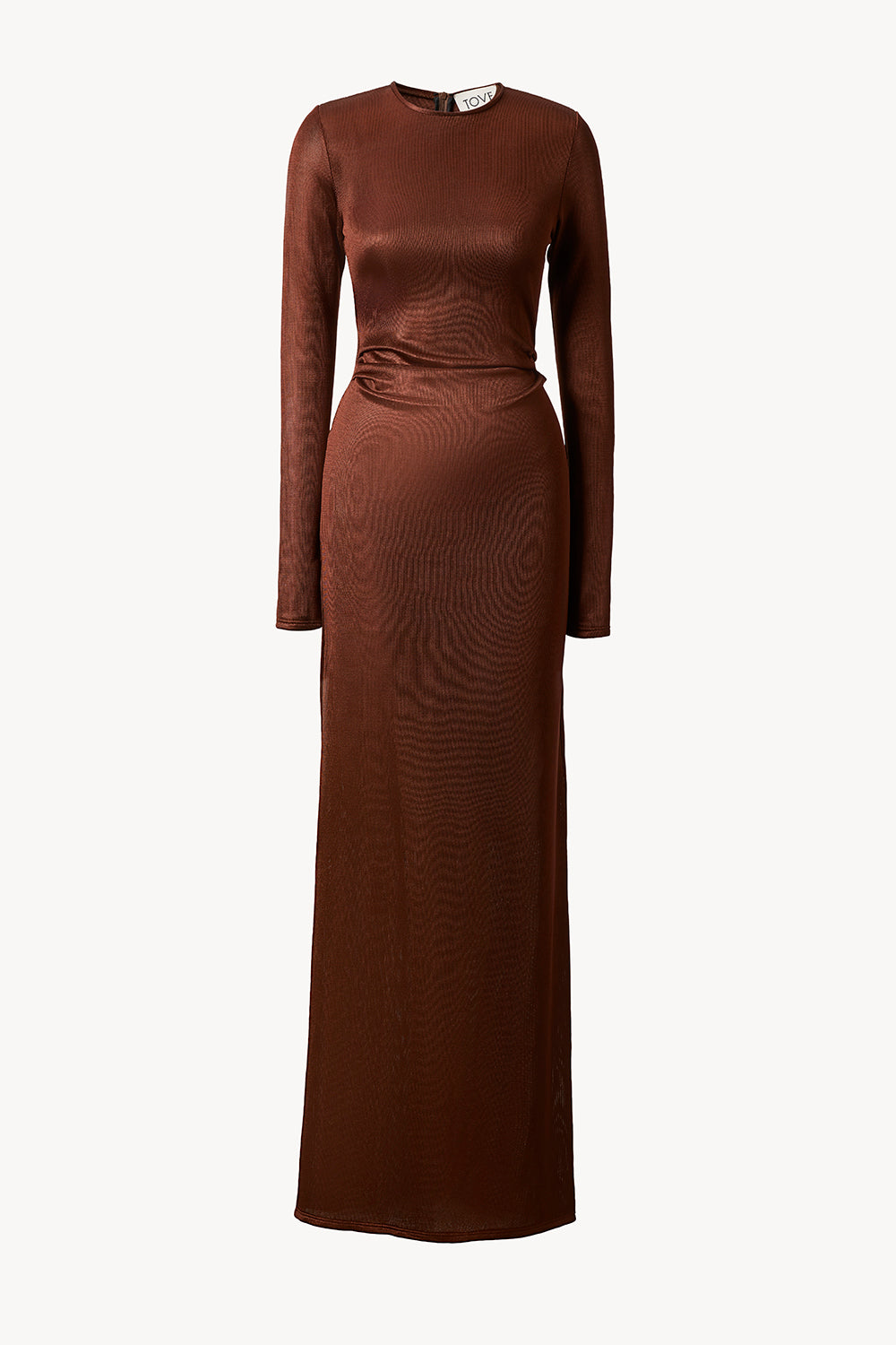 Crafted from a fluid Italian jersey with a liquid sheen, the floor-length Luella Dress gently skims the body. Long slim sleeves finish the look to create an understated evening wear dress.