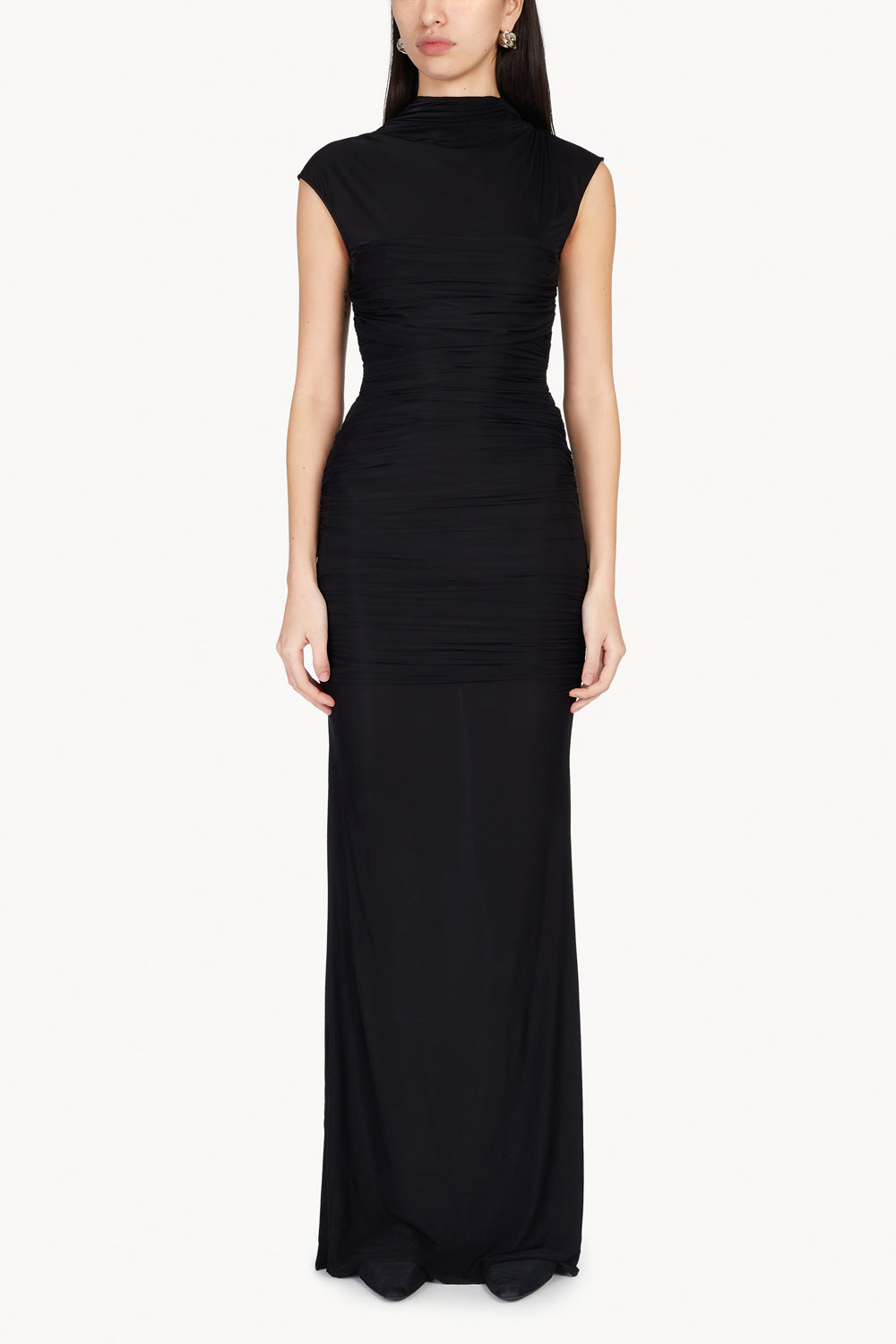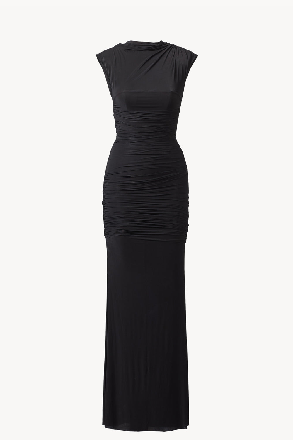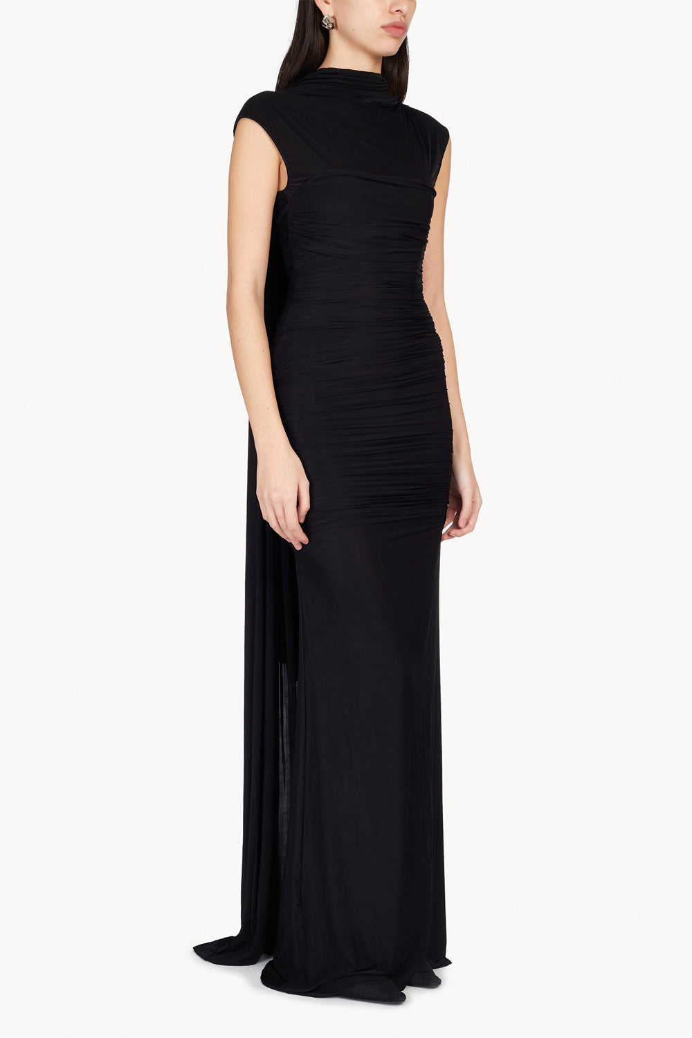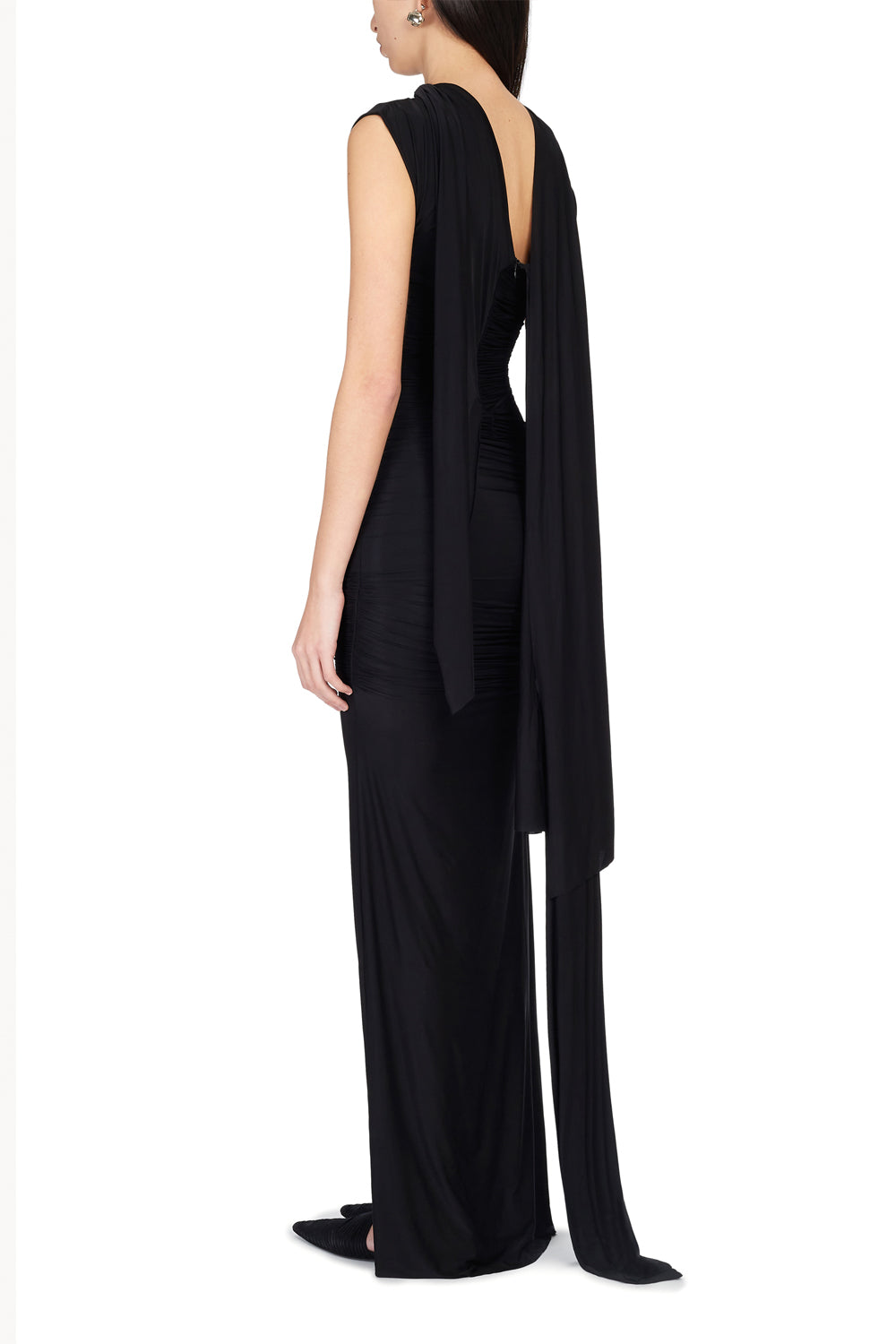 Cut from fluid black viscose jersey with a touch of elastane, the Luna Dress gently contours the body to finish at ankle length. Gathered to add texture, this sleeveless dress is finished with a low v back neck and fastened with an invisible zip at the centre back. The Luna Dress is finished with a dramatic sash train detail at the back.