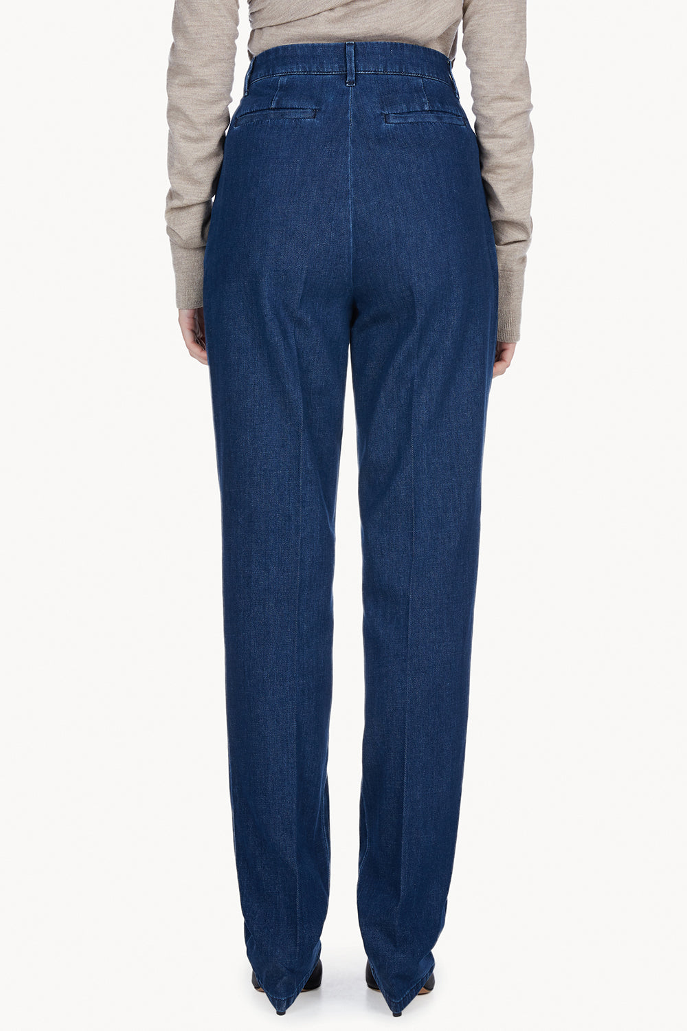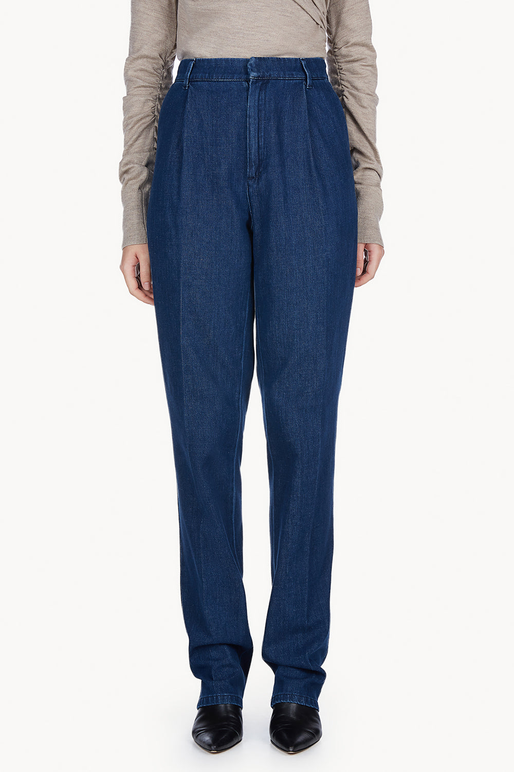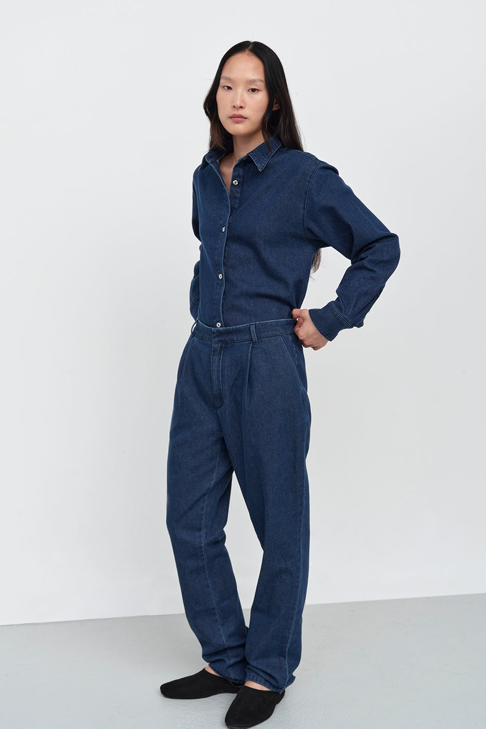 Crafted in premium denim, from a cotton and recycled polyester fabric, the Maggie Denim Trouser is a timeless wardrobe essential. In deep indigo, the Maggie Trouser features trouser styling with deep front pleats that run vertically from the waistband and a relaxed straight leg silhouette. Pair with the Navie Shirt to complete the look.