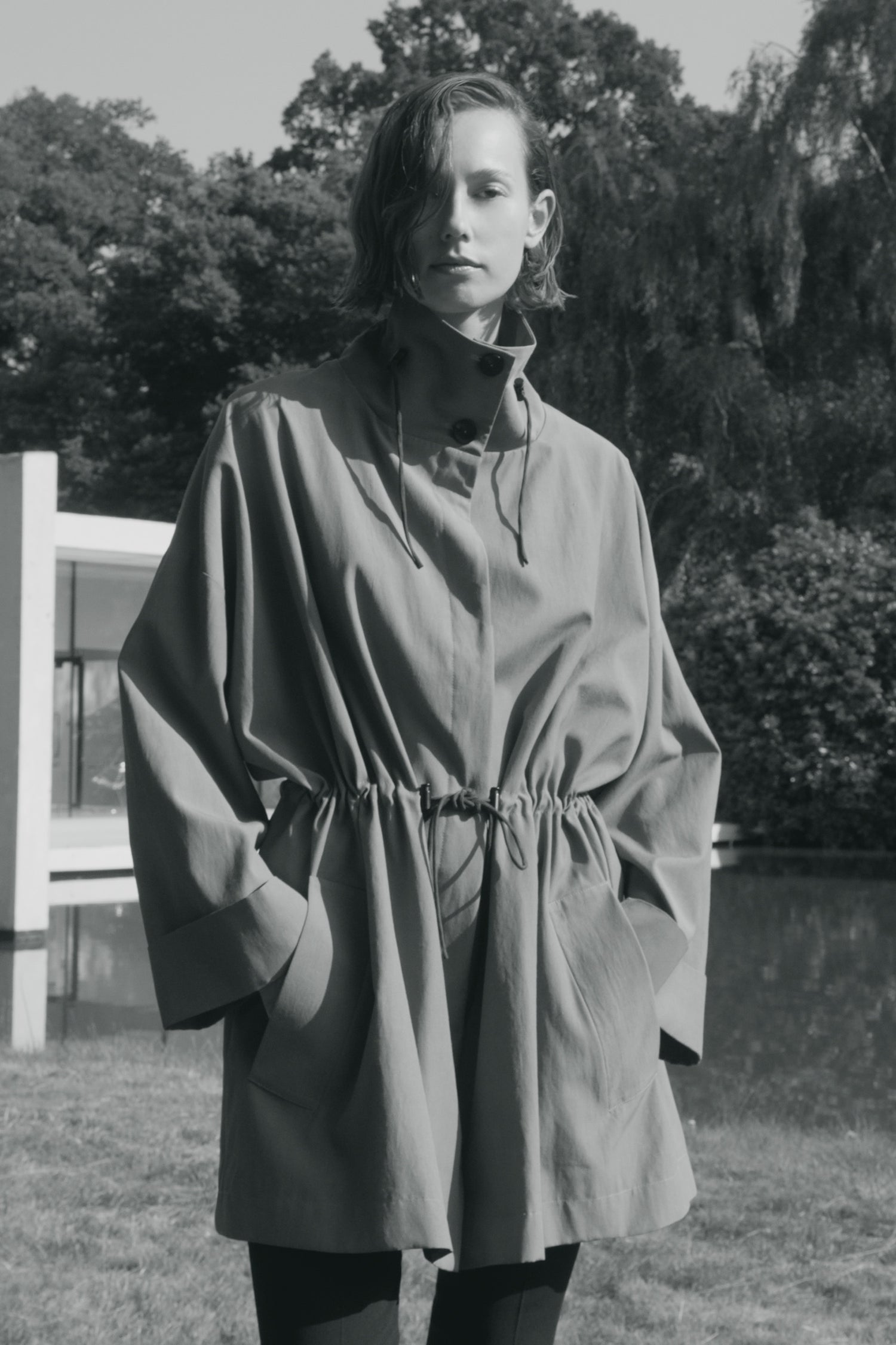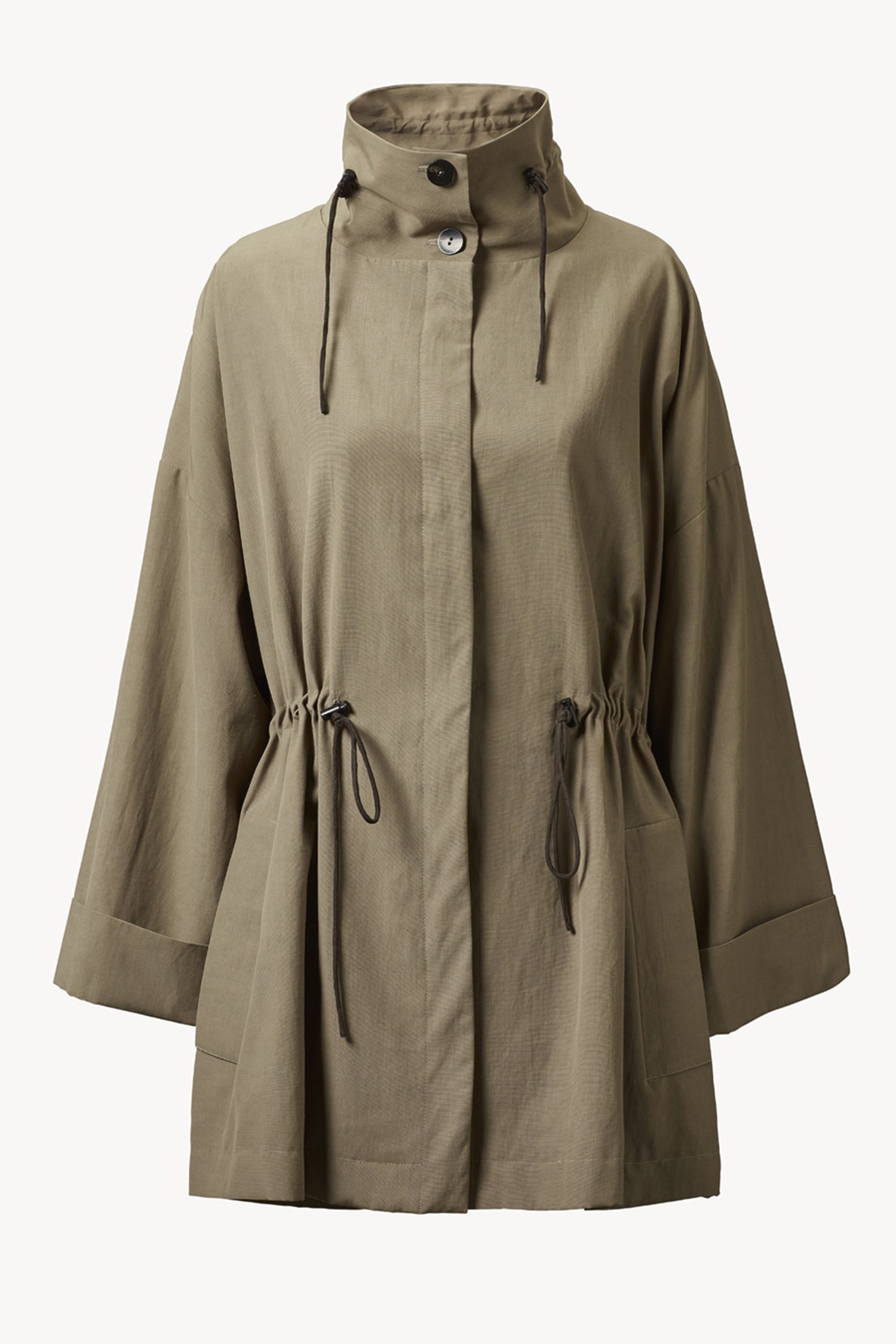 The Manet Jacket in Khaki is defined by relaxed structure and thoughtful detailing. Crafted from a lightweight blend of viscose and cotton, it features a high funnel neckline with adjustable drawstrings and a concealed front fastening for a clean, uninterrupted silhouette. Drawcords at the waist create subtle definition, while wide sleeves and patch pockets lend utilitarian ease. A refined layering essential, the Manet Jacket offers understated versatility.