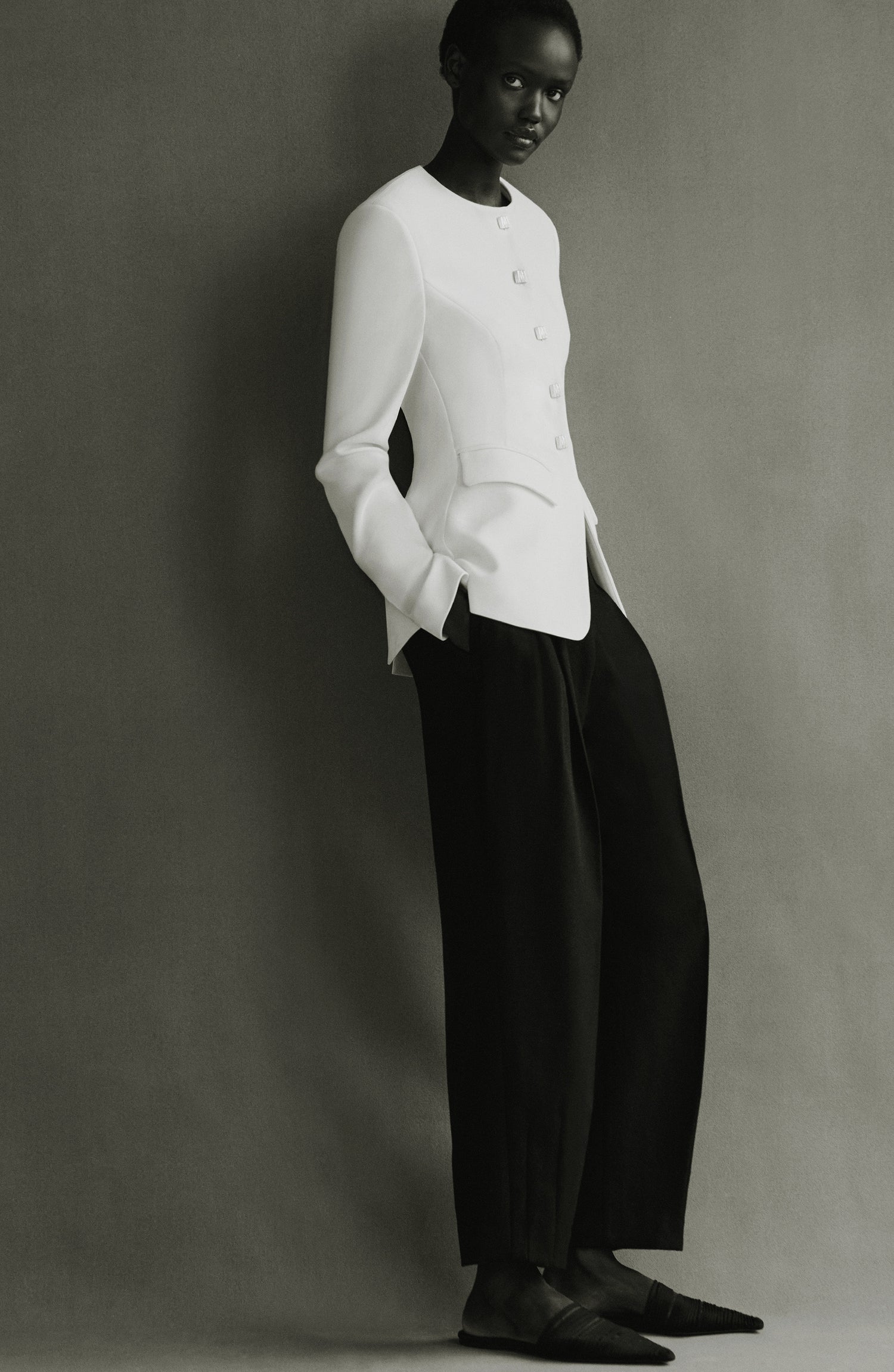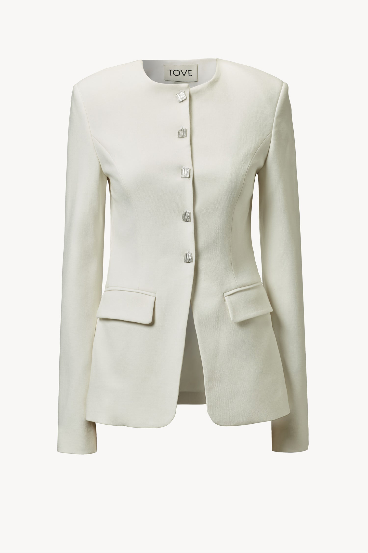 The Moya Jacket in White is crafted from luxurious wool and tailored to a slimline, longline silhouette. This collarless design features front pocket detailing and is accented with our signature button closure to subtly define the waist. With slim sleeves and a structured shoulder line, the Moya Jacket is a refined transeasonal layer. Wear with the Sindy Skirt White to complete the look.