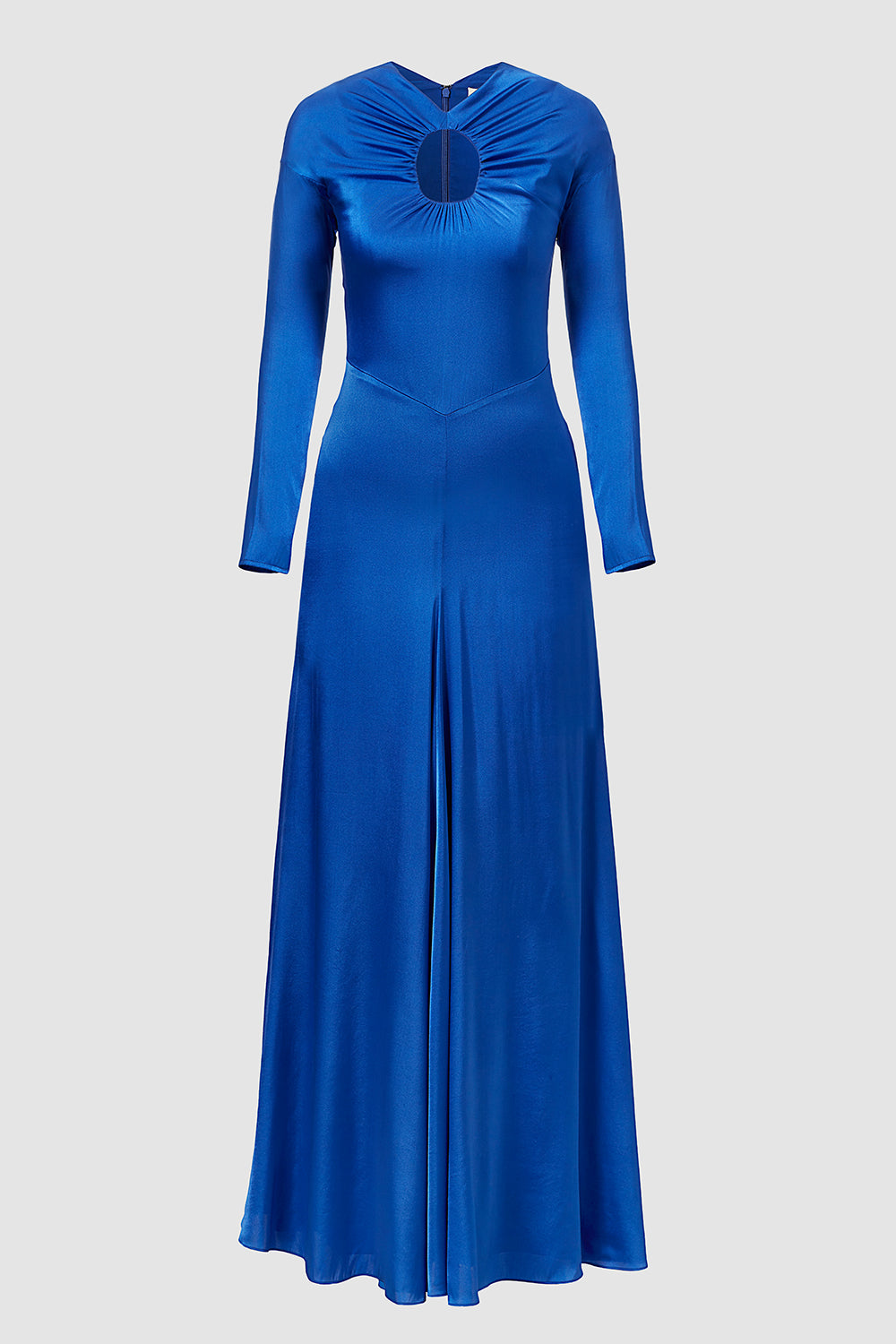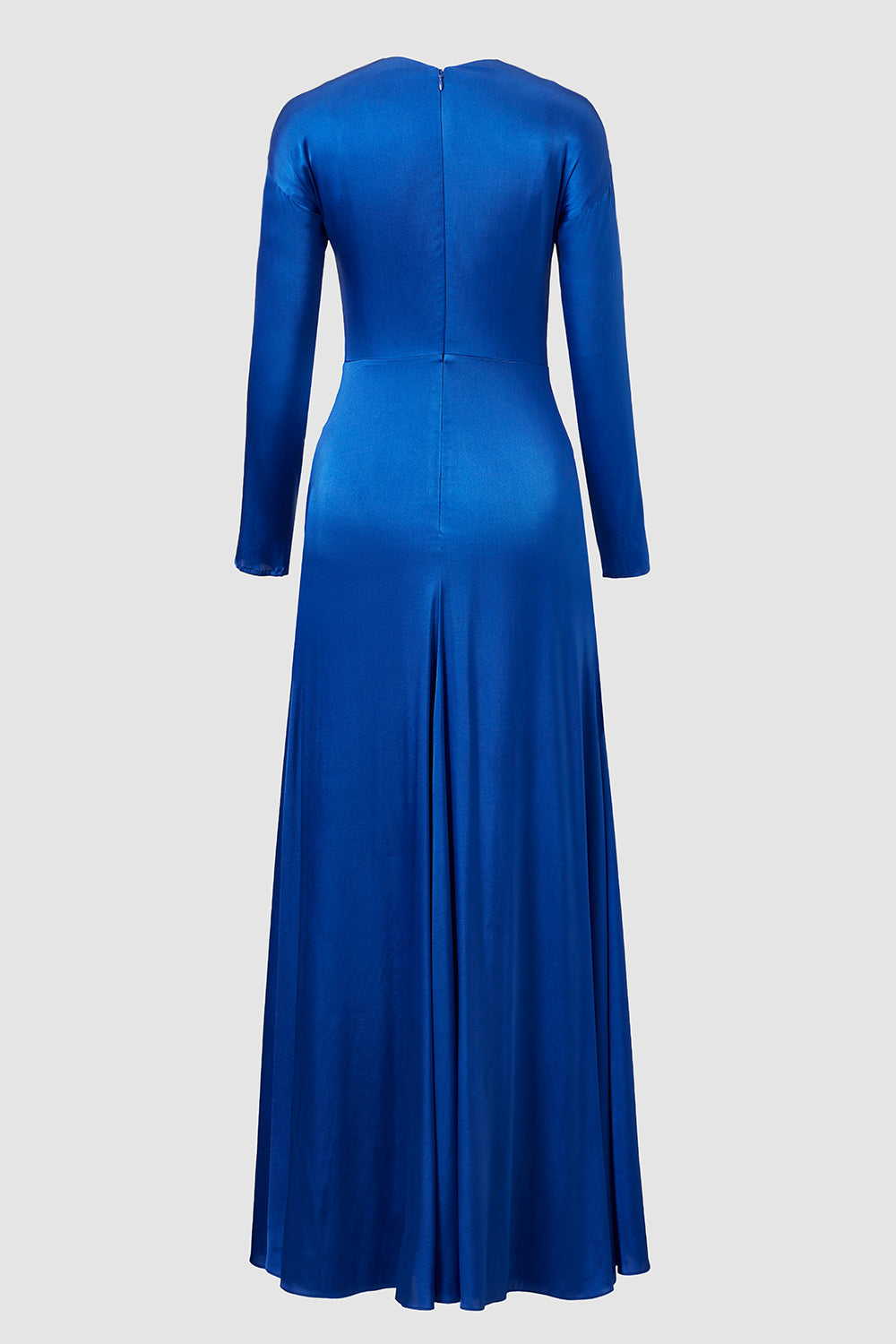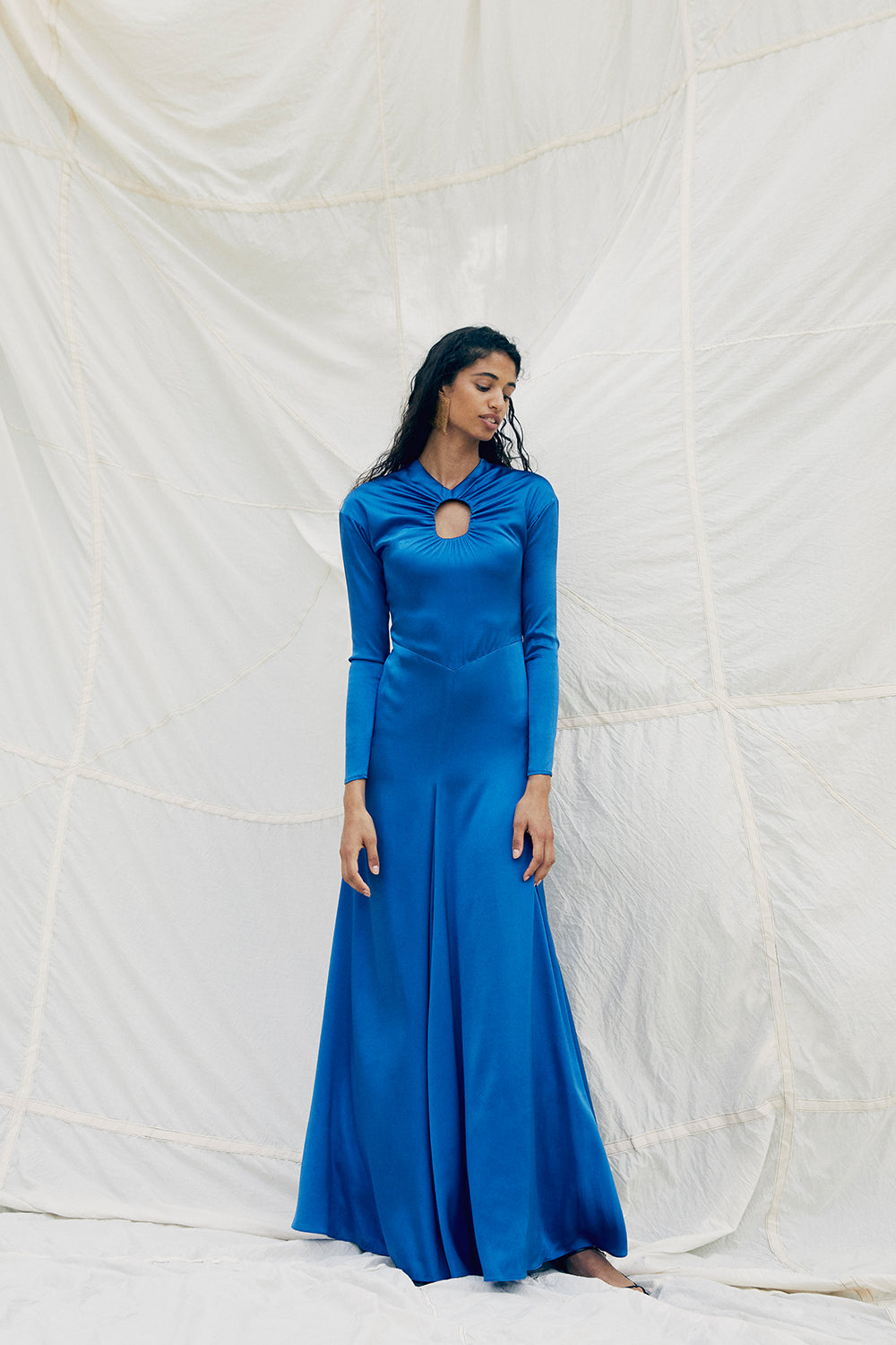 Cut from smooth stretch silk satin, the Noor dress is the perfect balance of modernity and femininity. A slim silhouette on the upper body of the dress is unrestrictive due to the stretch within the silk and a sweeping skirt skims the lower body and pools beautifully on the floor.