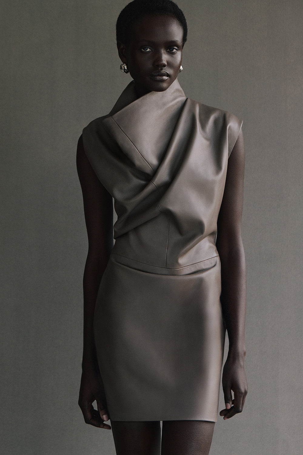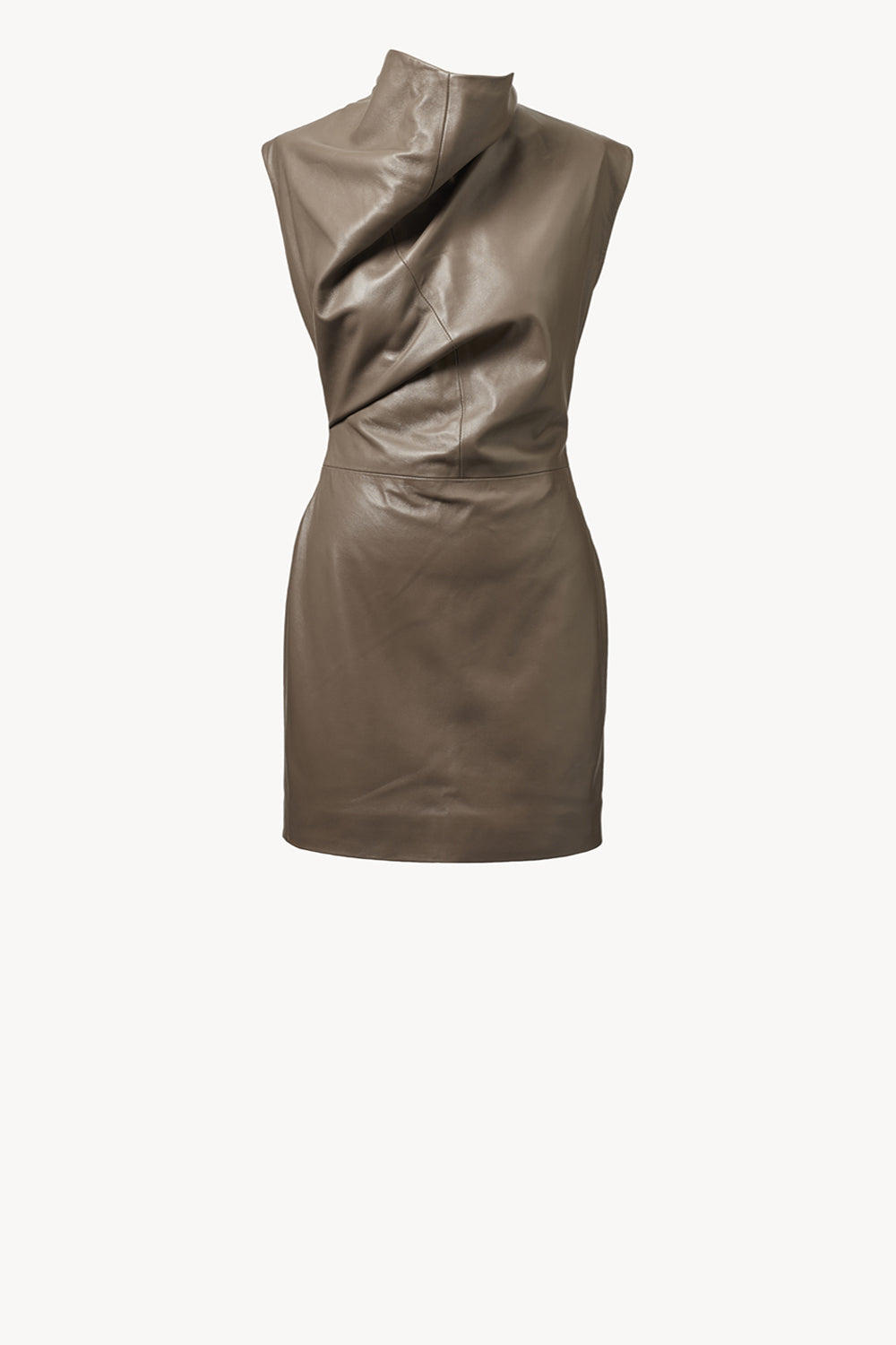Sculpted for impact, the short-length Olya Leather Dress in taupe plays with movement and volume. Crafted from supple leather, the Olya Leather Dress balances structure with fluidity through an elegant asymmetric seam that shapes a bold, layered silhouette. A concealed back zip closure ensures a smooth, seamless finish.