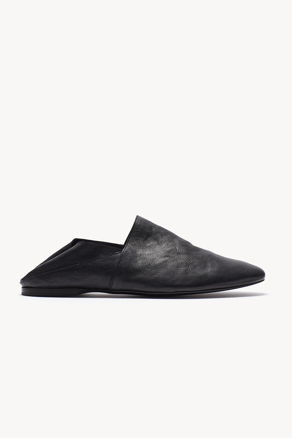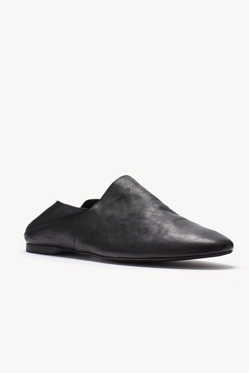 The Pascale Slipper is a relaxed summer piece. Crafted in a soft tumbled leather with a gentle almond toe shape, this timeless shoe has a collapsible heel that allows the slipper to be worn as a closed heel shoe and also a slip-on mule.