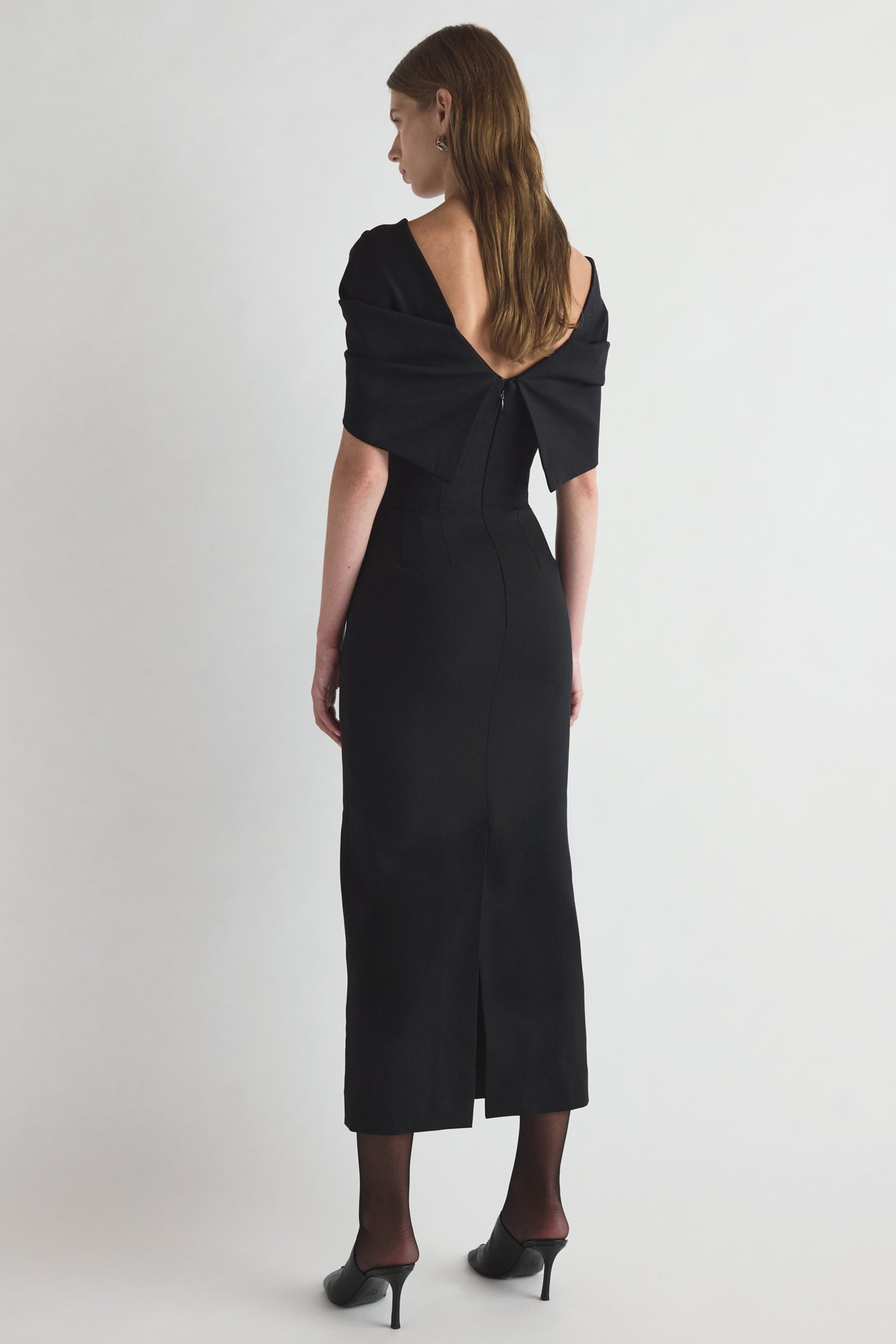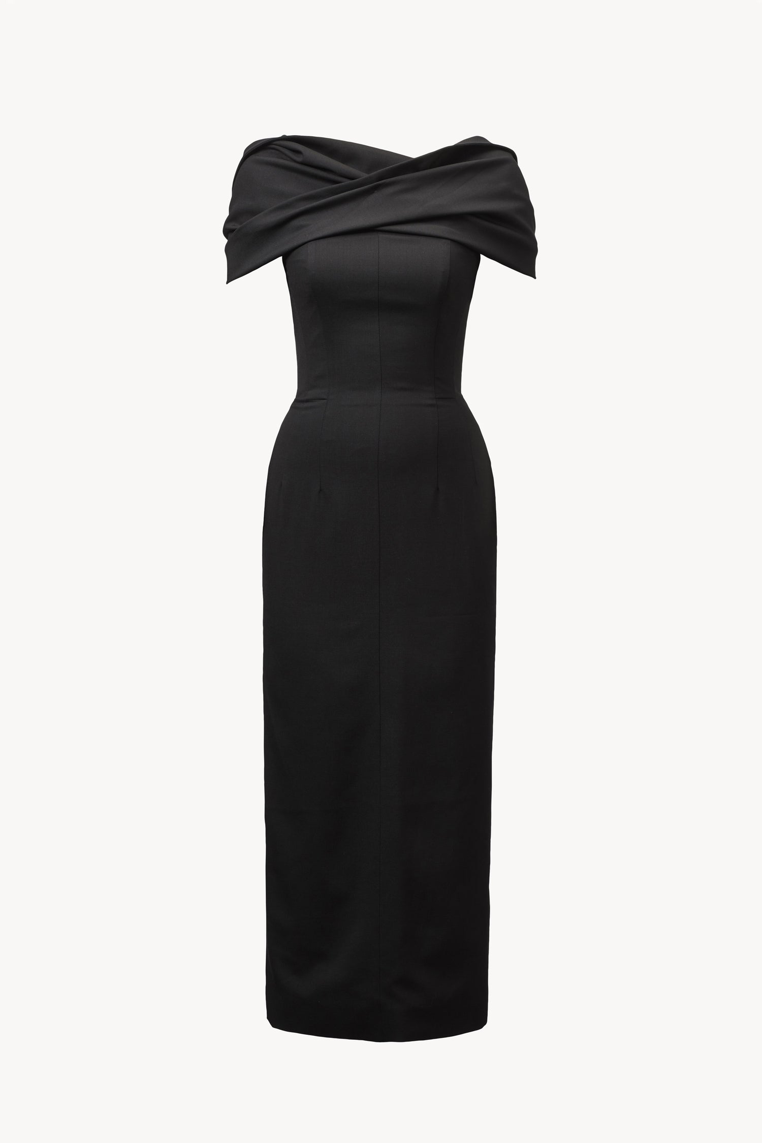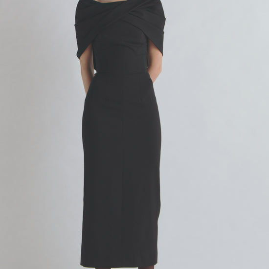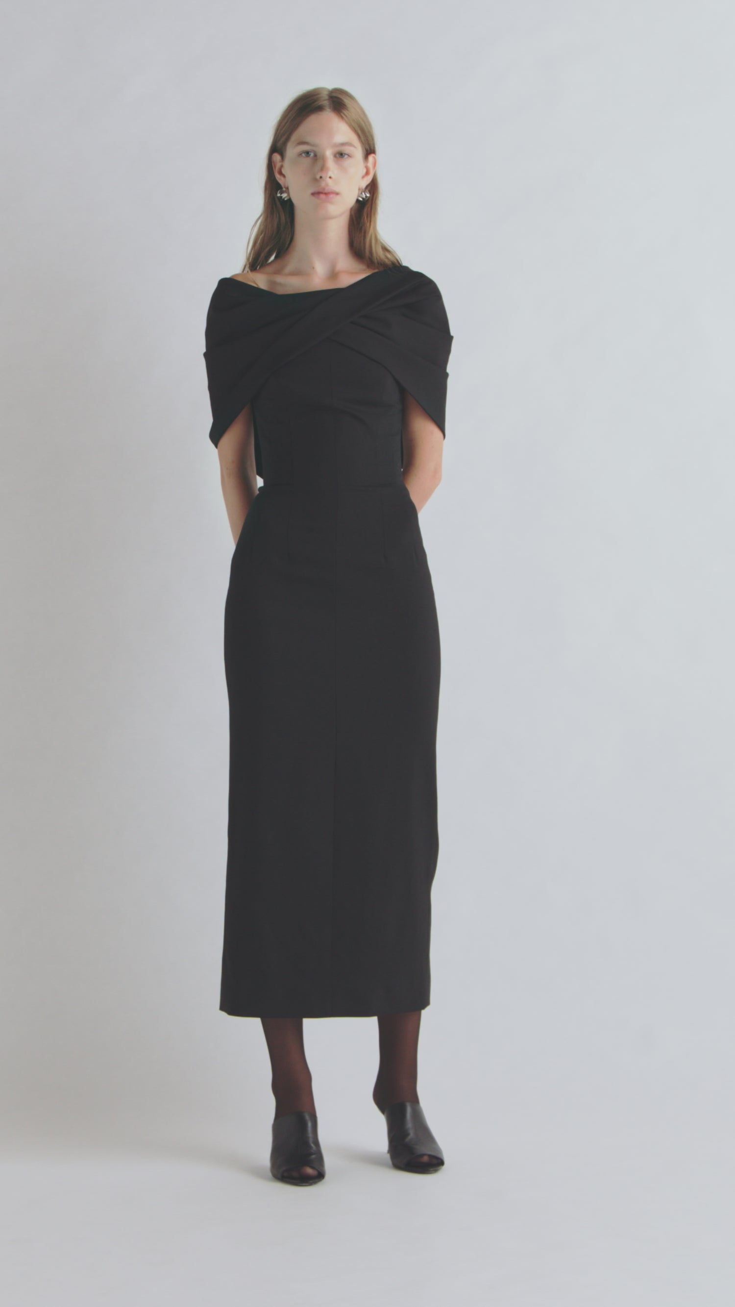 Constructed from an Italian wool and elastane blend, the Perrine Dress in black features a twisted, origami fold detail at the neckline that that falls elegantly around the shoulders. Designed to follow the body’s contours with subtle structure, the Perrine Dress offers an elevated take on contemporary evening wear.