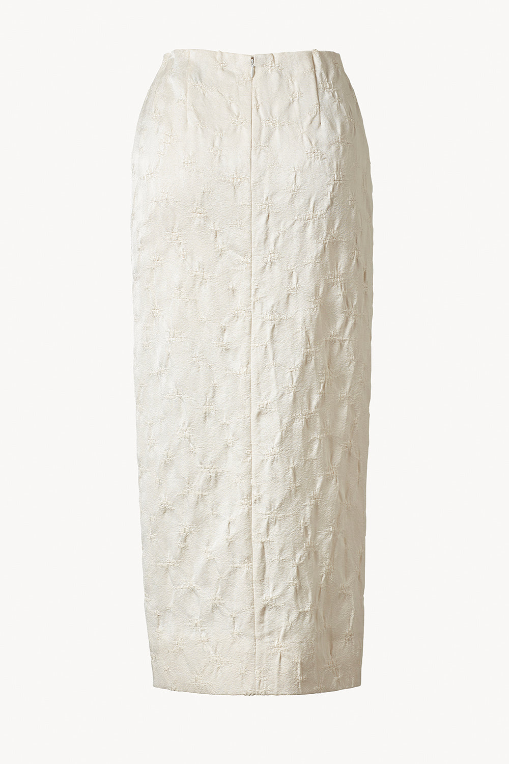 The Priya Skirt is a refined iteration of the modern pencil skirt. Crafted in a luxurious textured cotton blend with a subtle jacquard and soft lustre. Featuring a fixed wrap detail which leads into an elegant front split opening. Fastened by a centre back zip with a grown on waistband, the Priya Skirt is a timeless day to evening piece. Pair with the Kamari Top to complete the look.