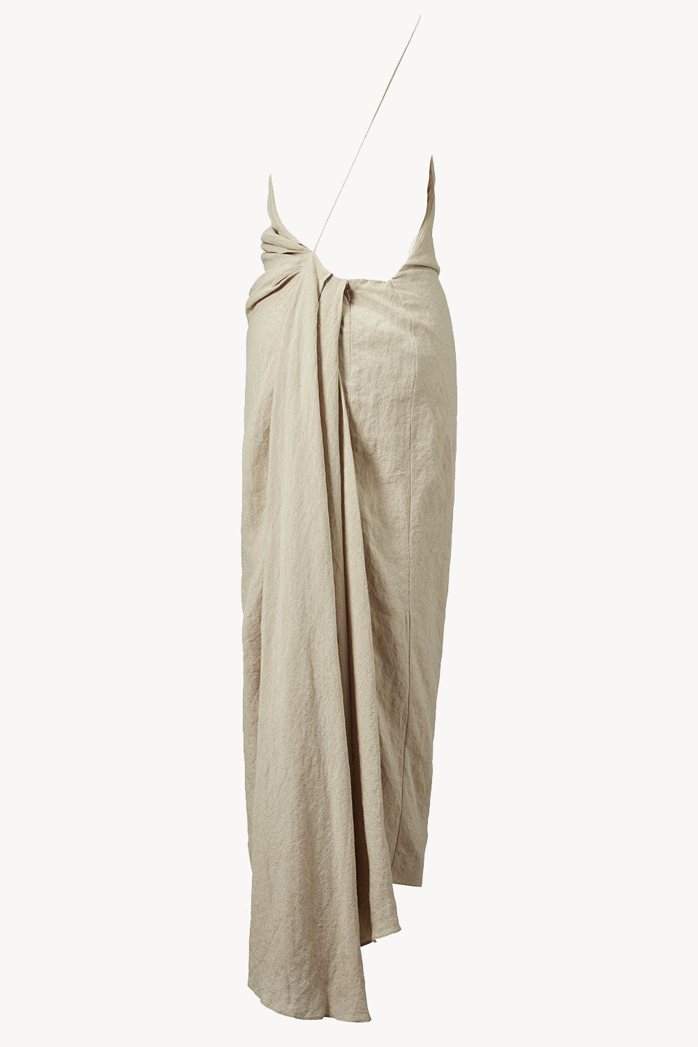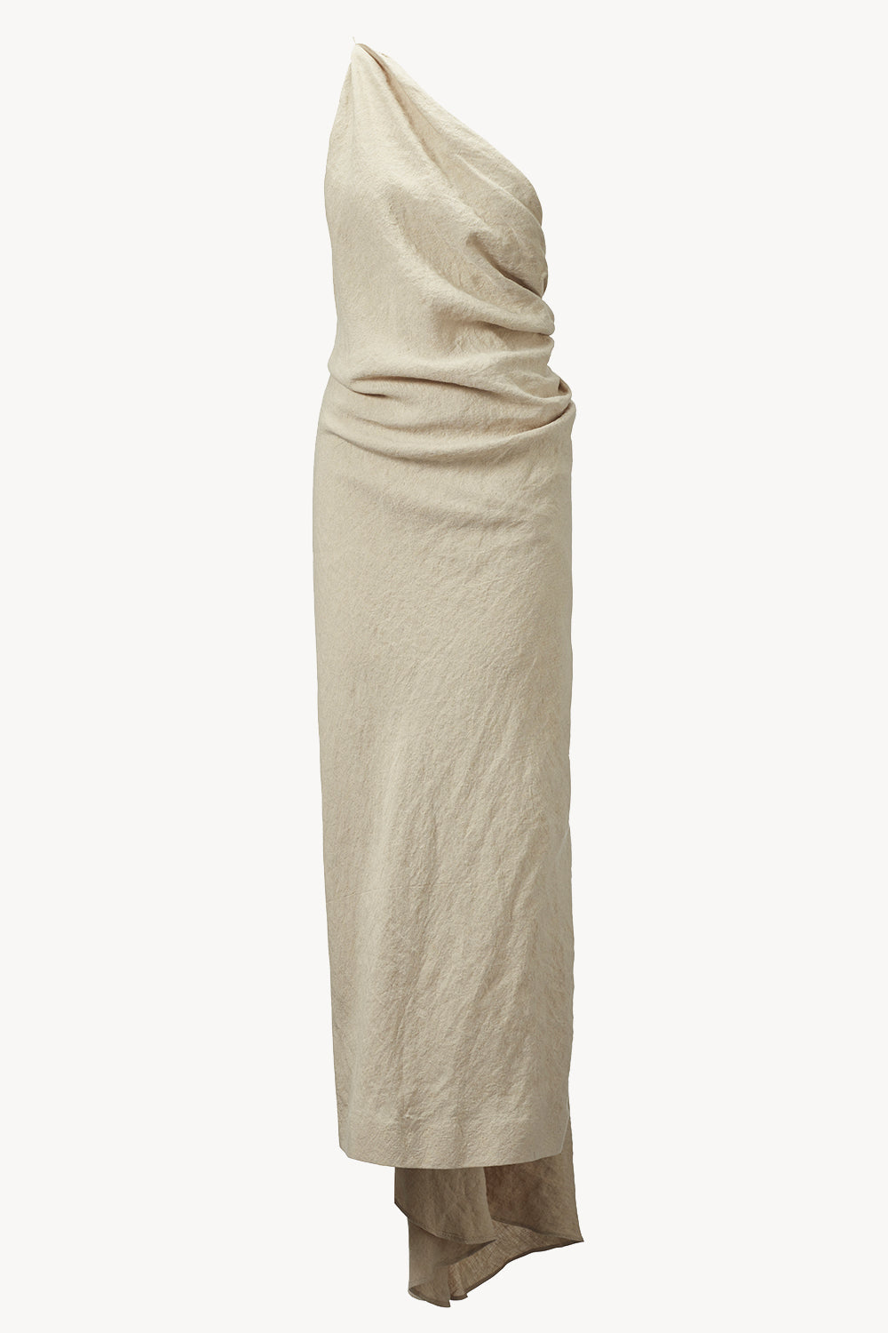 The one shoulder Riya Dress is crafted in a beautiful tumbled linen. With a dramatically low back and intricately cut gathered asymmetric detail at the back of the skirt, the Riya Dress is a standout piece from the Spring Summer 2024 collection.