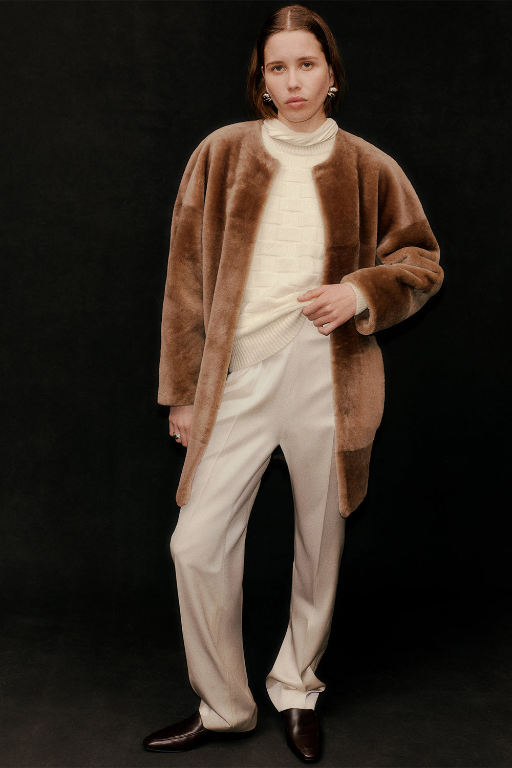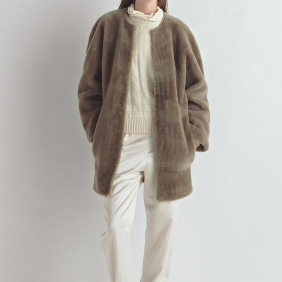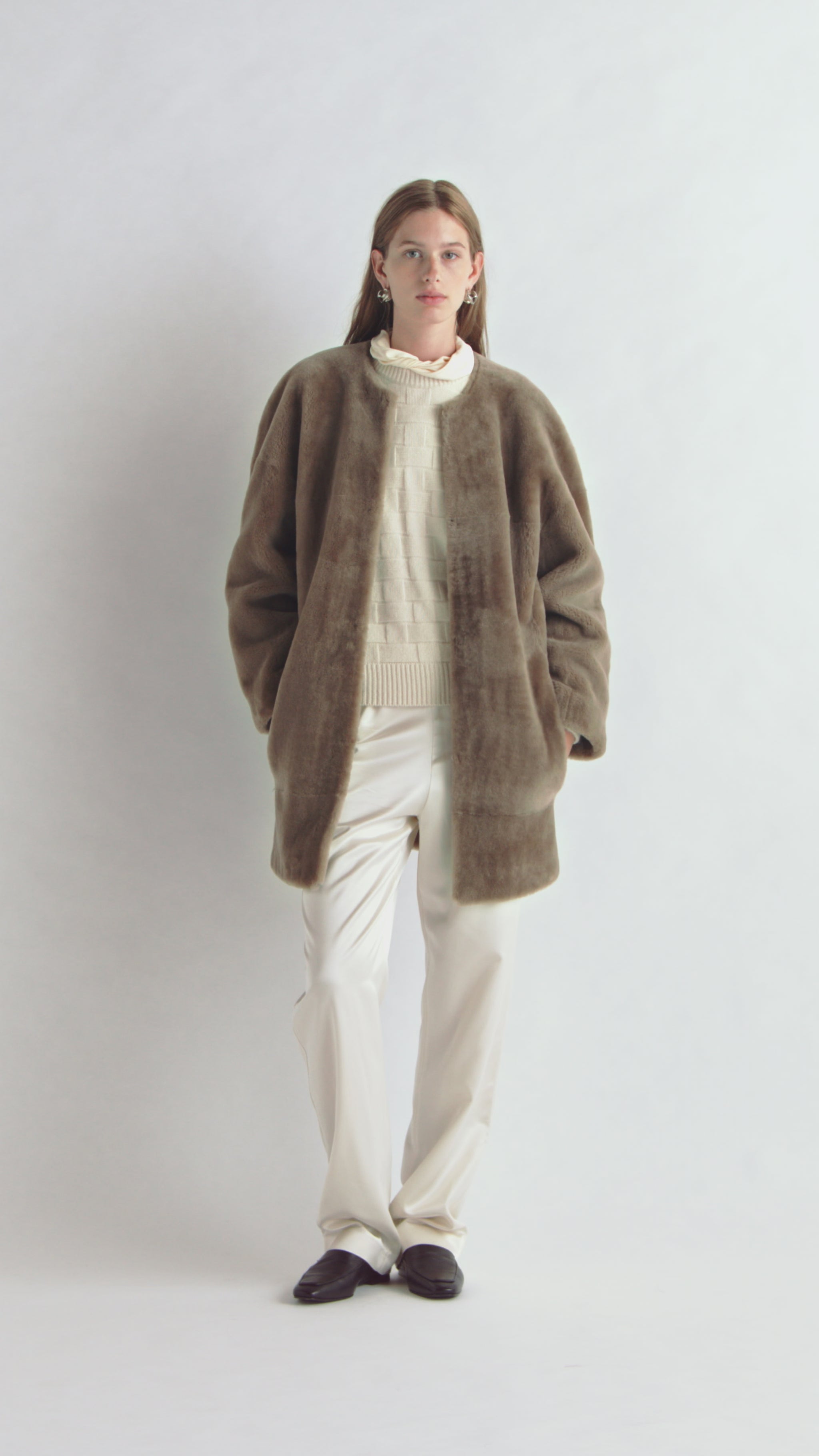 Designed with a clean, collarless neckline and a relaxed silhouette, the Roisin Shearling Coat Taupe balances warmth and refinement. Layer over soft knitwear and tailored trousers for a look that embodies understated luxury and modern femininity.