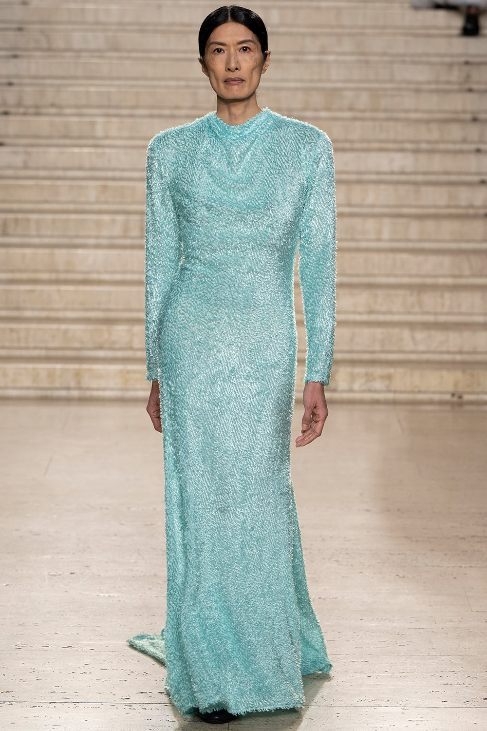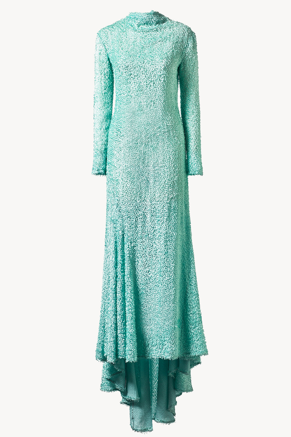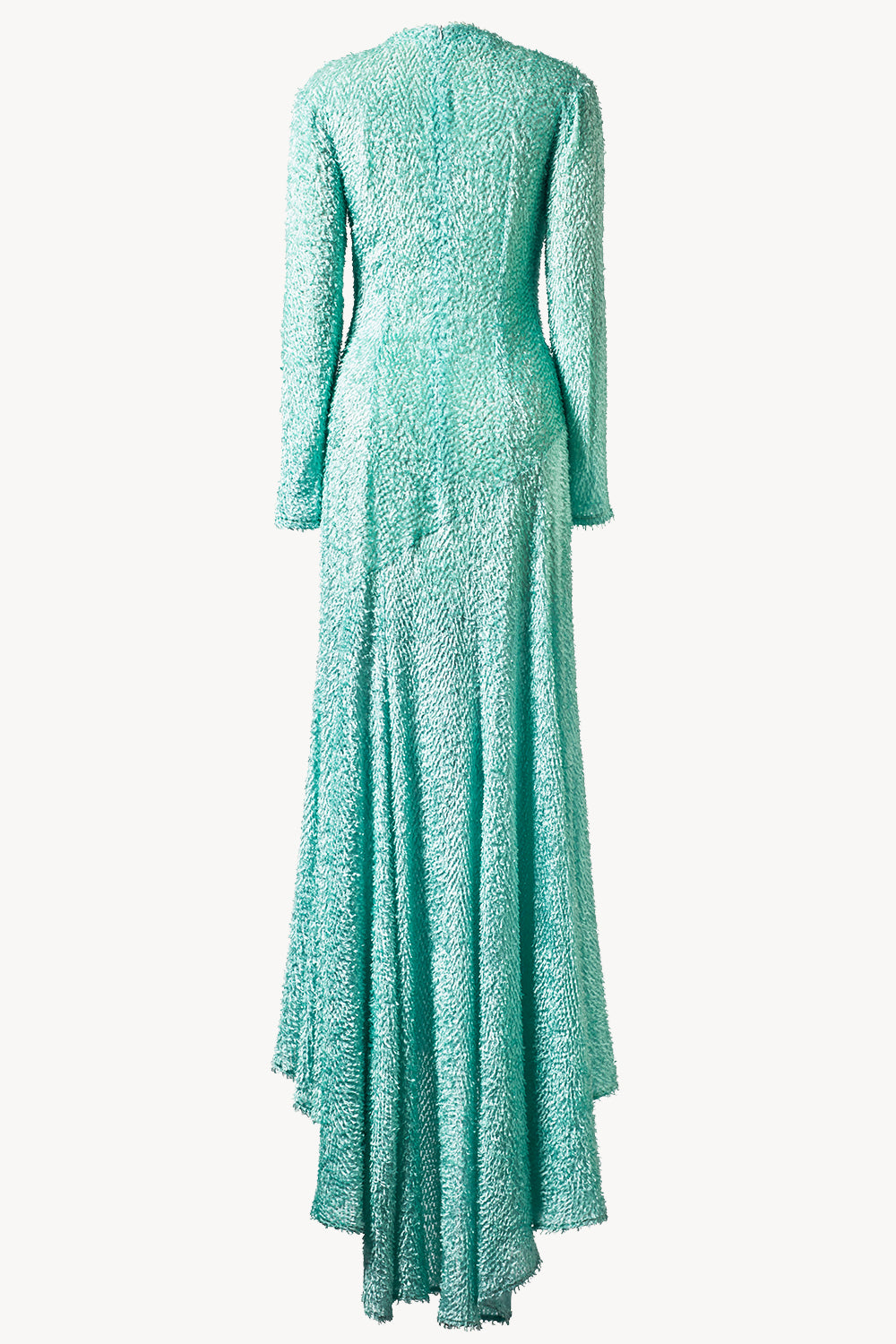 Crafted in a beautiful textured silk blend, the Somer Dress is a standout piece for the autumn winter season. The long sleeved silhouette, high neckline and dramatic skirt that drapes elegantly to the floor create beautiful movement when worn.