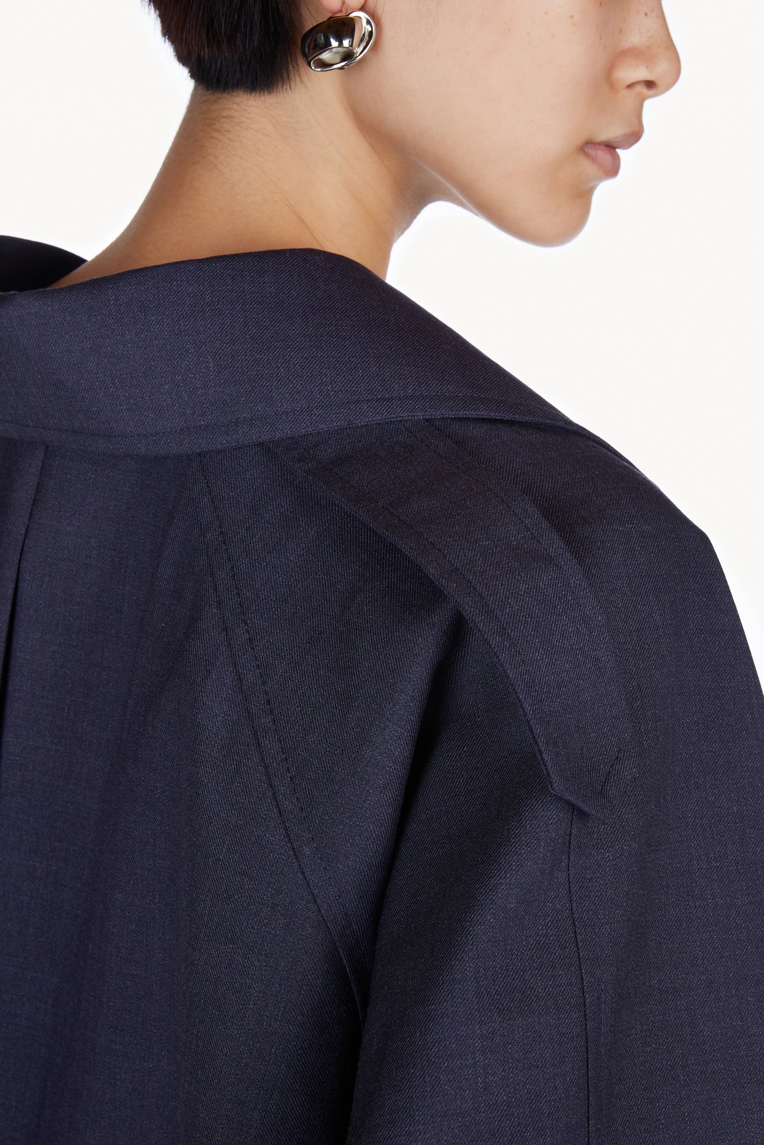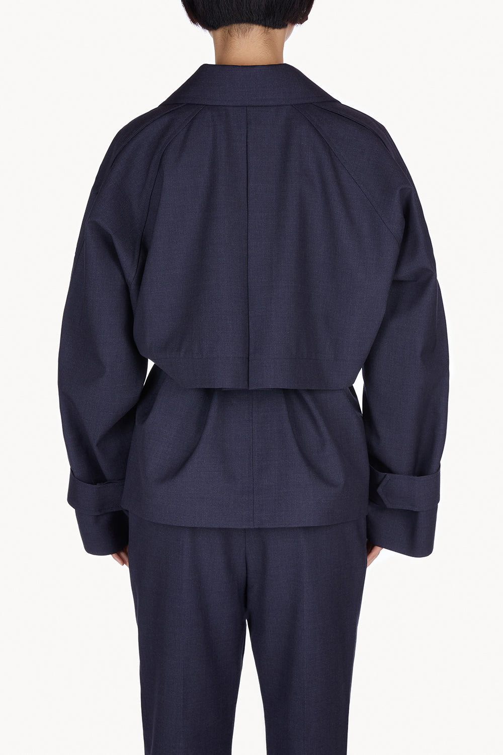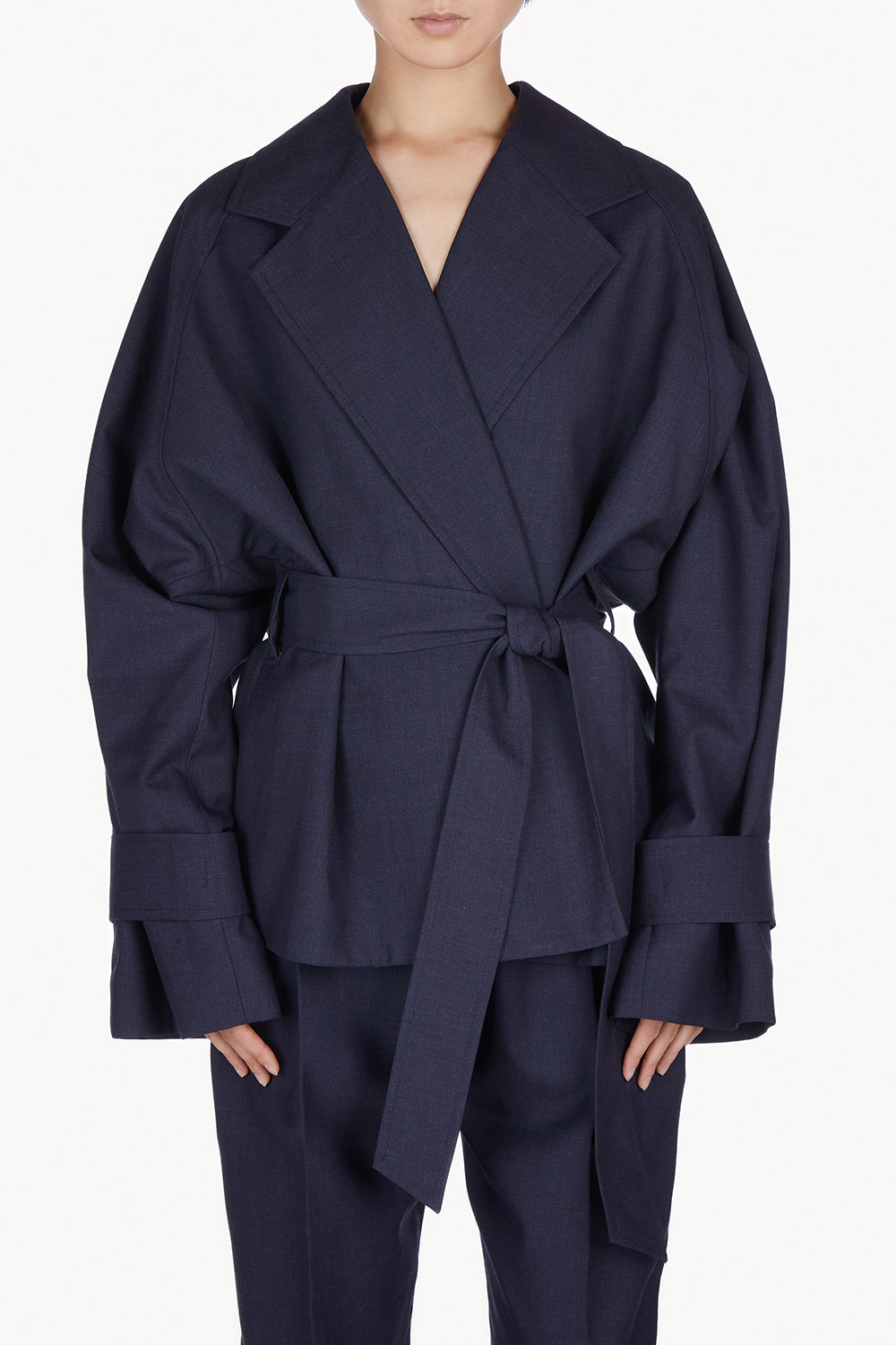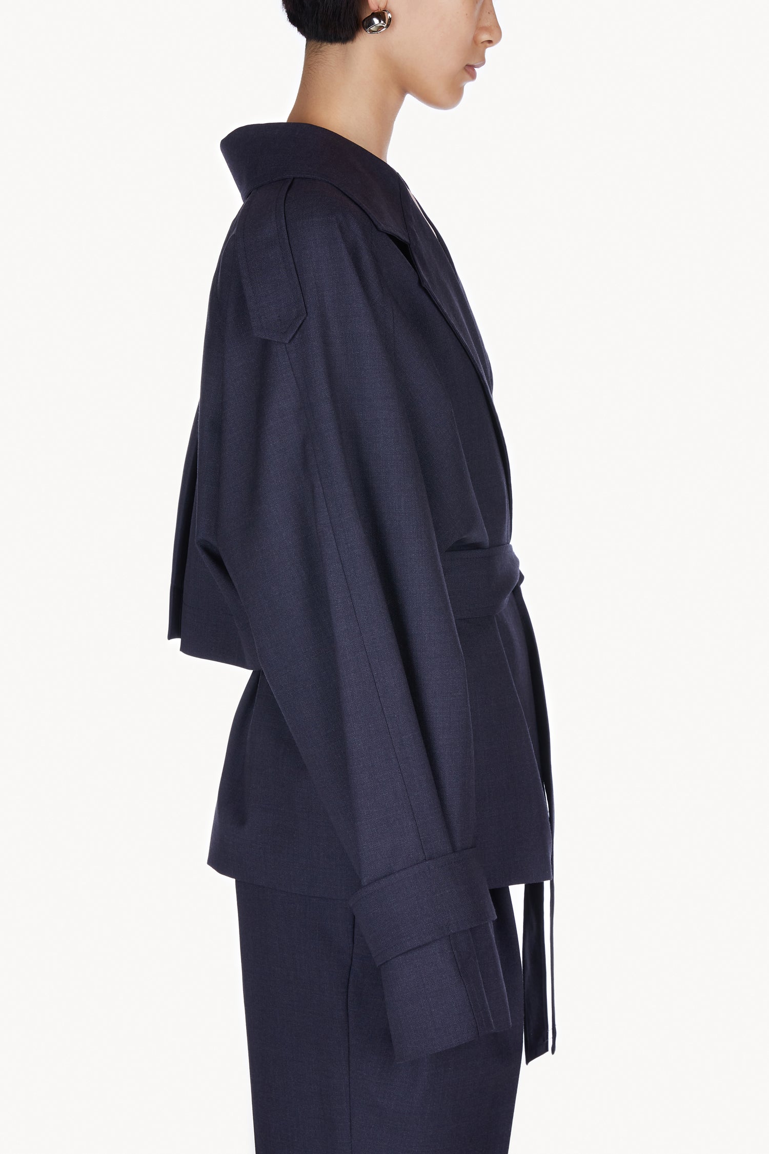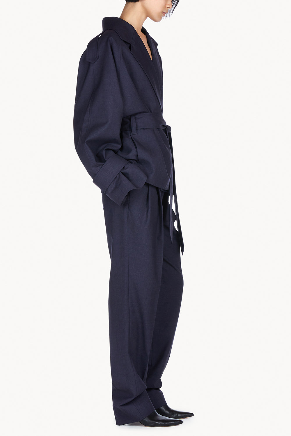 The Tate Jacket is crafted from luxurious virgin wool. Featuring a voluminous, belted design reminiscent of the classic trench. With a wrapped closure, its oversized silhouette is complemented by timeless detailing, including tab accents at the cuffs and a tie belt. Pair with the Alexis Trouser.