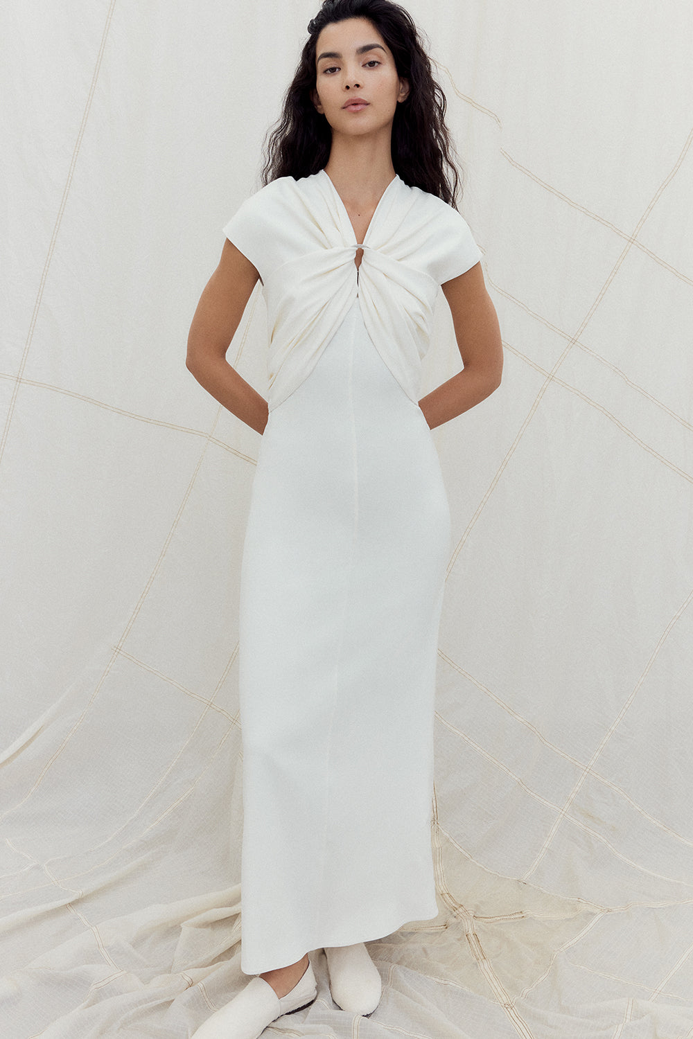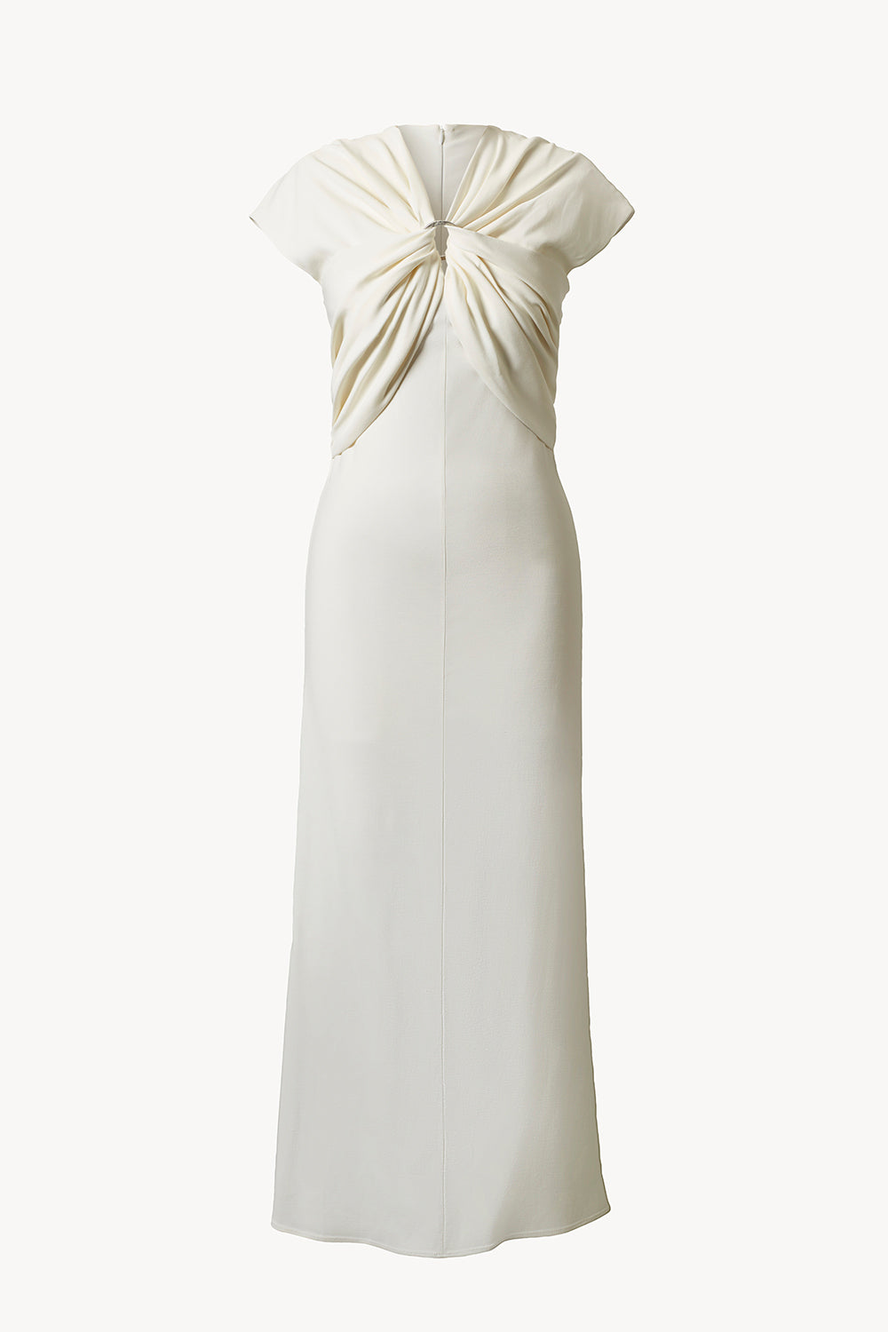 The Tova Dress features a striking gathered detail secured by a circular hand-forged metal ring at the centre front. Crafted in Italian stretch crepe this day to evening dress contours the body to finish at mid calf length. Closed by a centre back zip and finished with a grown on sleeve detail. The Tova dress is a timeless piece for any occasion.