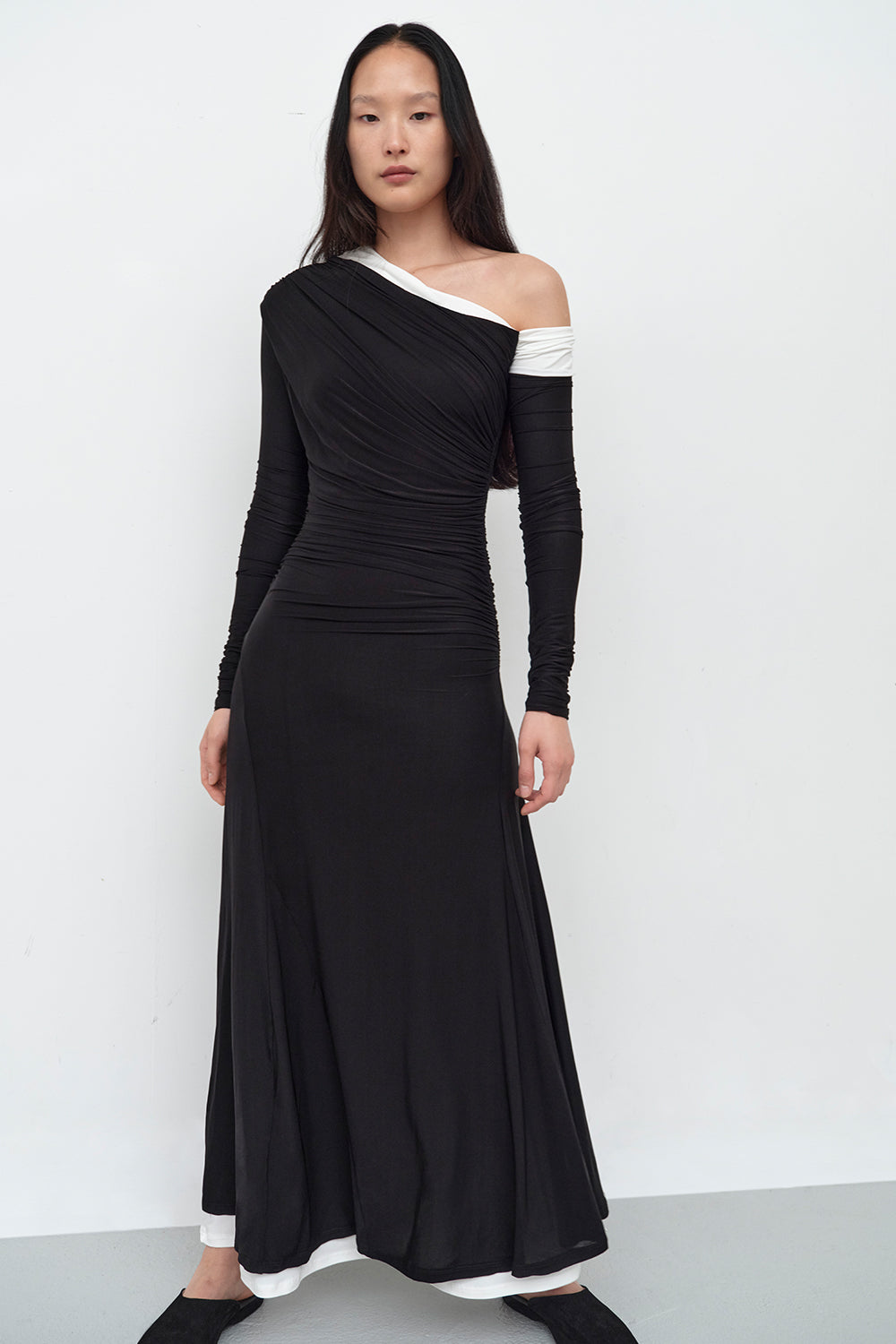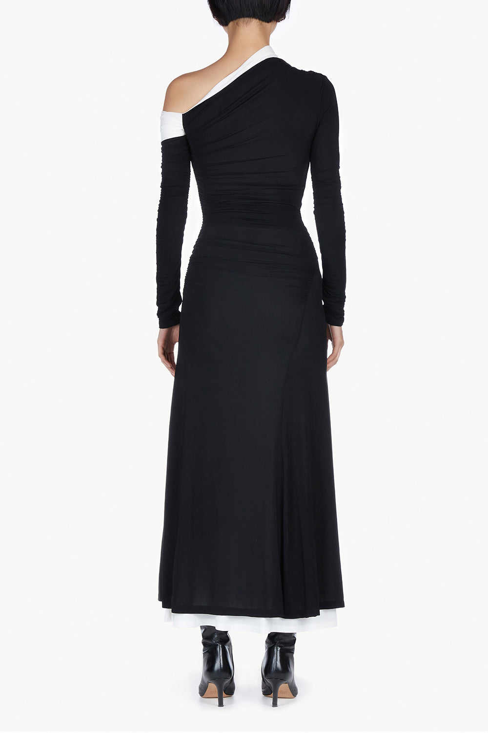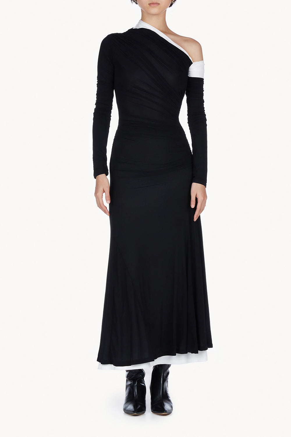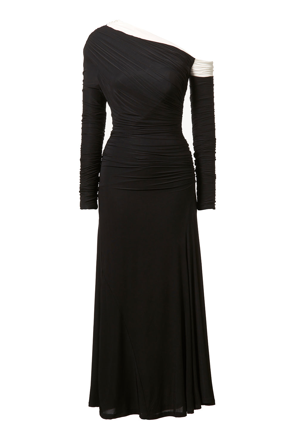 The Ulla Dress with its striking asymmetric neckline is the ultimate statement dress. With a contrast white underlining that features at the neck and hem and crafted in a luxurious Italian jersey, this is a modern take on elevated evening wear.