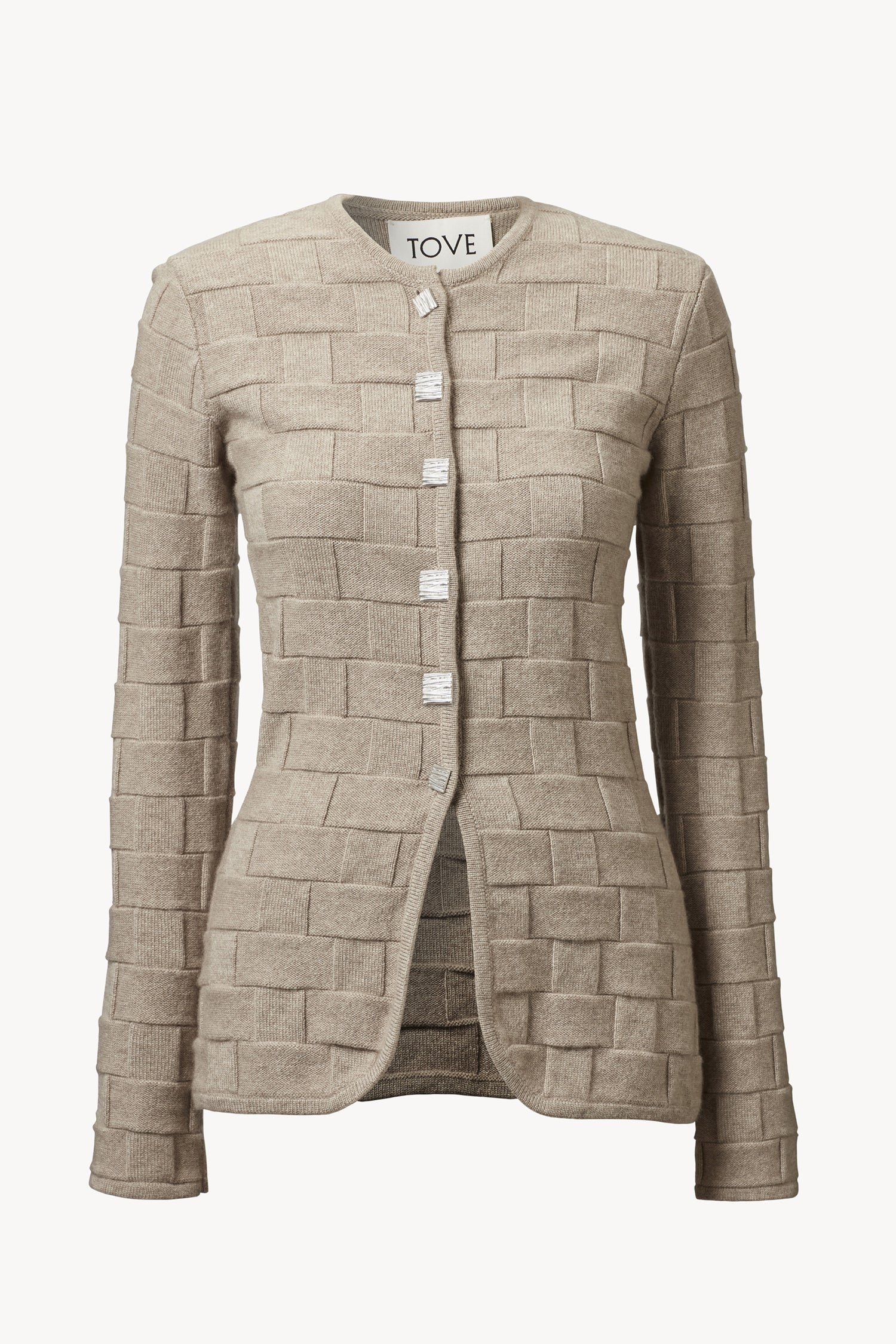 The Uma Jacket is a timeless day to evening piece. Crafted from cashmere with a textural basket weave design and featuring a delicate lustre, this knitted jacket is a piece to return to season after season. Conceived with a slim fit in the body and sleeves for a minimal refined look and featuring a gentle rounded neckline, the Uma Knitted Jacket is finished with our signature textural squared silver buttons along the centre front, to create an elevated finish.