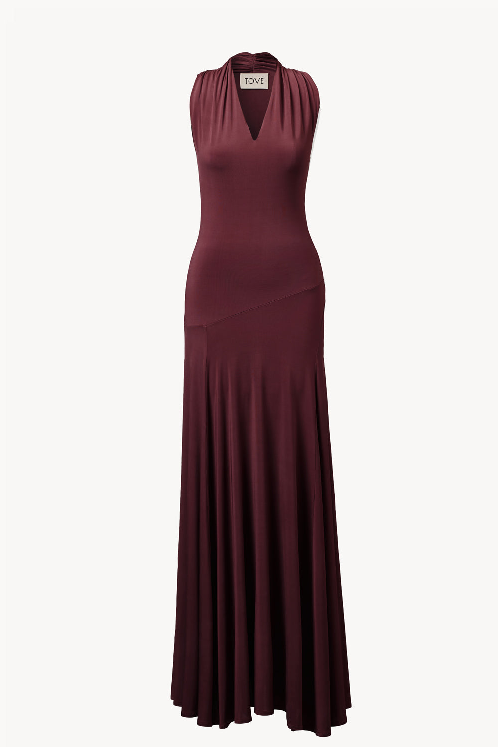 The Vina Dress Damson is crafted in crepe viscose jersey with subtle stretch from our Italian mill. Featuring a deep v neckline with delicate gathers at the neck a dramatic sweeping hemline.