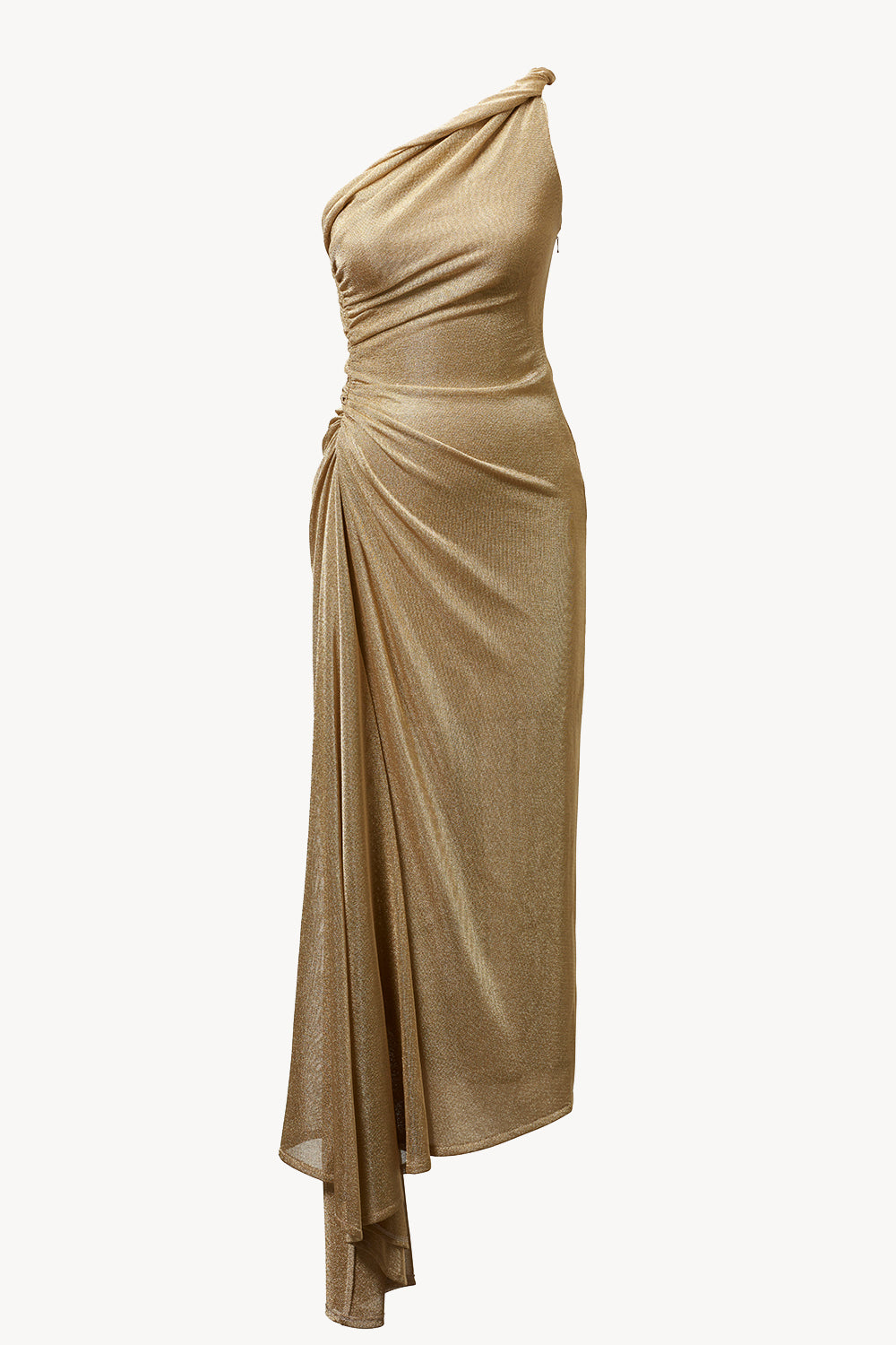 The Vivien Dress is crafted in a soft, knitted gold lurex yarn with beautiful lustre. The hand twisted one shoulder detail and delicate gathers across the body are finished with an asymmetric hemline. A thoughtful timeless design for making an entrance at any evening occasion.