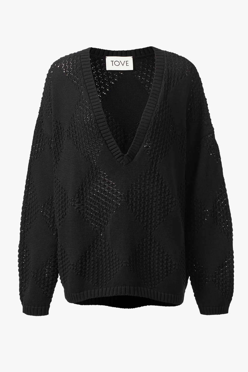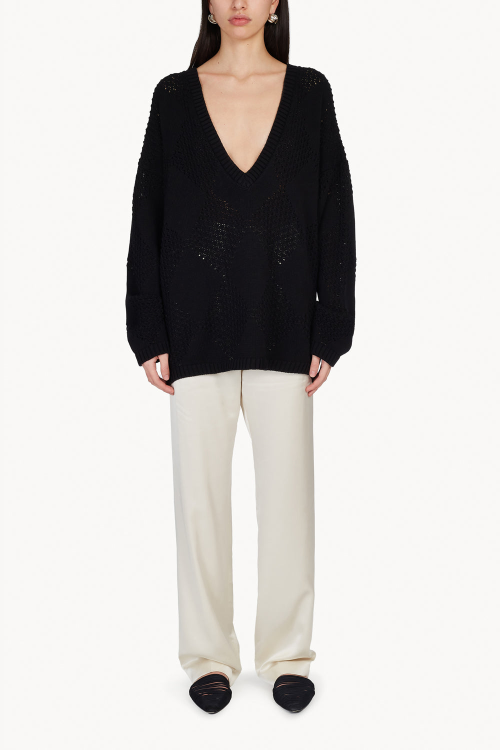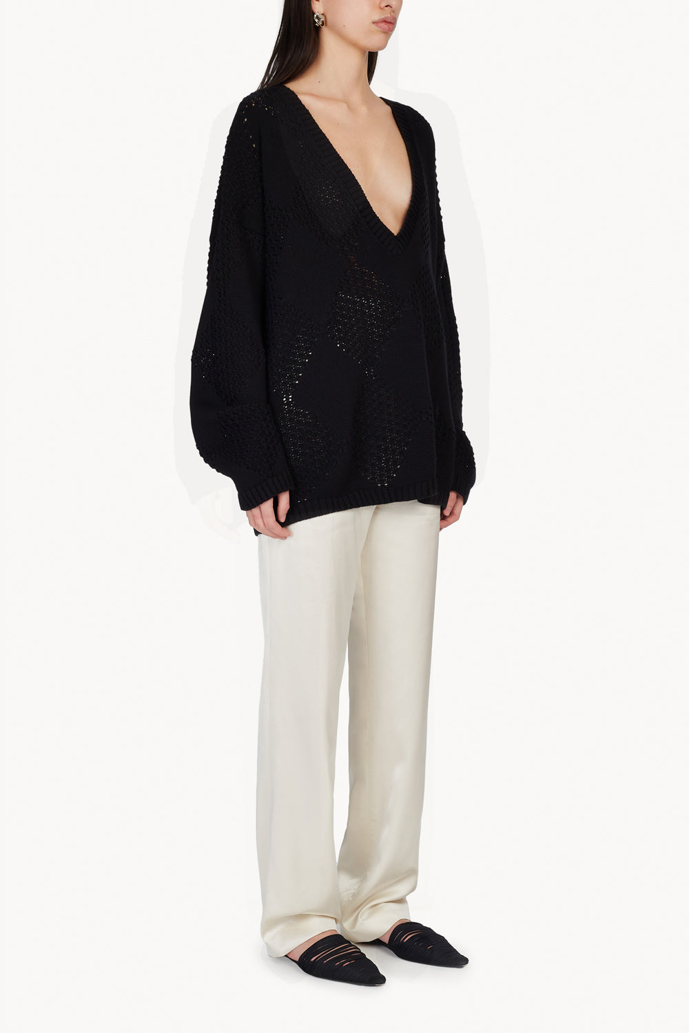 With its relaxed, elongated silhouette and a deep V-neckline, the Yara Knitted Jumper features a drop armhole and a large scale open texture design. Made in a 100% cotton yarn. The Yara Knitted Jumper is the perfect day to evening piece.
