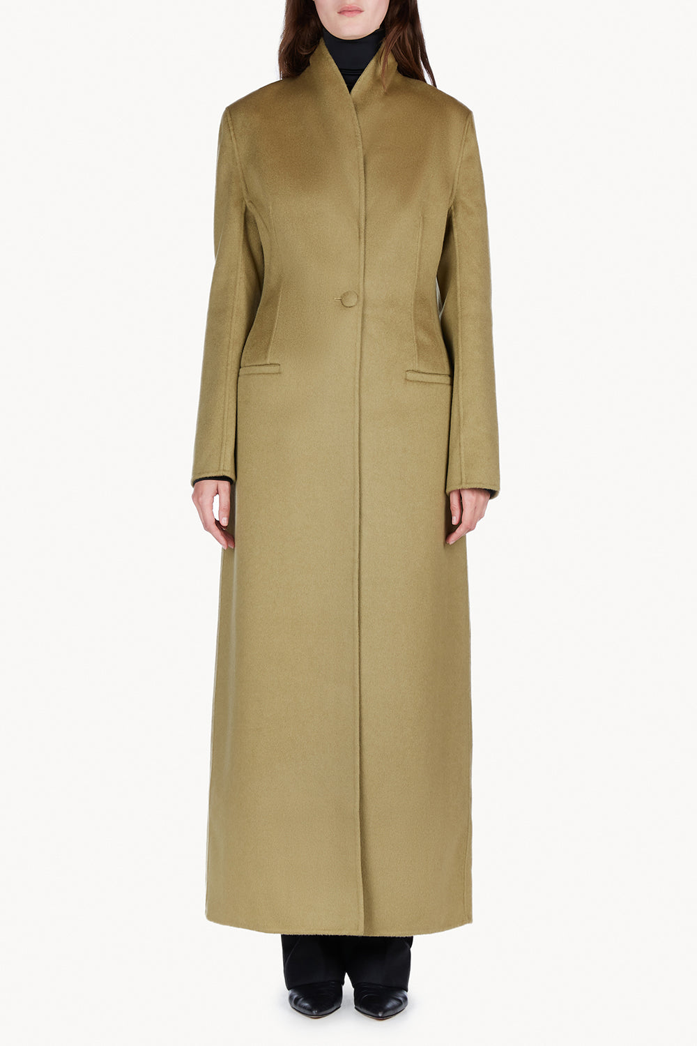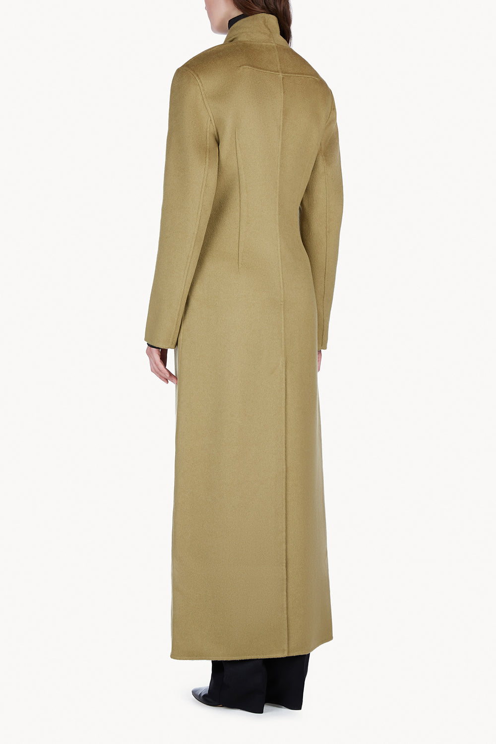 The Zahra Coat embodies refined luxury. Crafted from a sumptuous cashmere and lambswool blend and featuring a sleek long-line silhouette designed to elongate the frame. The Zahra Coat’s tailored proportions and contoured fit make this a timeless piece for day to evening wear. Secured by a singular button at the waist, featuring a minimal shawl collar that can be worn up or down and a centre back split at the hemline for easy movement, the Zahra Coat is a future classic.